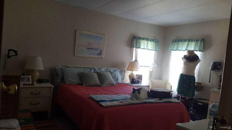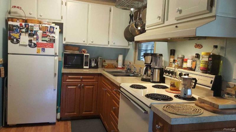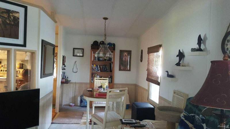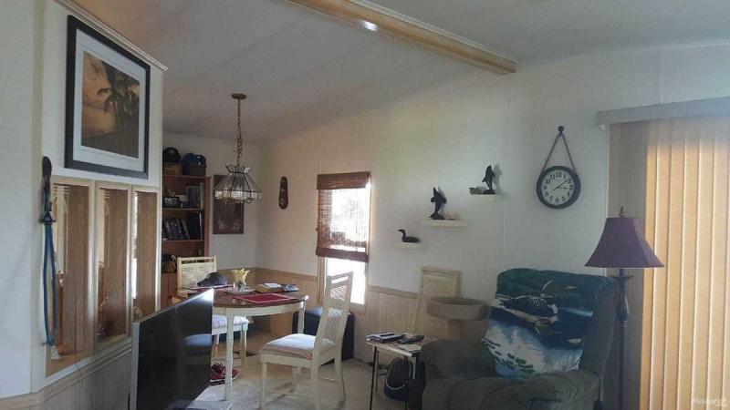 The kitchen has a cozy built in table with two chairs for casual dining. Lots of cupboards and drawers and a large pantry provide plenty of storage. A small wall divides the kitchen from the dining room and living room. The high vaulted ceilings provide for open spacious feeling. Living room opens up to the front screened lanai through the double sliding glass doors. Down the hall is the master bedroom with a large walk in closet and private master bathroom with vanity and glass enclosed shower. Guest bedroom is right next to the master bedroom. The main/guest bathroom has an updated vanity and large ceramic tiled shower.