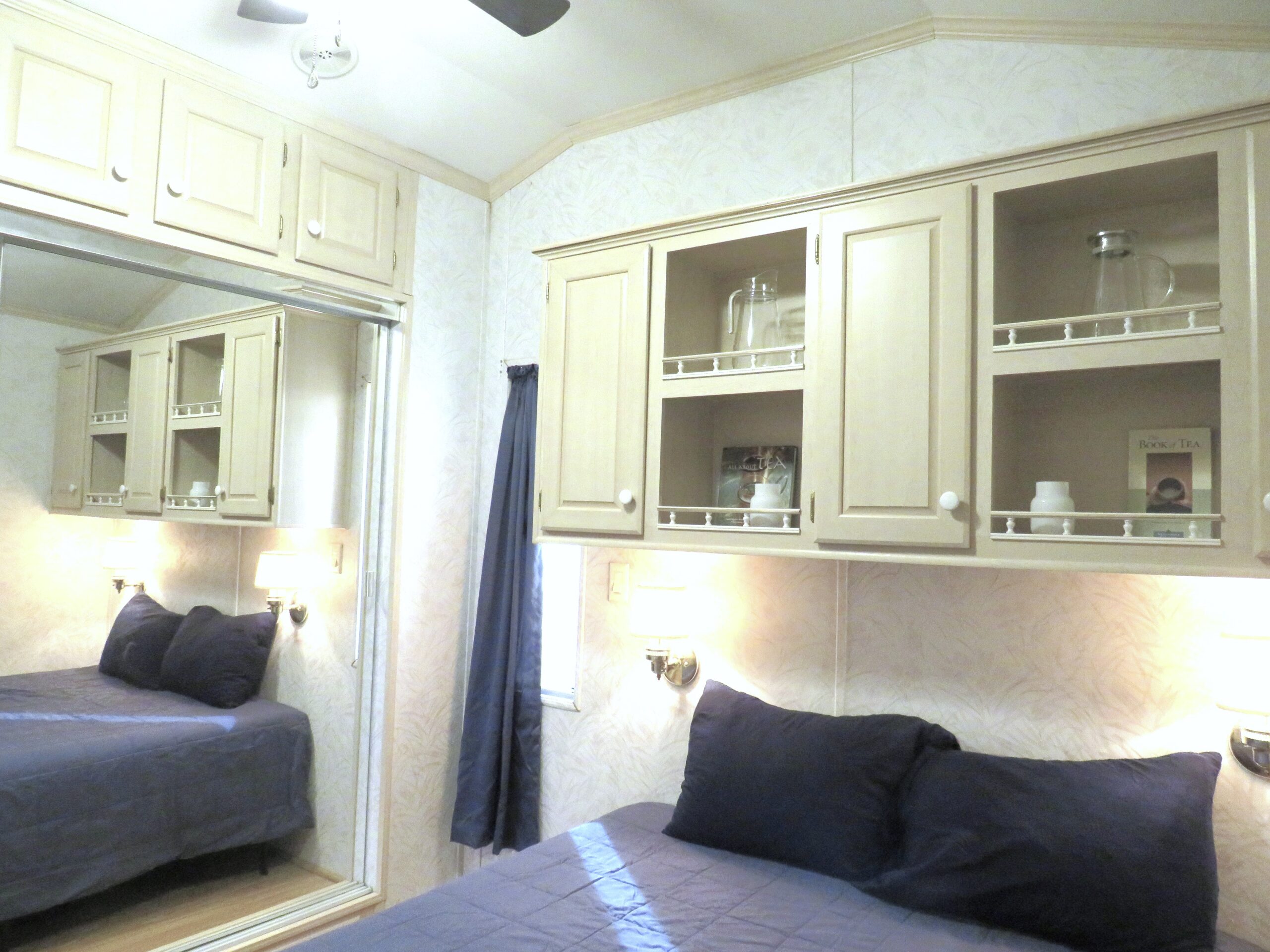 - Queen Bed w/Mirror Closet & Built in Dresser & Upper Cabinets