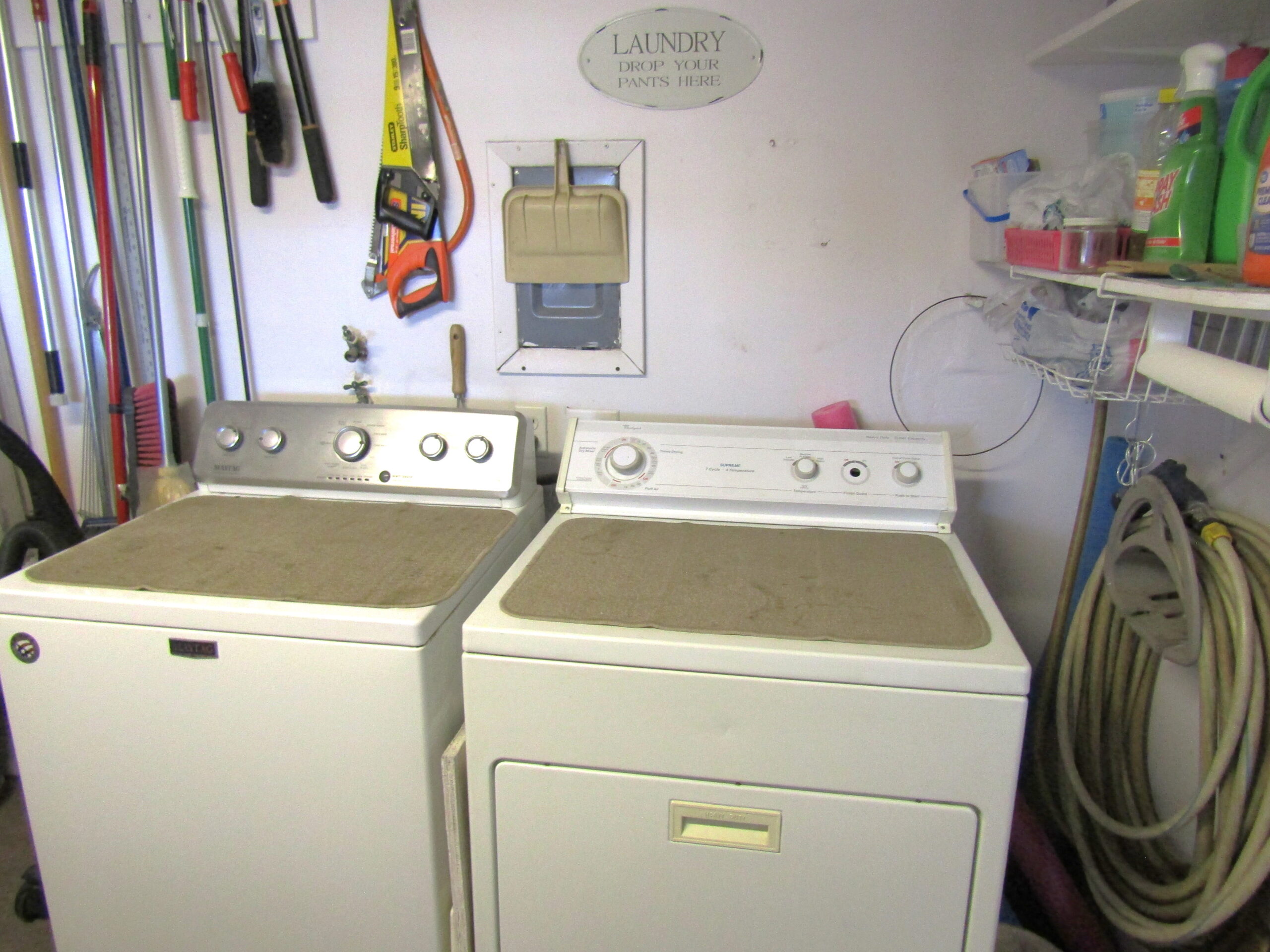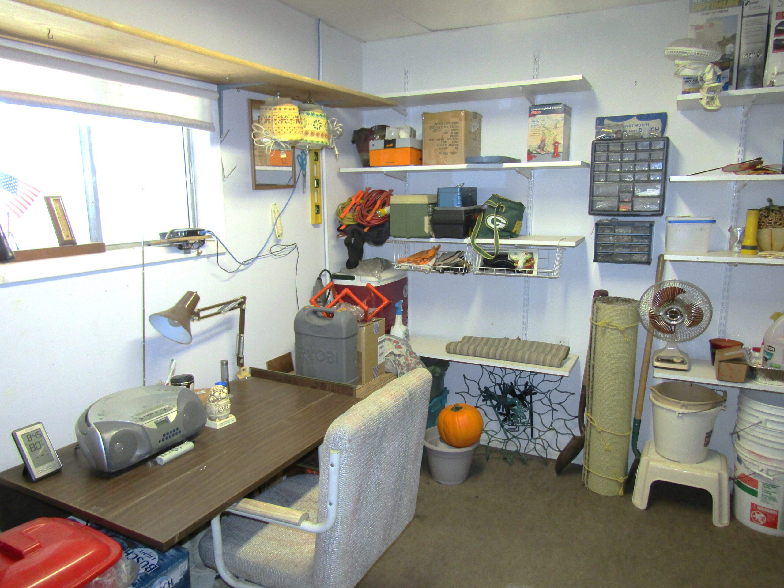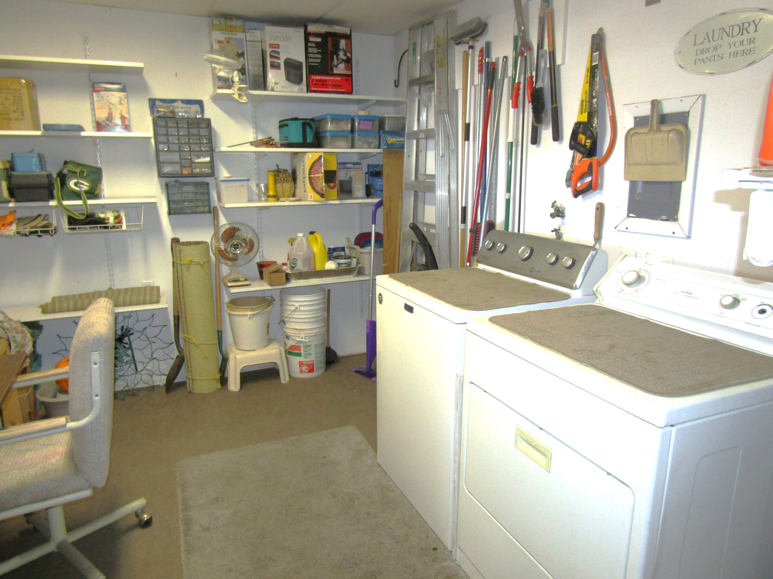 - Carpeted Finished Shed w/Full-Size Laundry, Shelving & Desk Area,