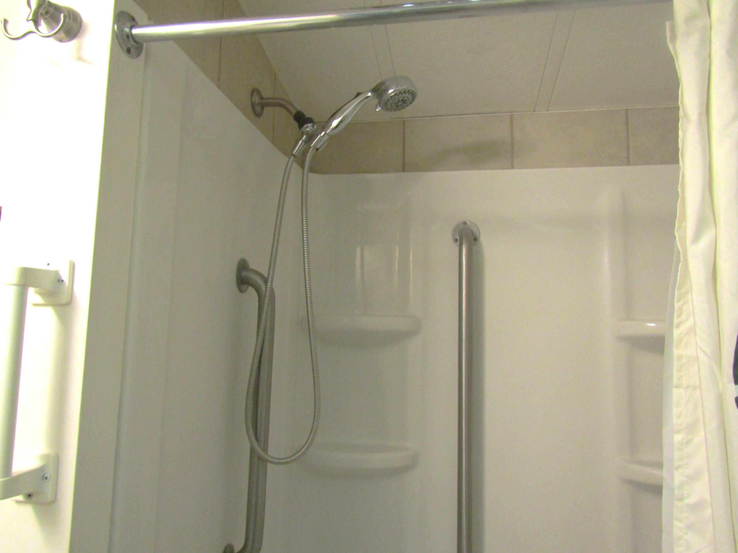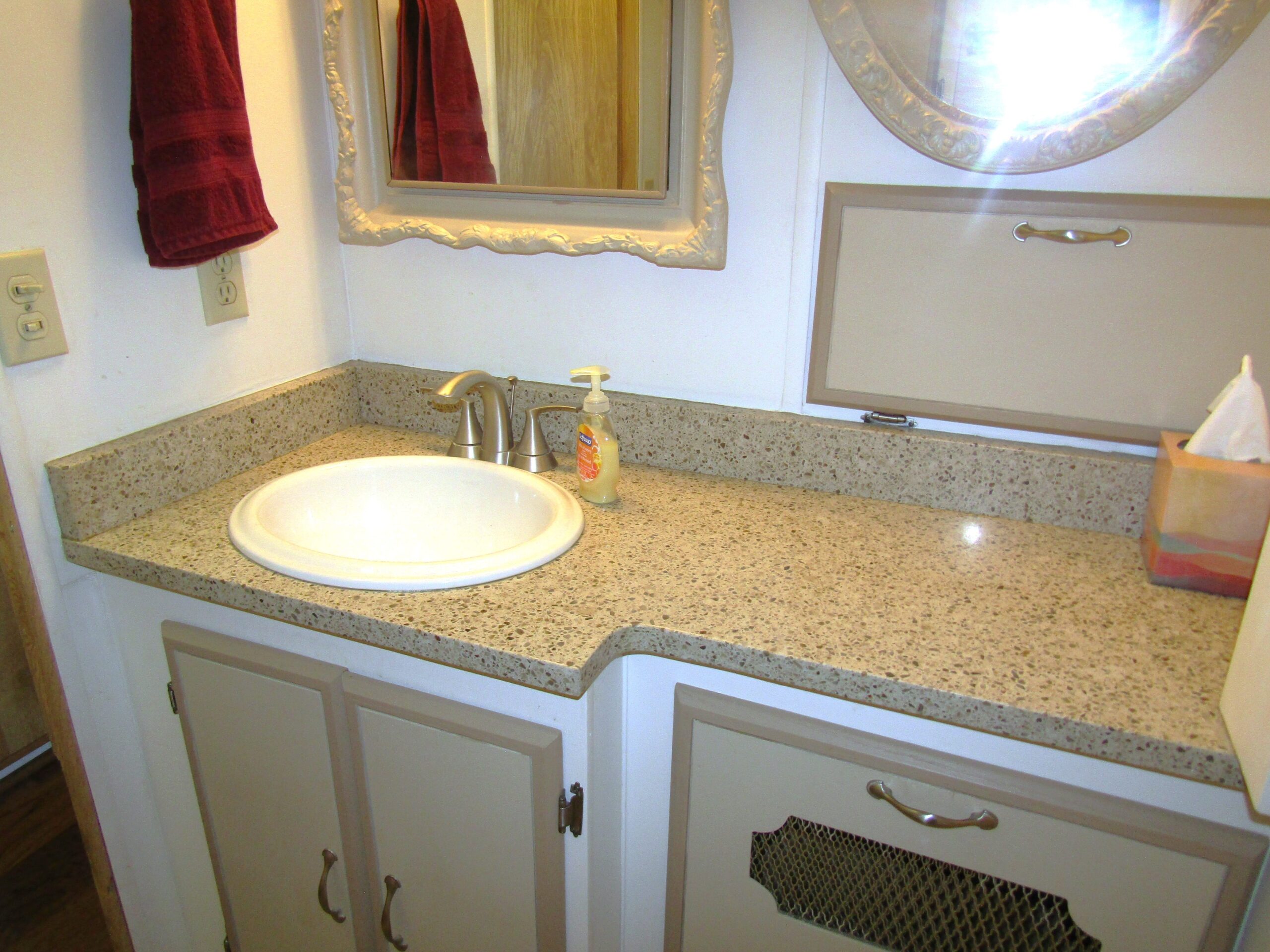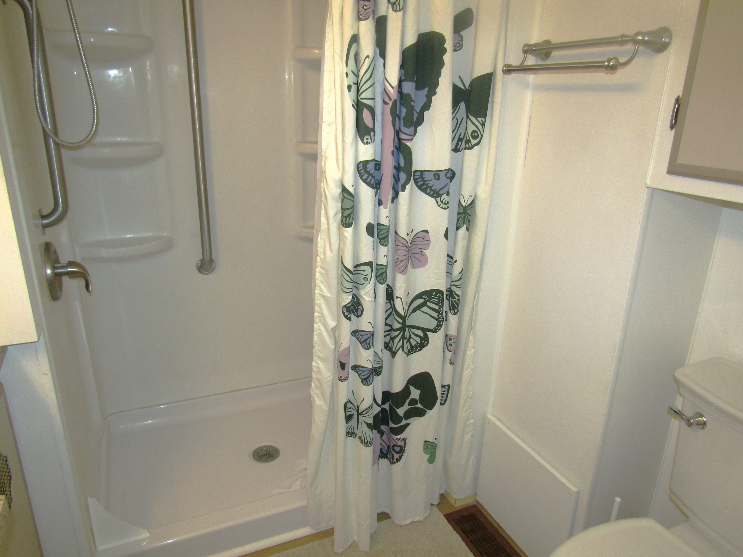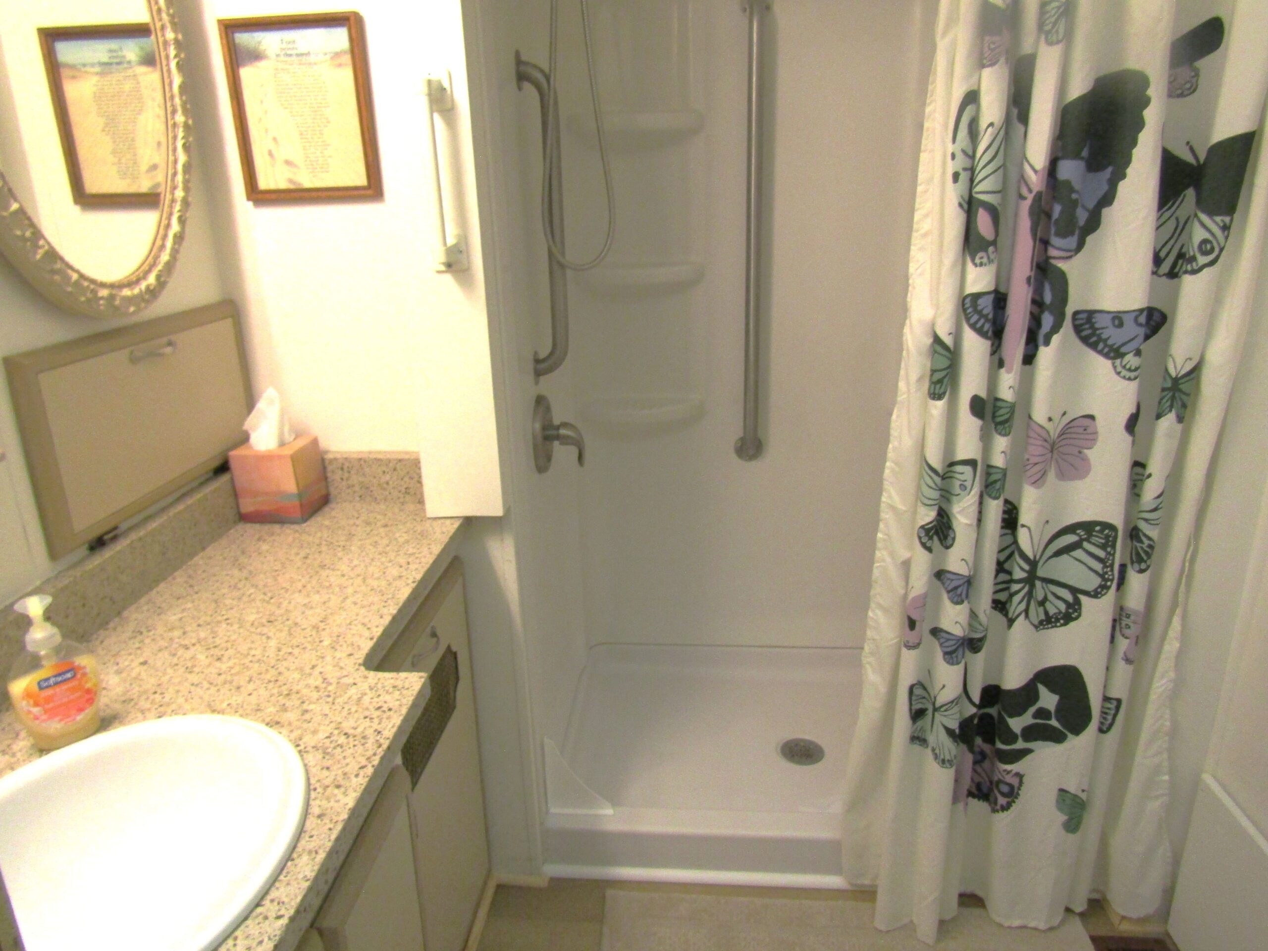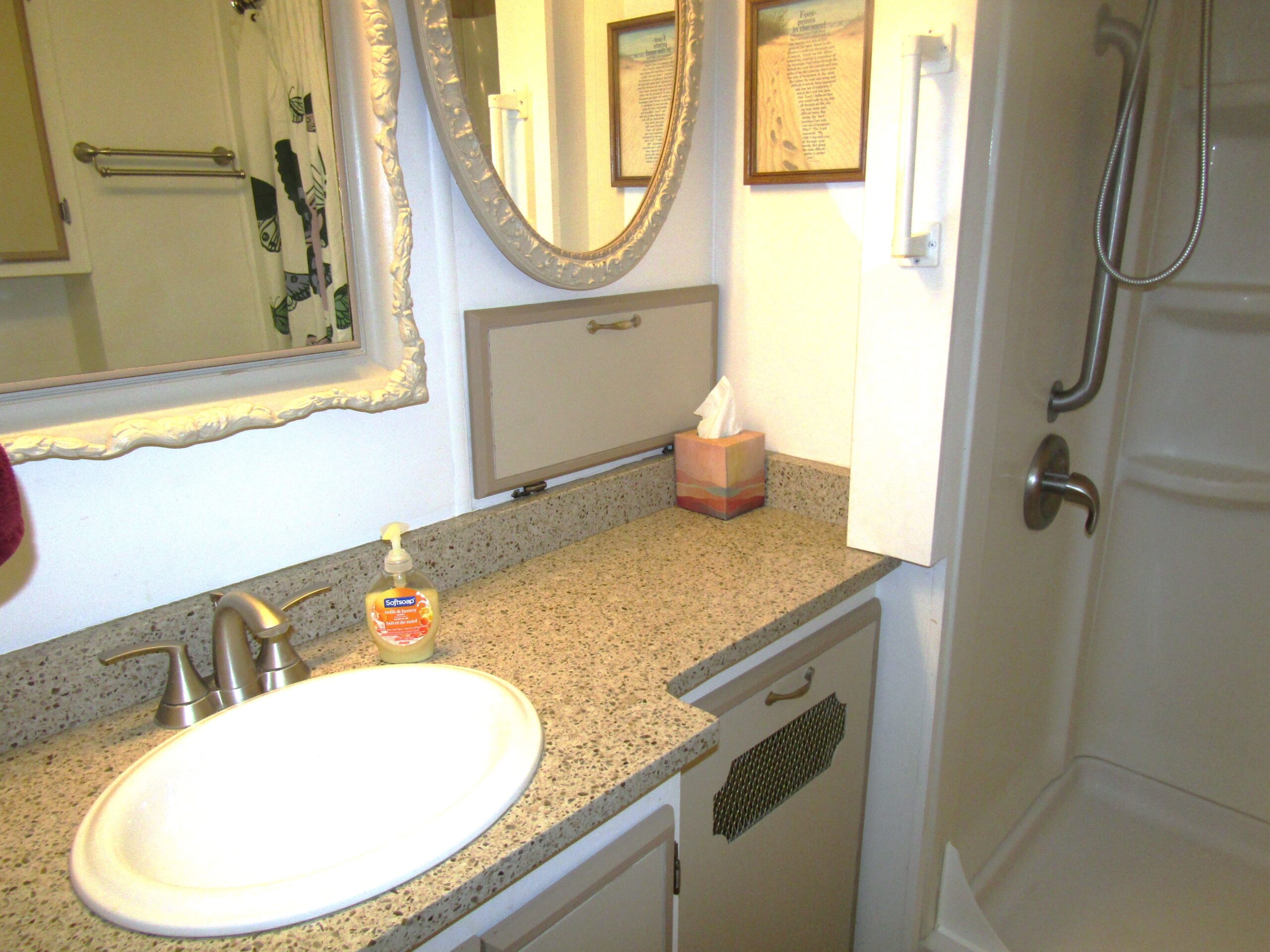 • Bathroom w/New Step-In Shower, Built-In Cabinet, Large Vanity, Updated Counter/Sink/Faucet, & New Laminate Floor