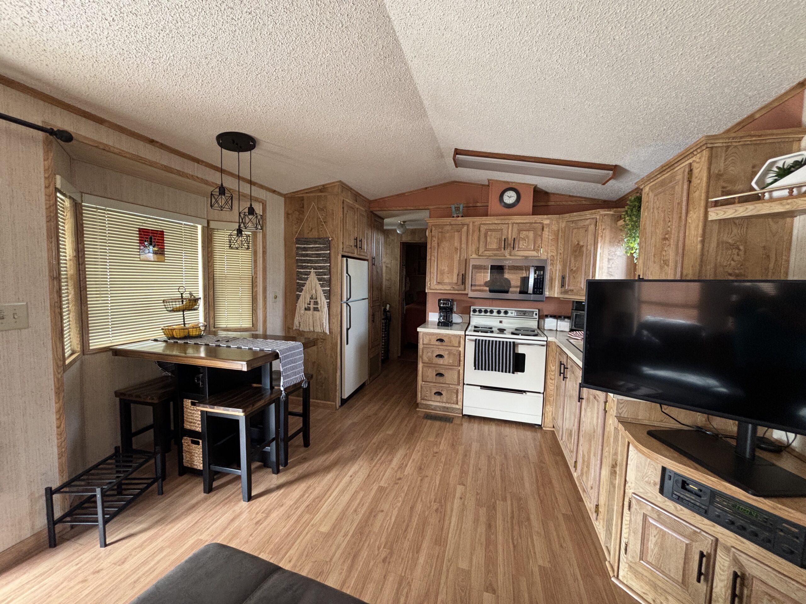 • Open Kitchen w/Side Dining Bay, Built-In Microwave, Formica Counters, Backsplash, & Pantry