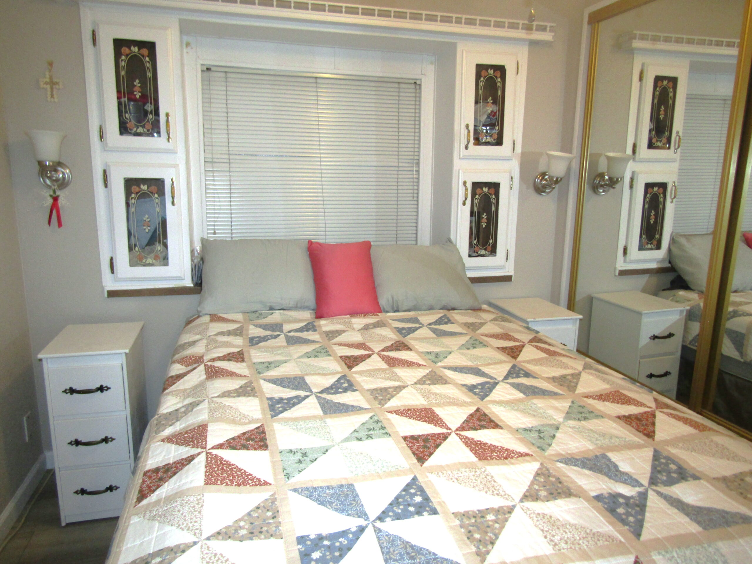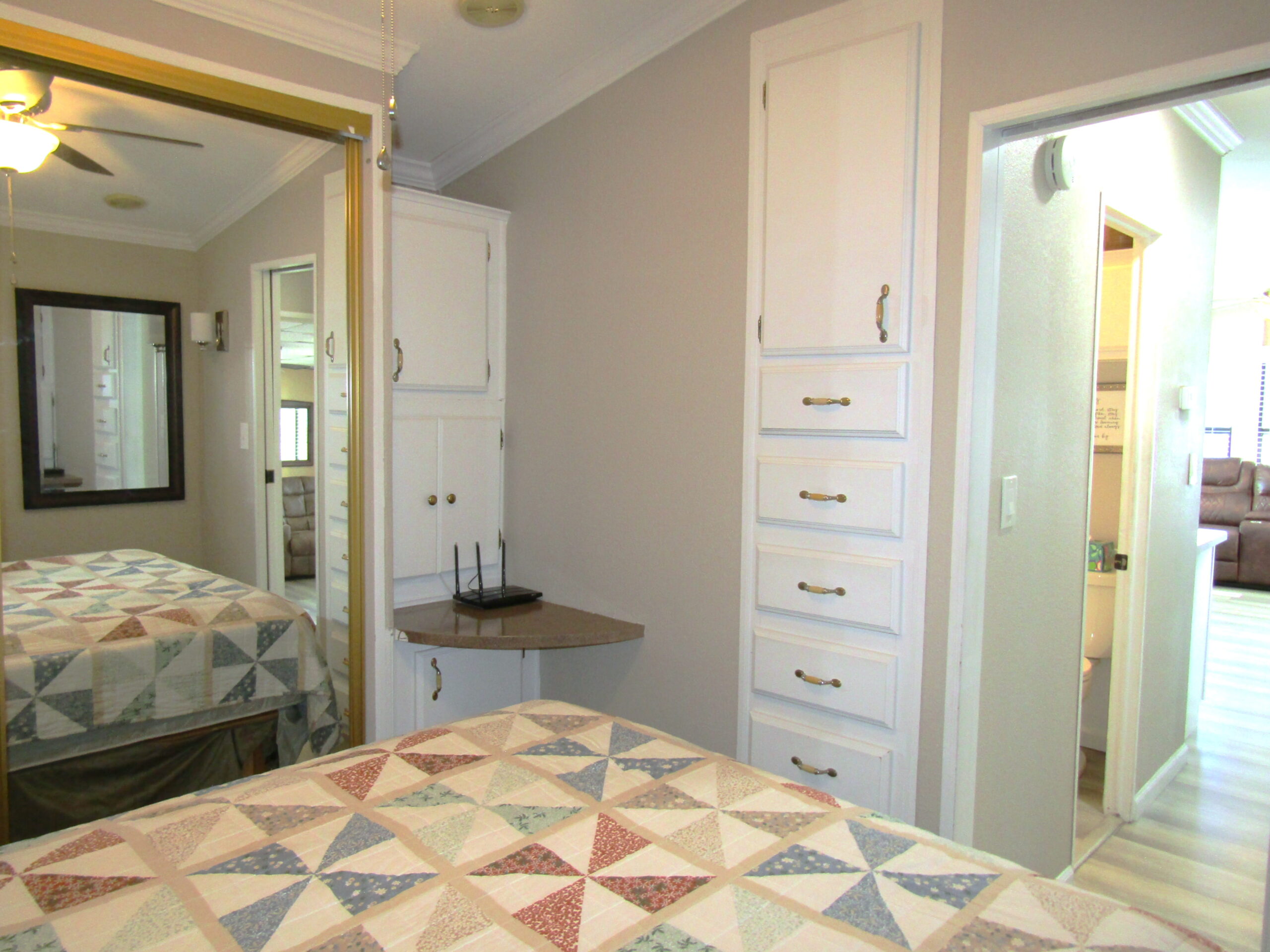 • Queen Bedroom Lift-N-Store Bed w/Mirrored Closet, Built-In Dresser, & Upper Cabinets