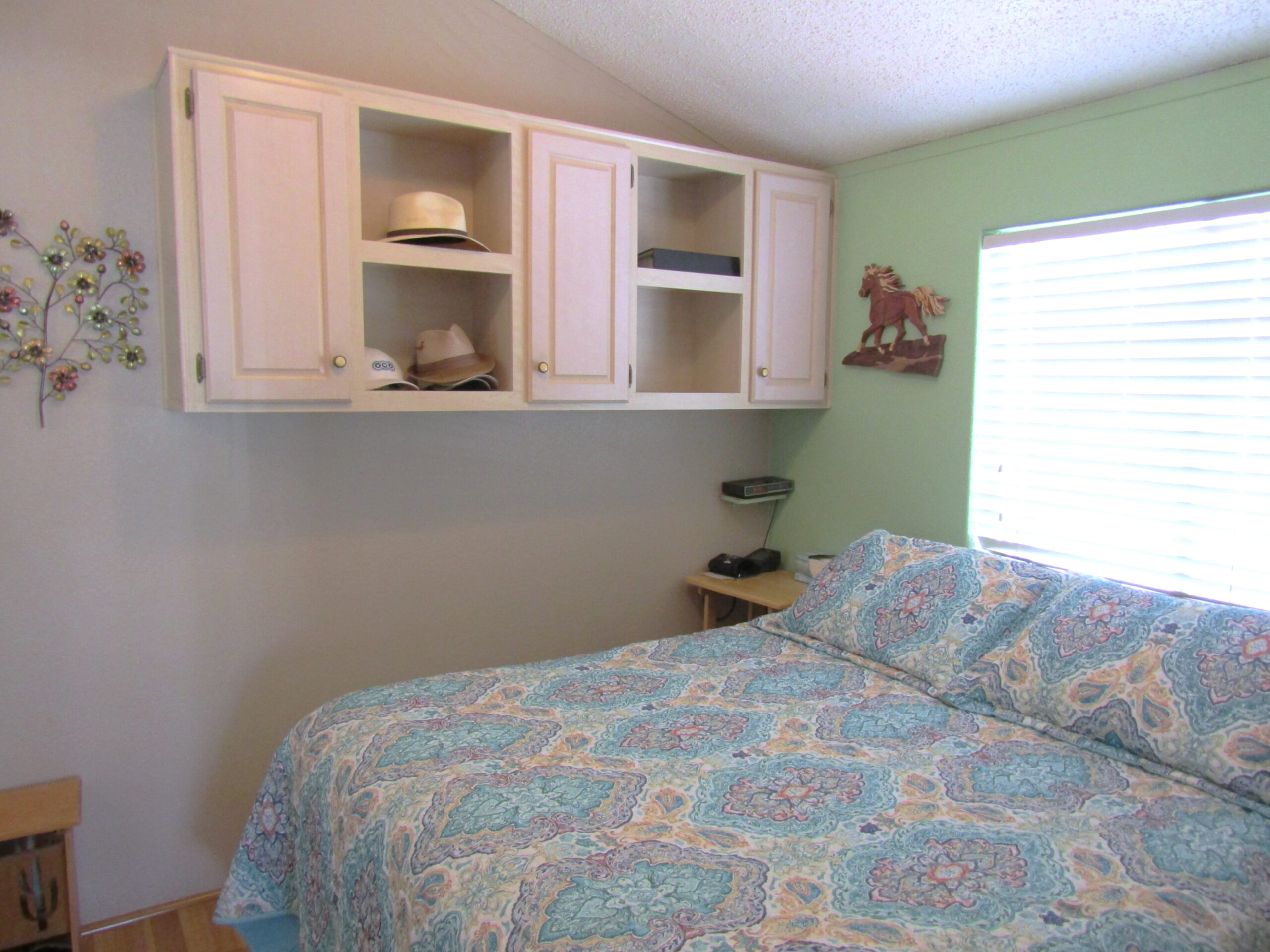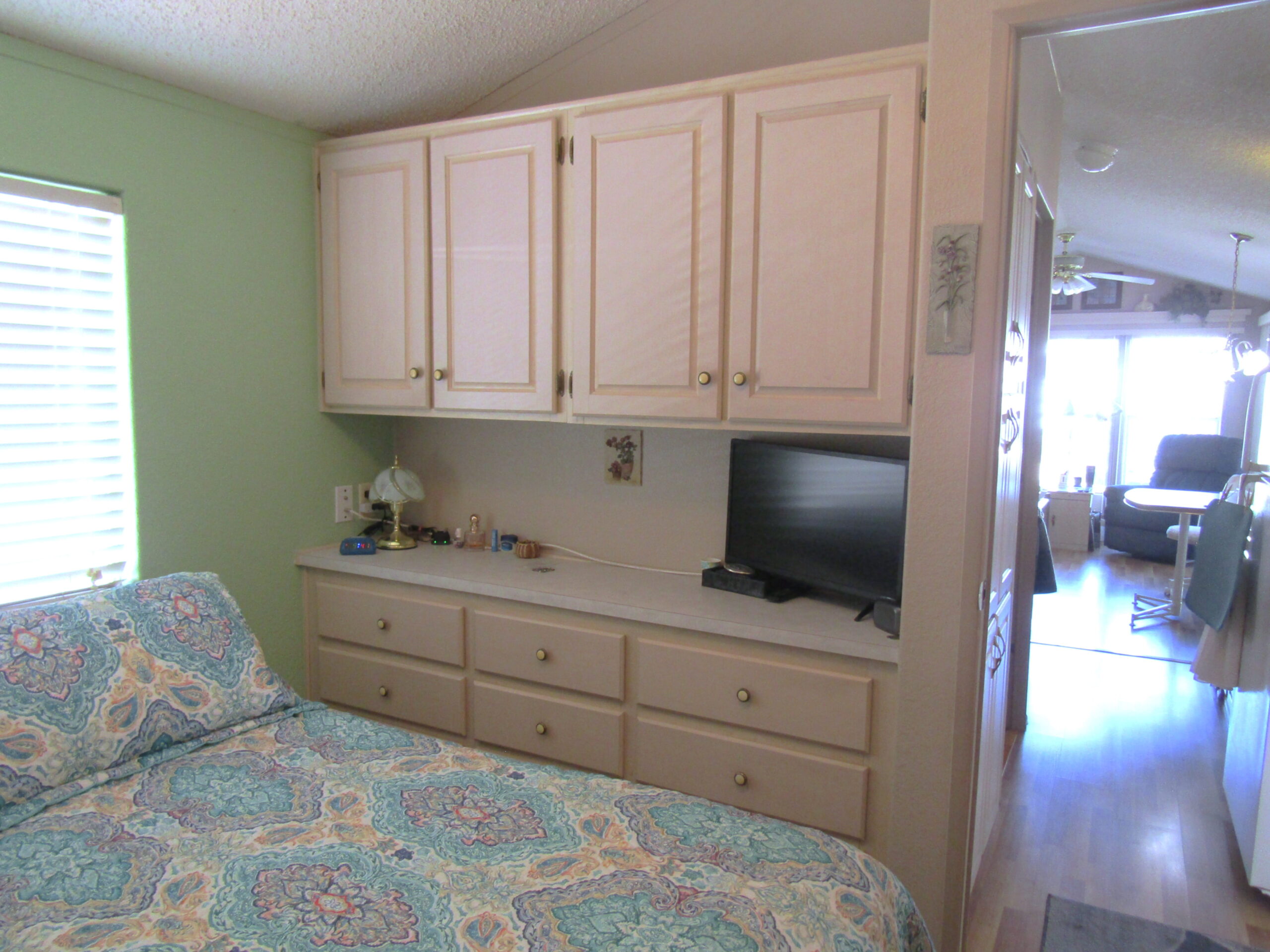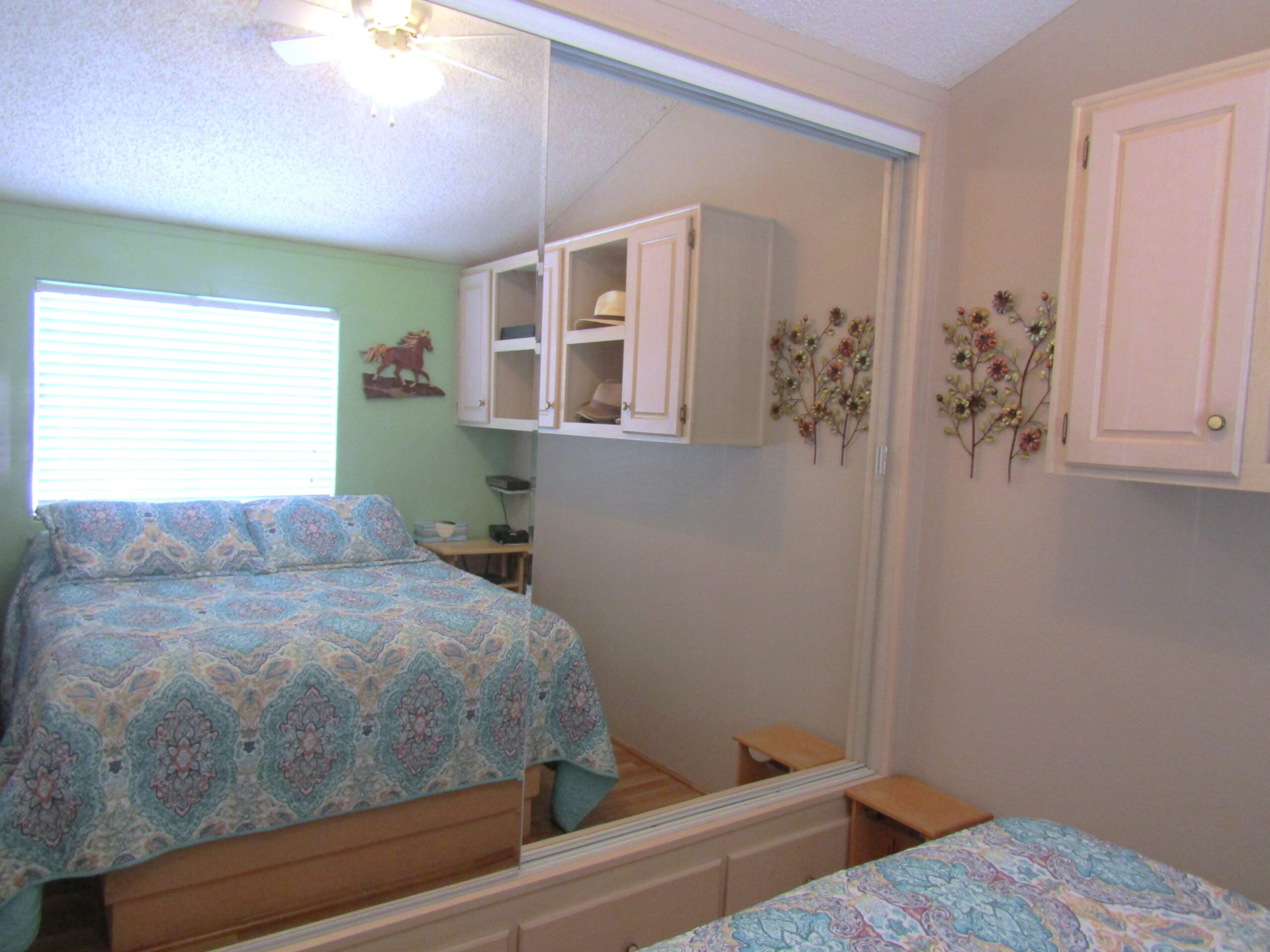 - Queen Bedroom Lift-N-Store Bed w/Full Mirrored Closet, Built-In Dresser, Upper Cabinets & Counters