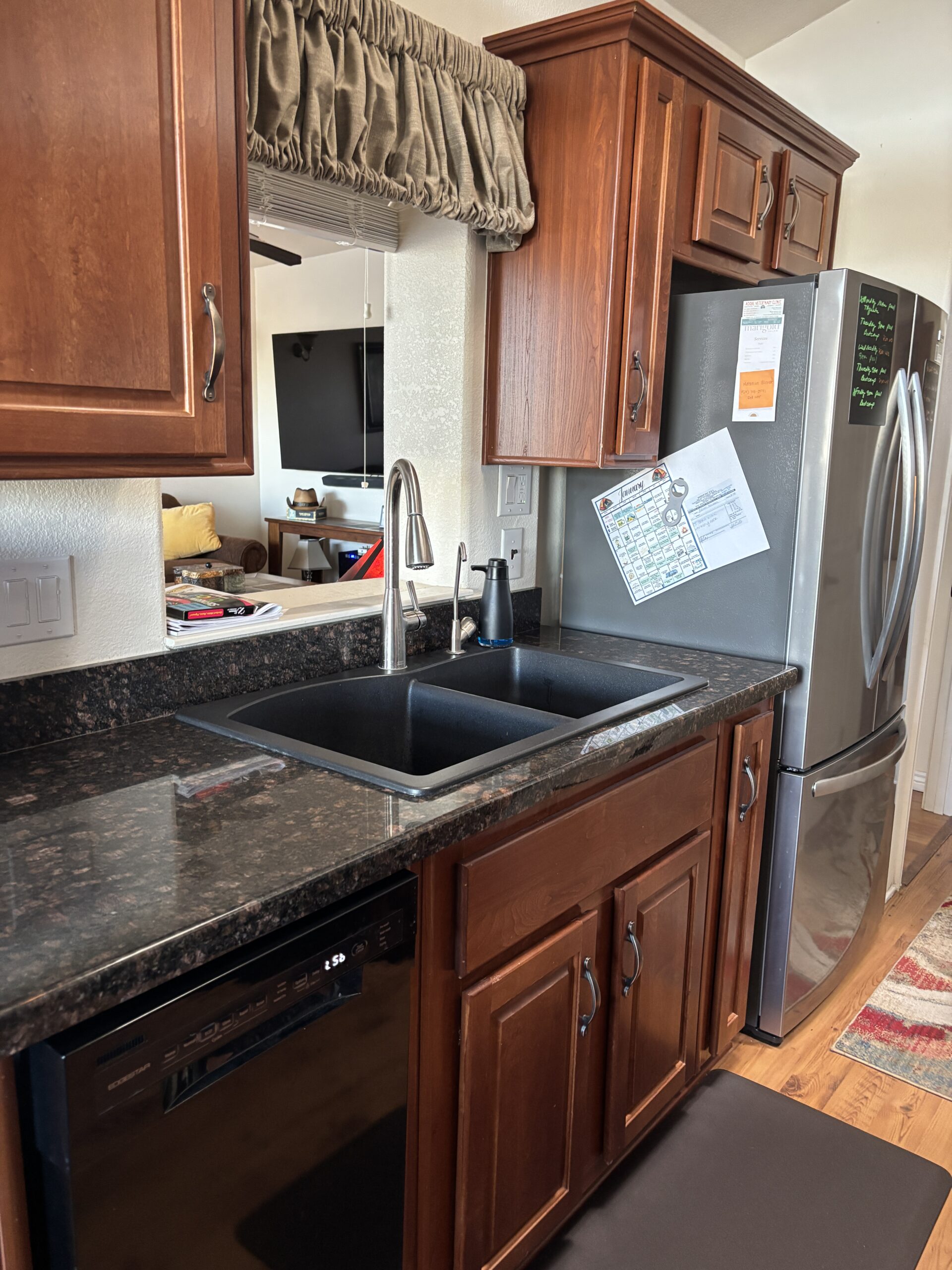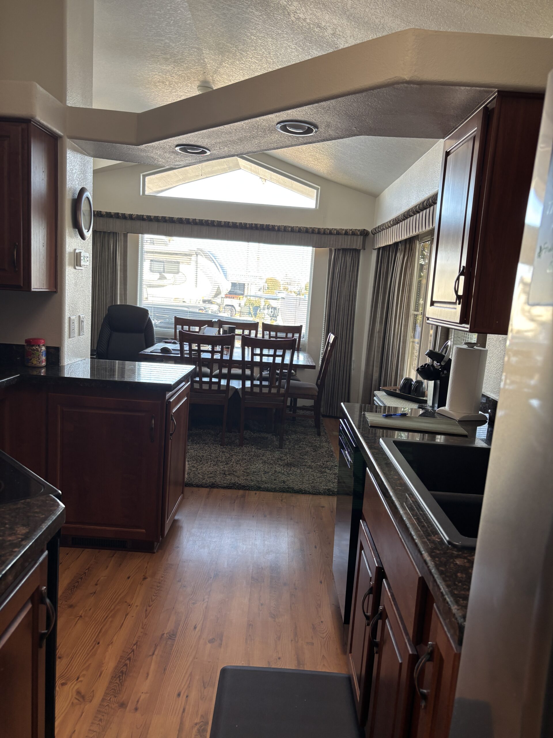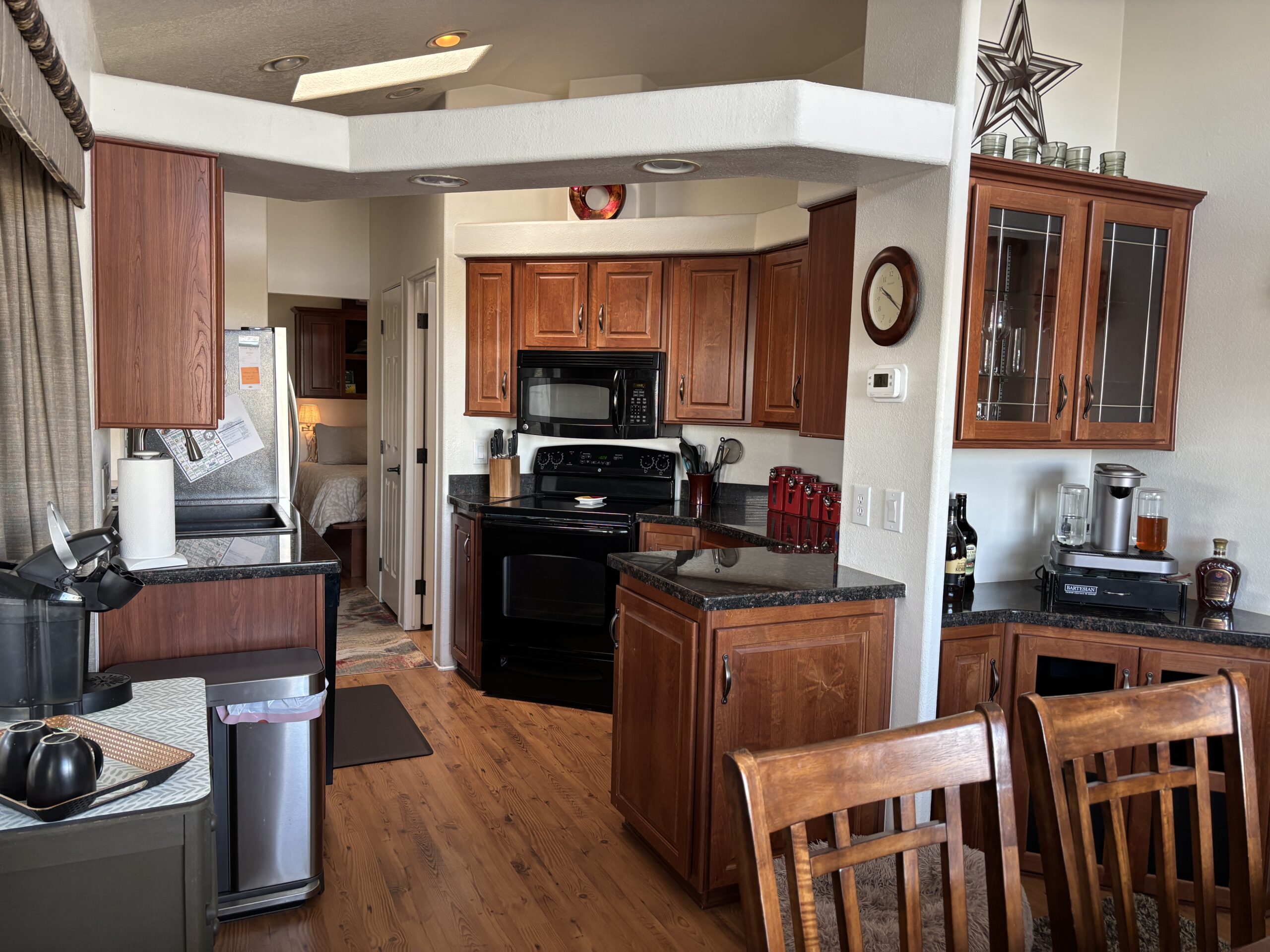 • Full Front Kitchen w/ Skylights, Stainless Steel Appliances, Built-In Microwave, Glass-Top Stove, Dishwasher, Granite Counters, Garbage Disposal (2025), RO Water System, & Pantry