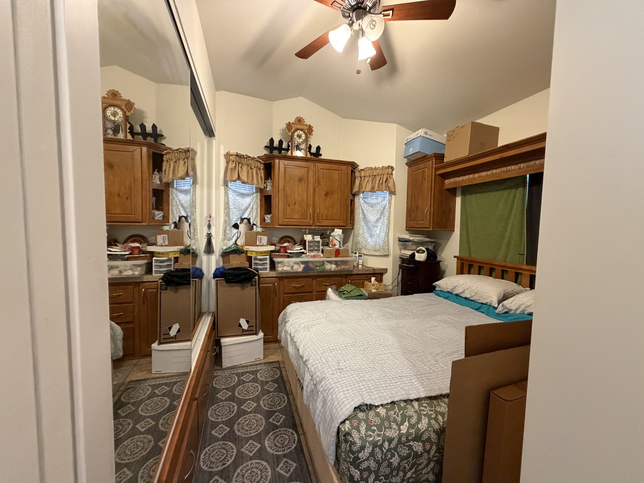 - Queen Bedroom w/Mirrored Closet Doors, Built-In Upper Cabinets, & Built-In Dresser