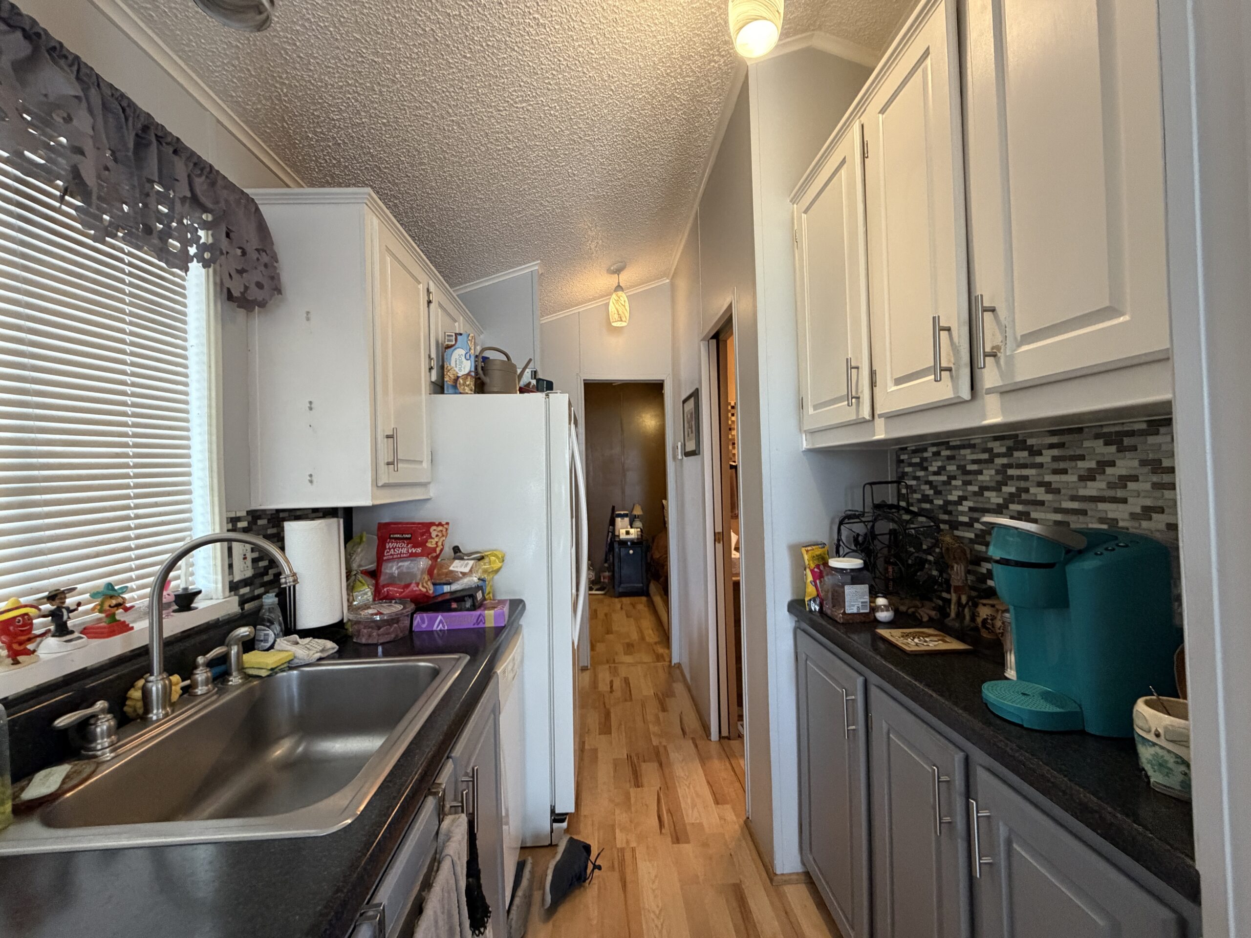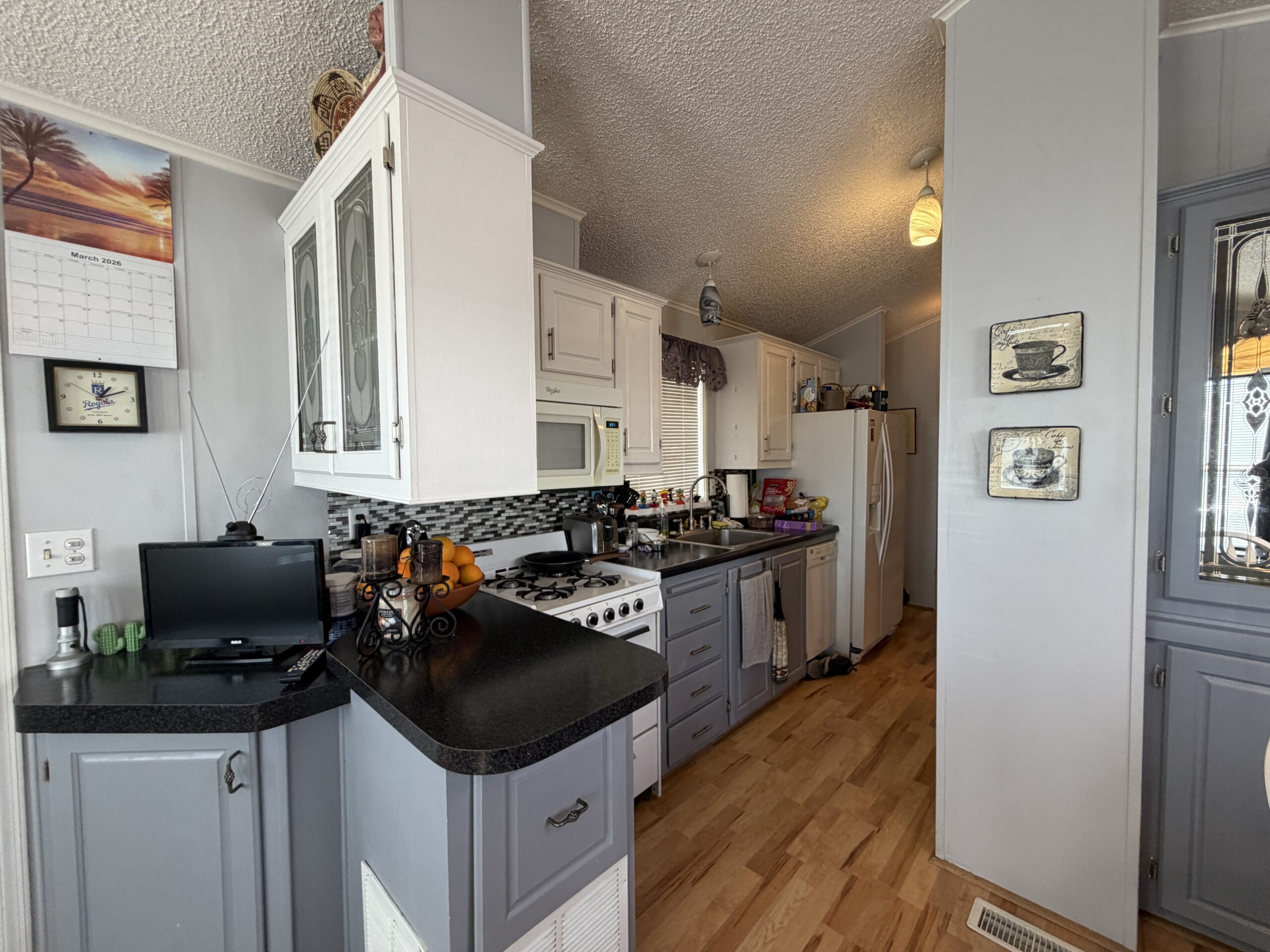 - Galley Kitchen w/White Appliances, Built-In Microwave, Dishwasher, Laminate Counters, Backsplash, Built-In China Cabinet, & Dining Bay
