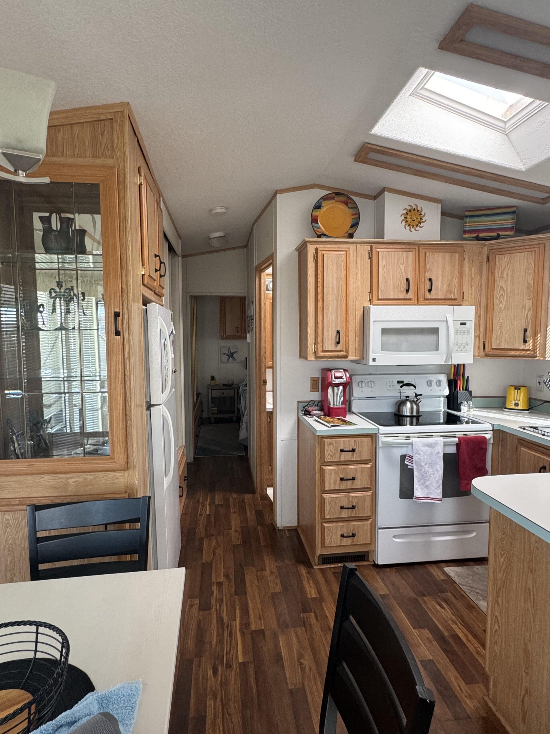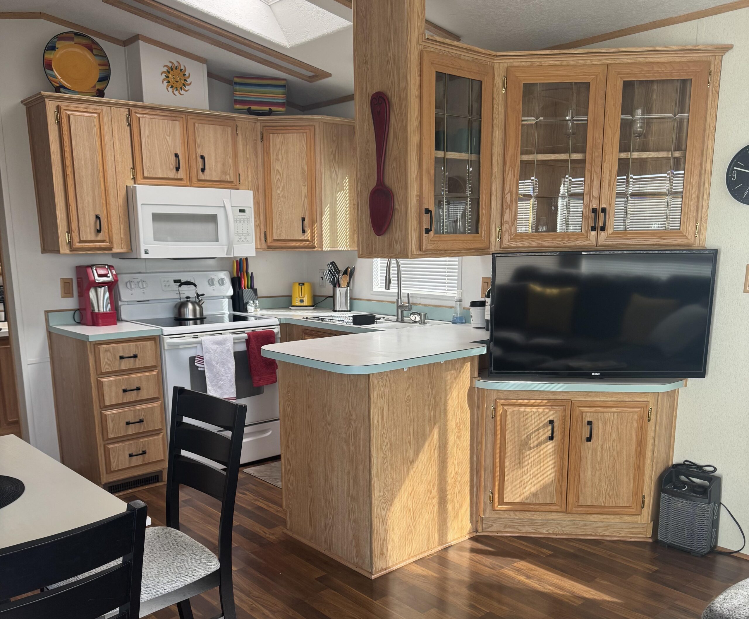 • U-Shaped Kitchen w/Skylights, White Appliances, Built-In Microwave, Glass-Top Stove, Formica Counters, & Pantry