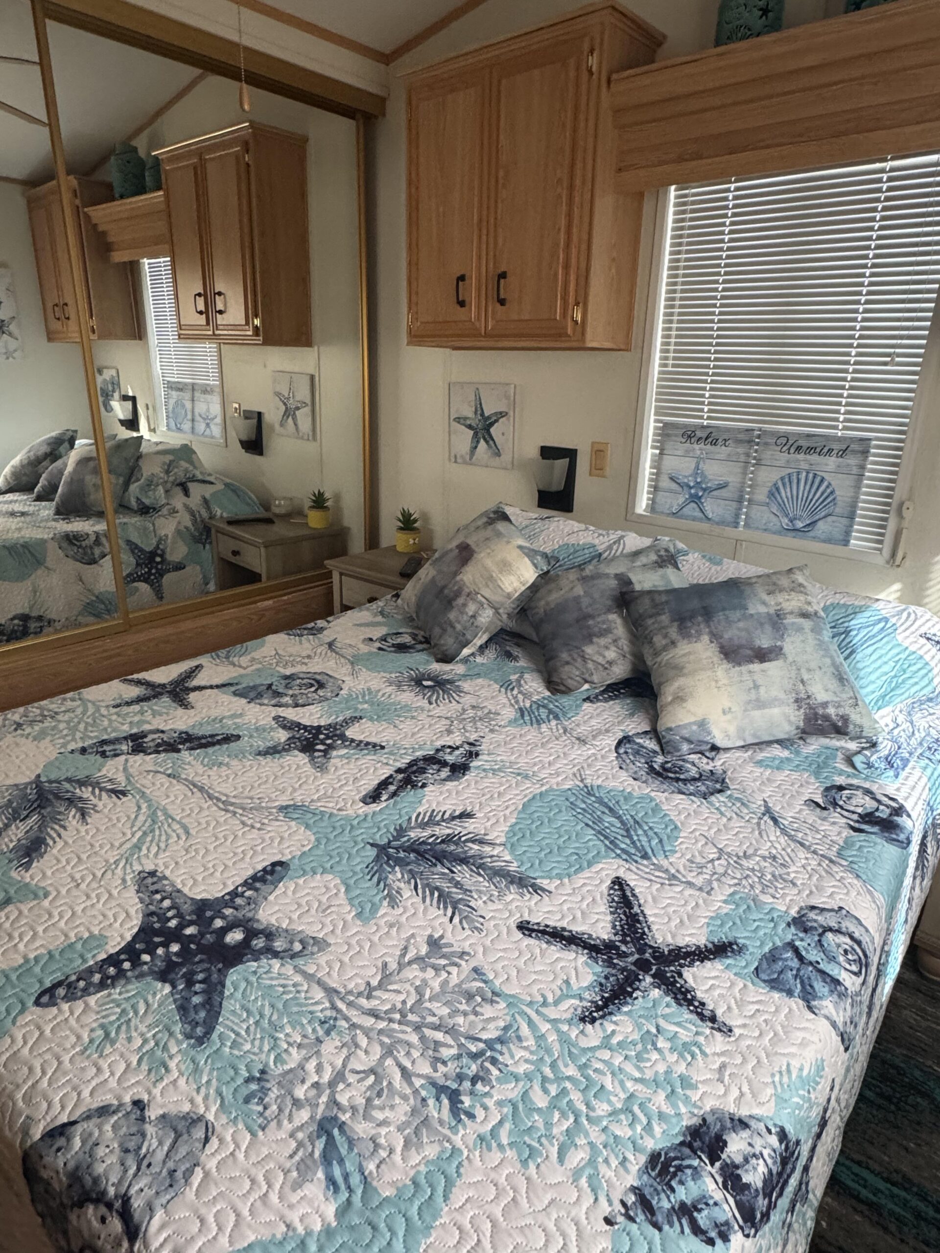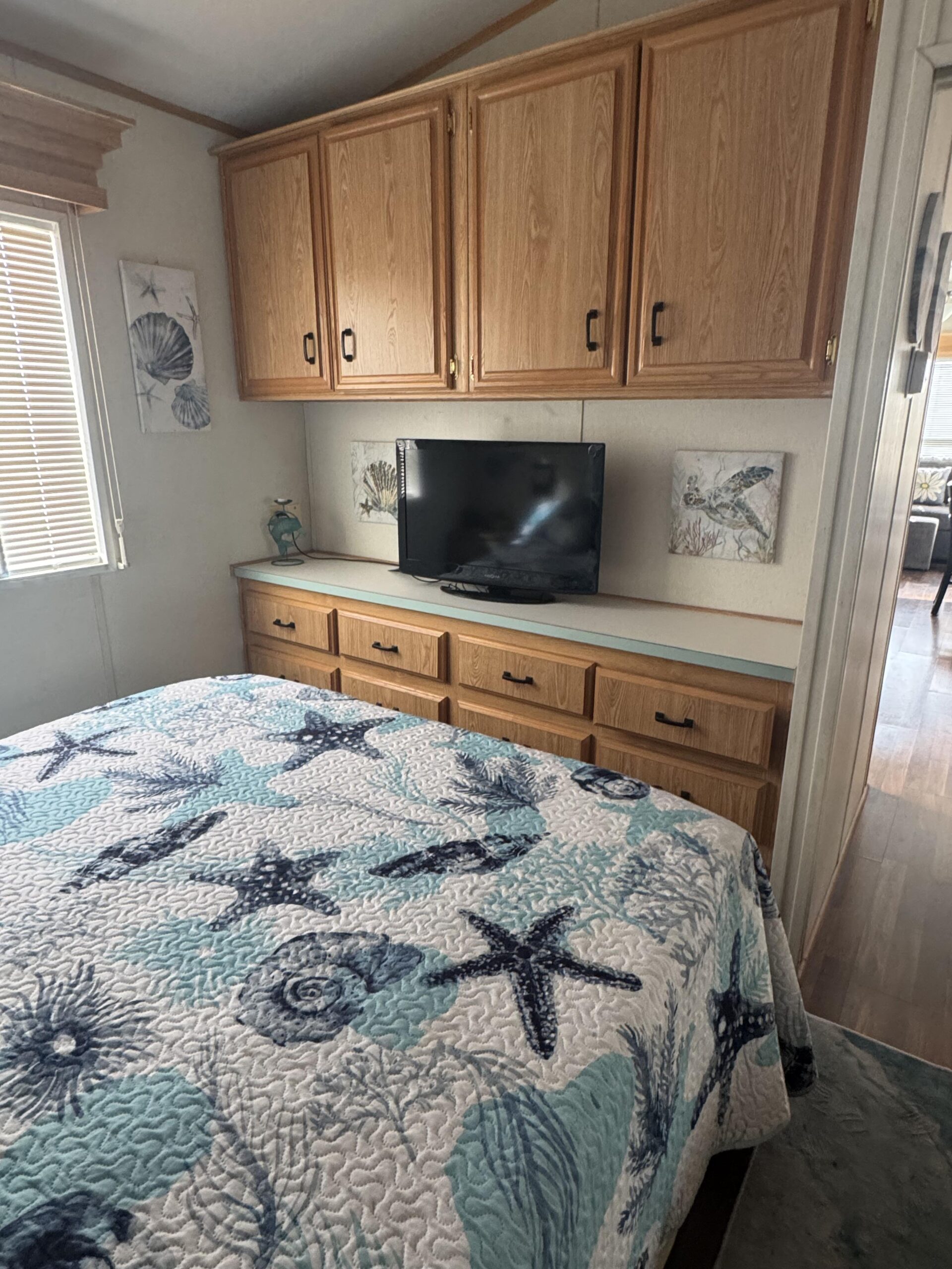 • Queen Bedroom w/Mirrored Closet Doors, Built-In Upper Cabinets, & Built-In Dresser