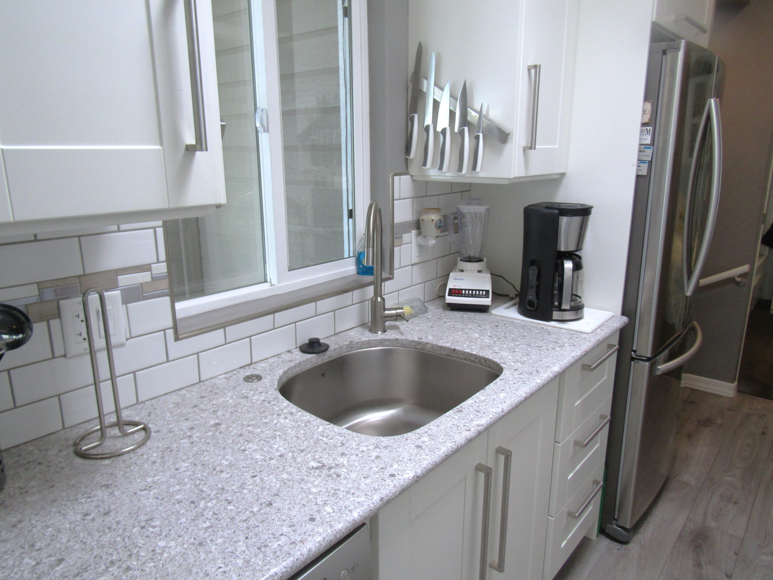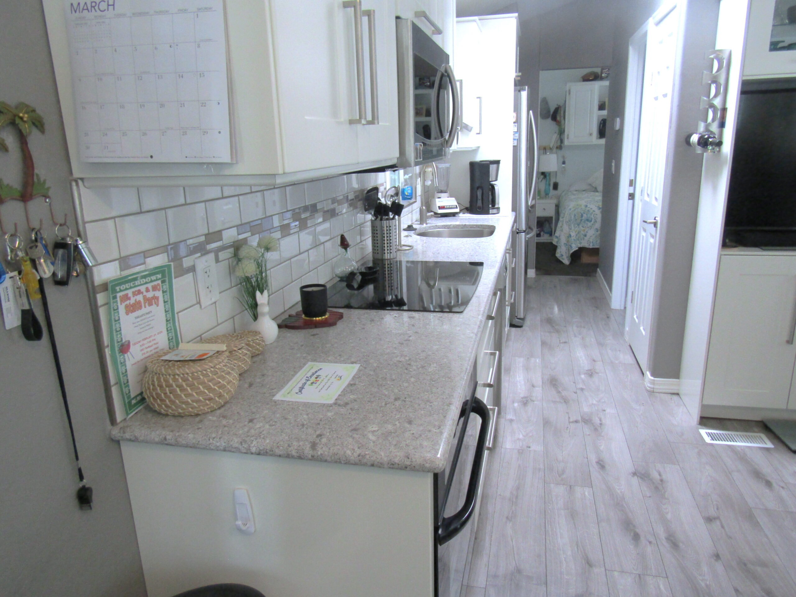 • Newer (2017) Galley Kitchen w/Newer Cabinets Including Lighted Drawers, New Appliances, SS Dishwasher, Deep SS Sink, Upgraded SS Fridge, Newer Laminate Floor, & Hall Pantry/Closet