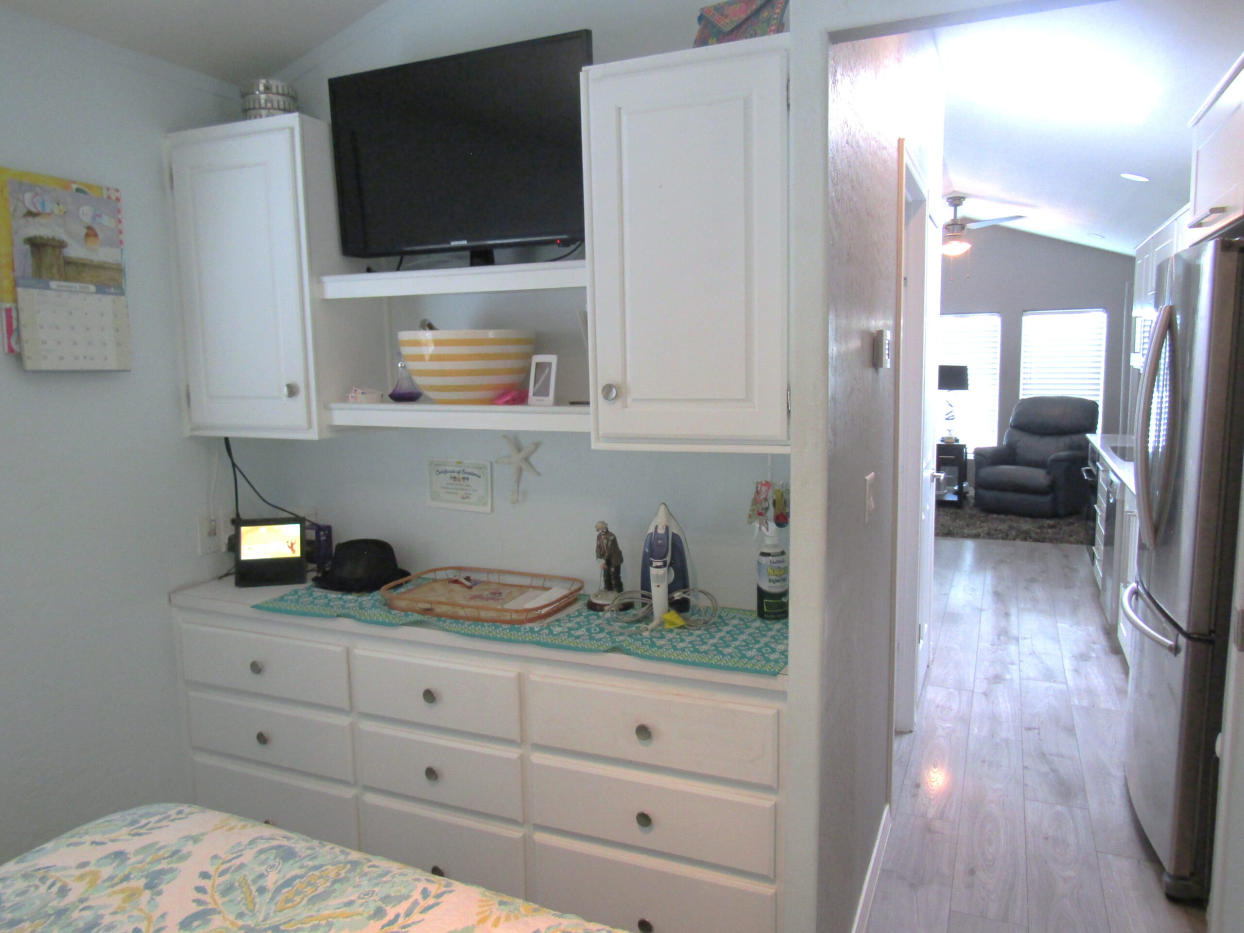 • Queen Bedroom w/Lift-N-Store Bed, Mirrored Closet, Built-In Dresser, & Upper Cabinets