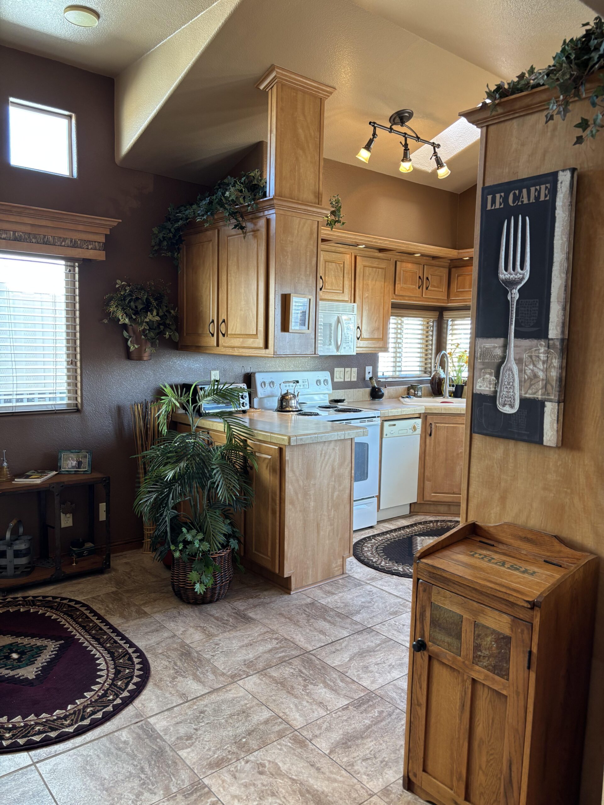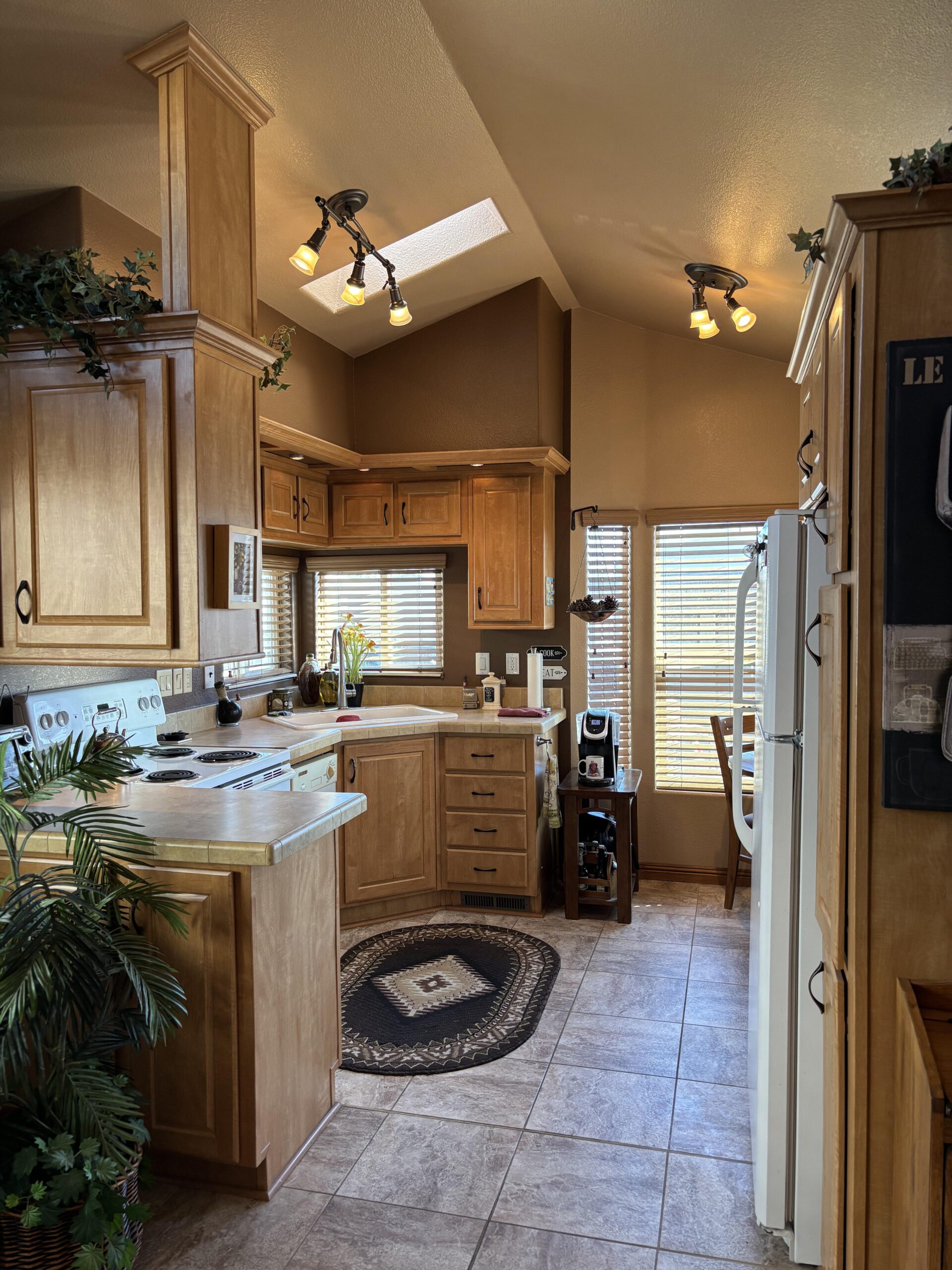 - Side/Front Kitchen w/Garbage Disposal, New Fridge, Dishwasher, Water Cooler, Deep Freezer, & Beer Fridge, & Skylight