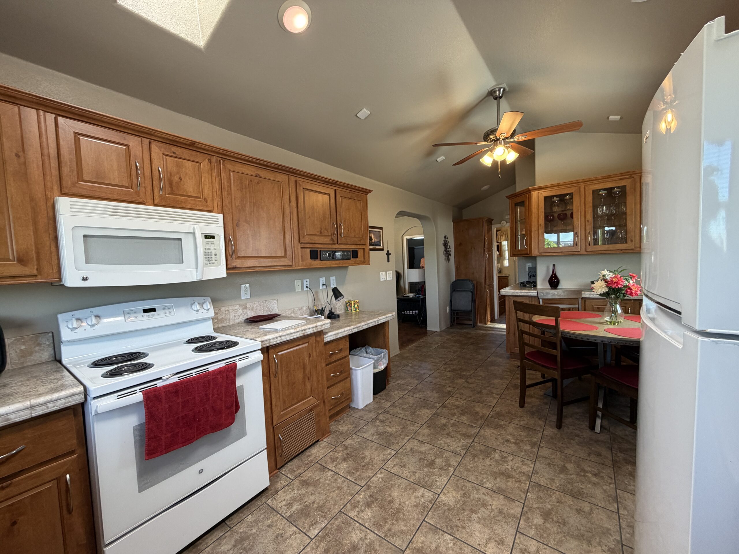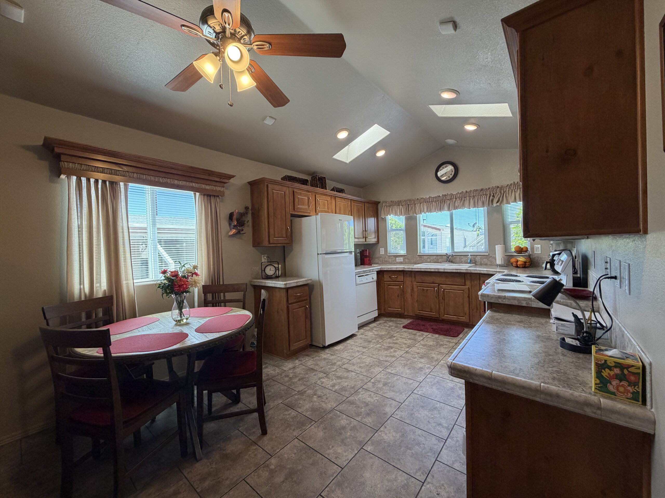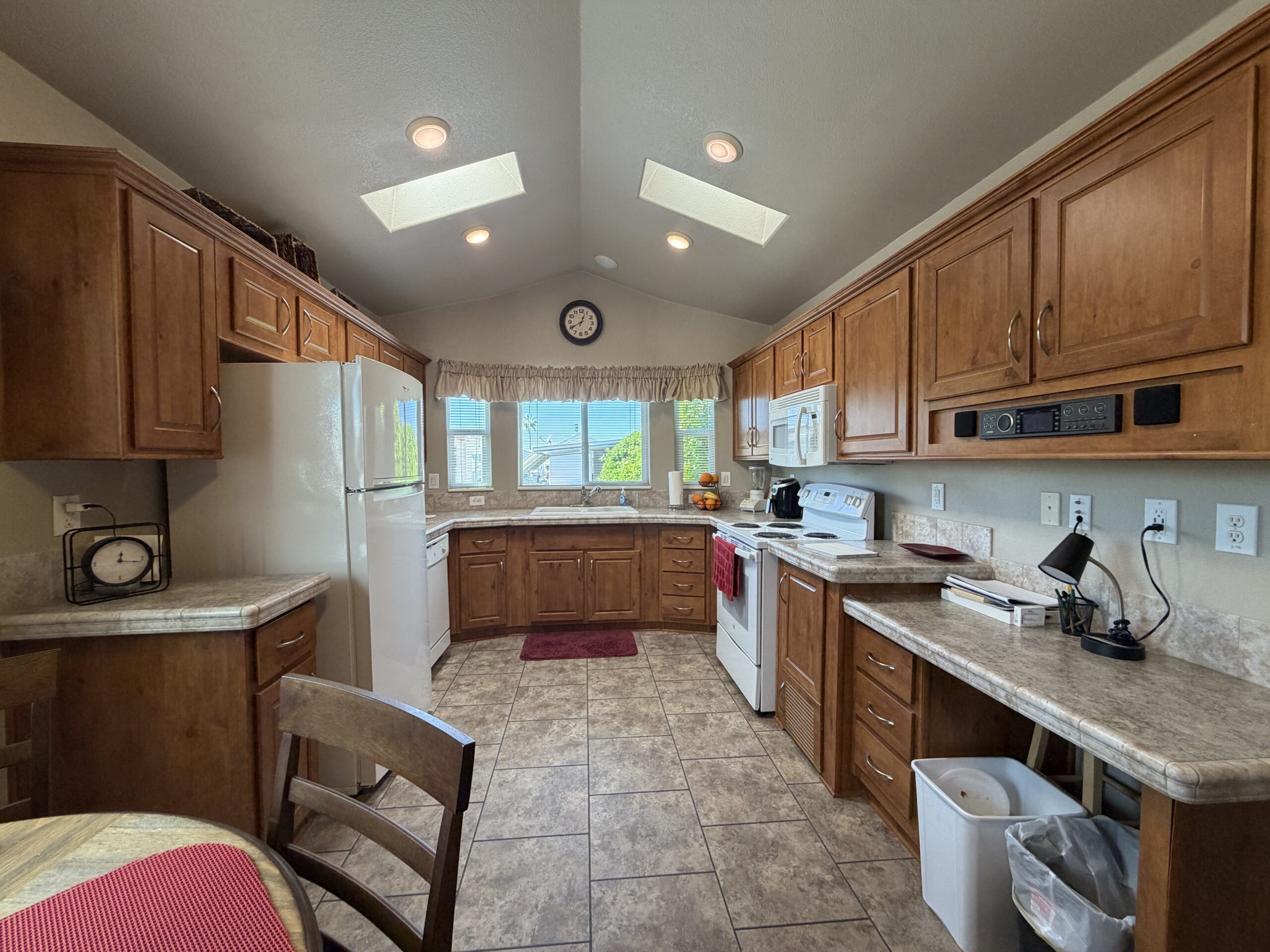 - Full Front Kitchen w/Skylights, Dining Room, White Appliances, Built-In Microwave, Dishwasher, Backsplash, Garbage Disposal, & Pantry