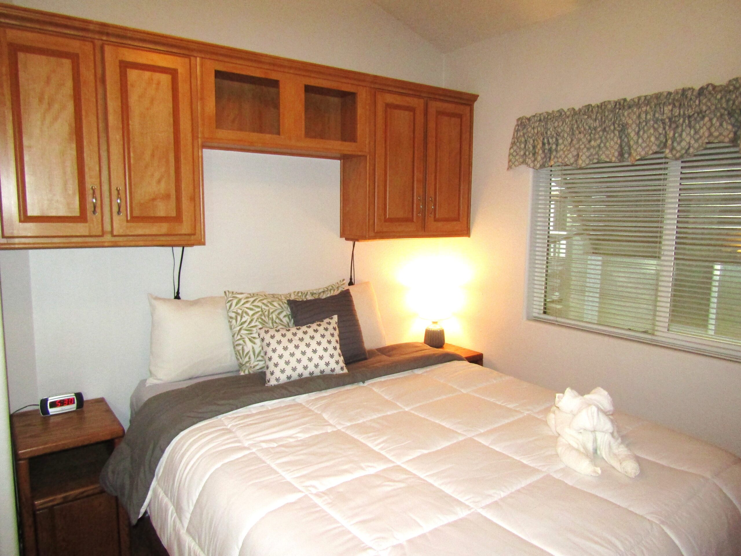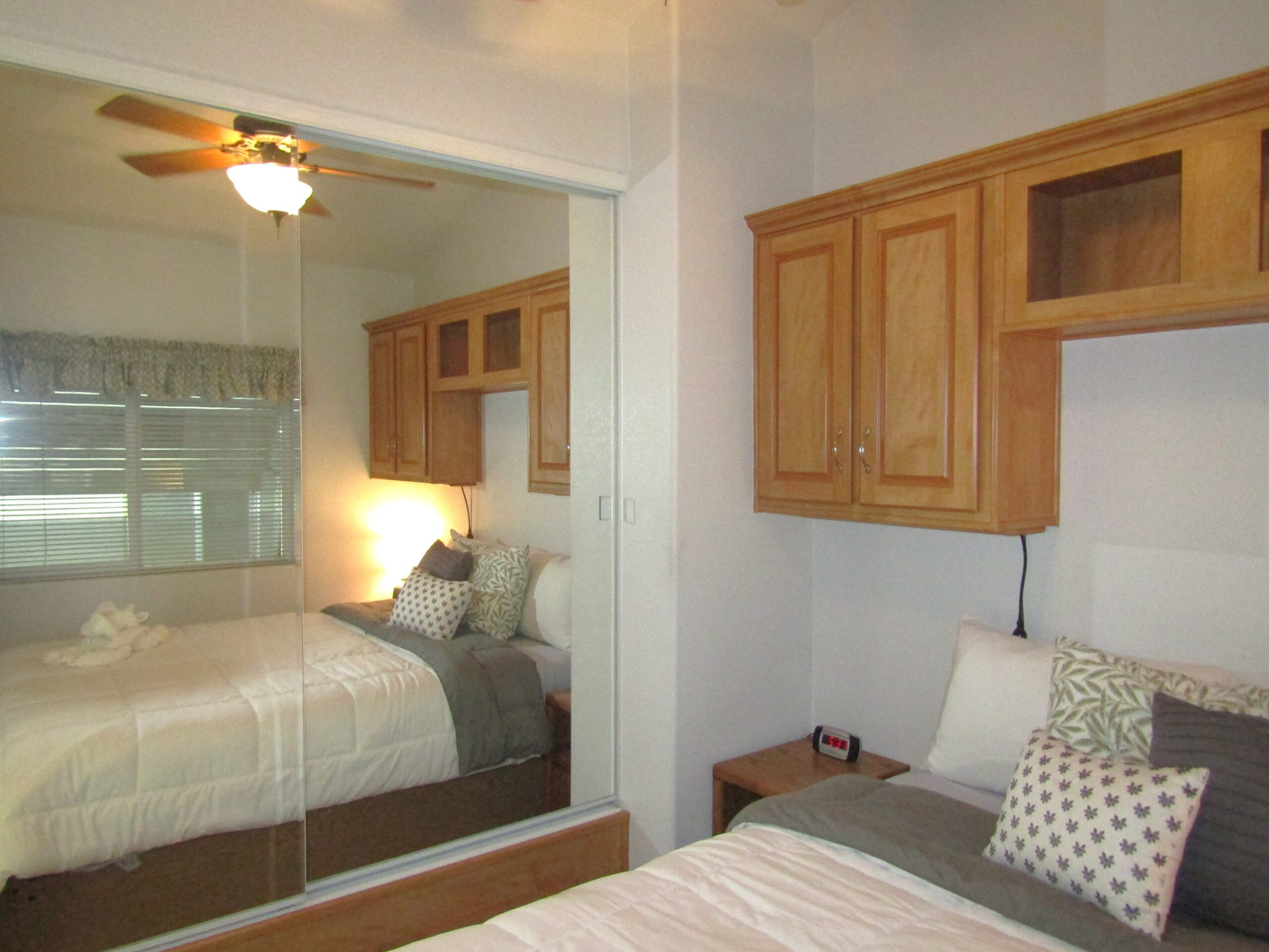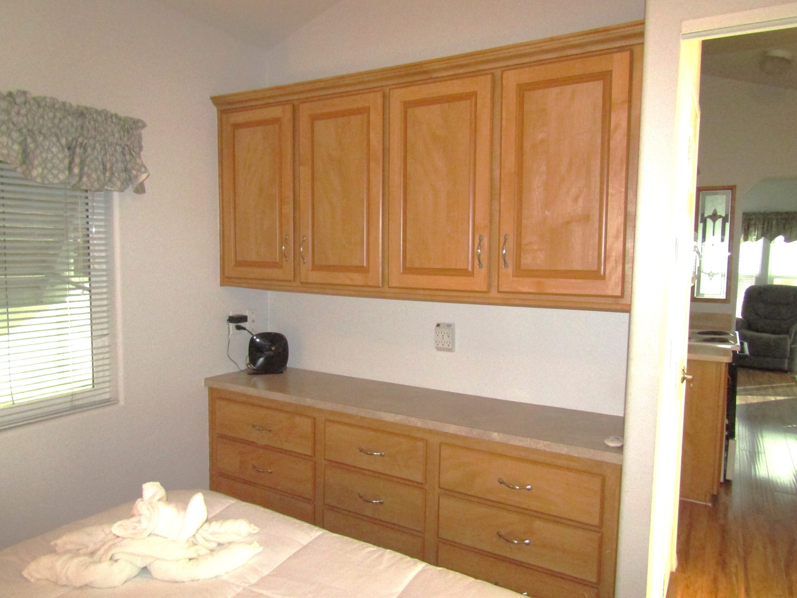 - Queen Bedroom Lift-N-Store Bed w/Mirrored Closet, Built-In Dresser, Upper Cabinets, & Counter