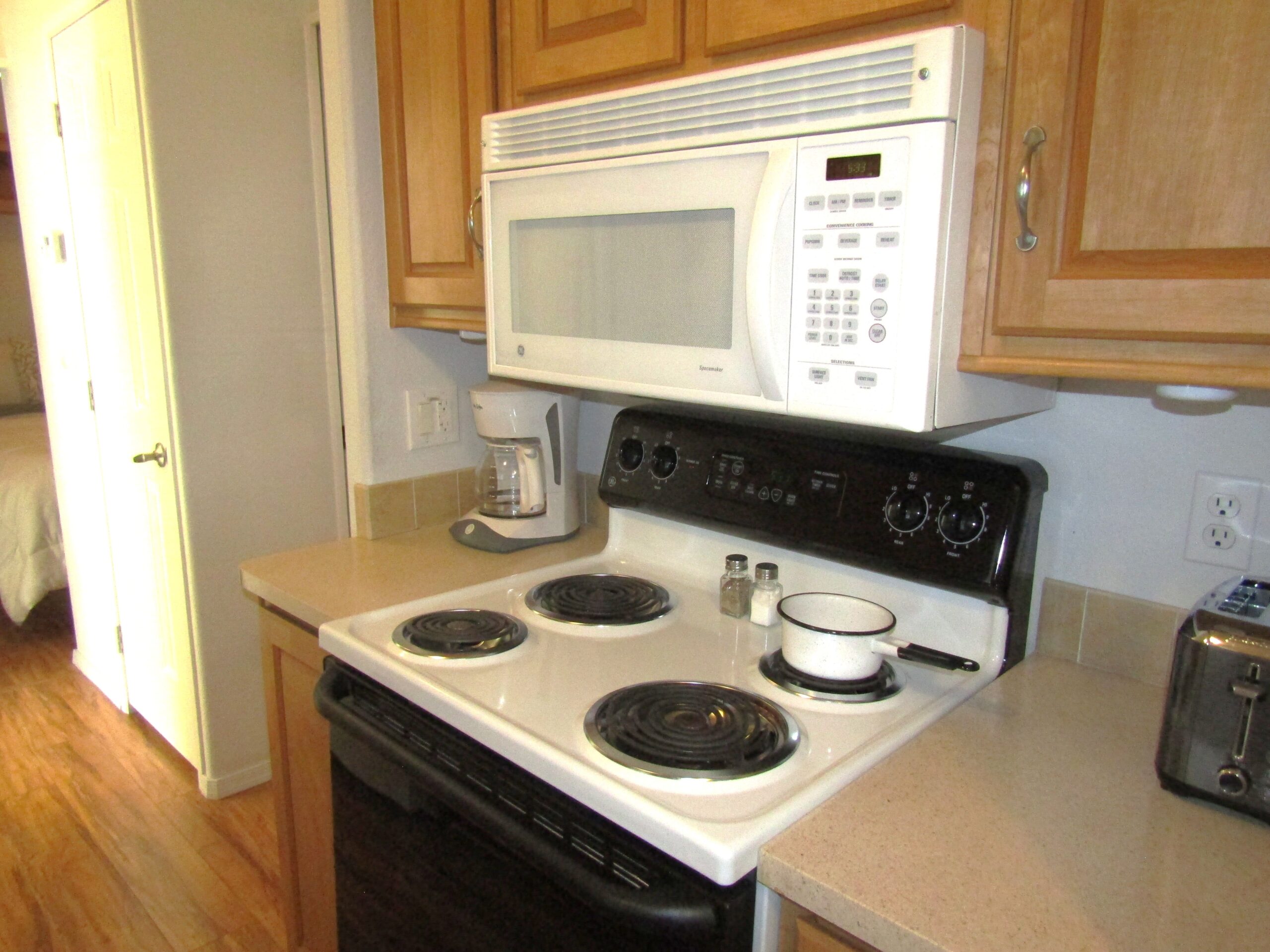 - Galley Kitchen w/SS Sink & Upgraded Faucet, Newer Microwave, & Matching White Appliances