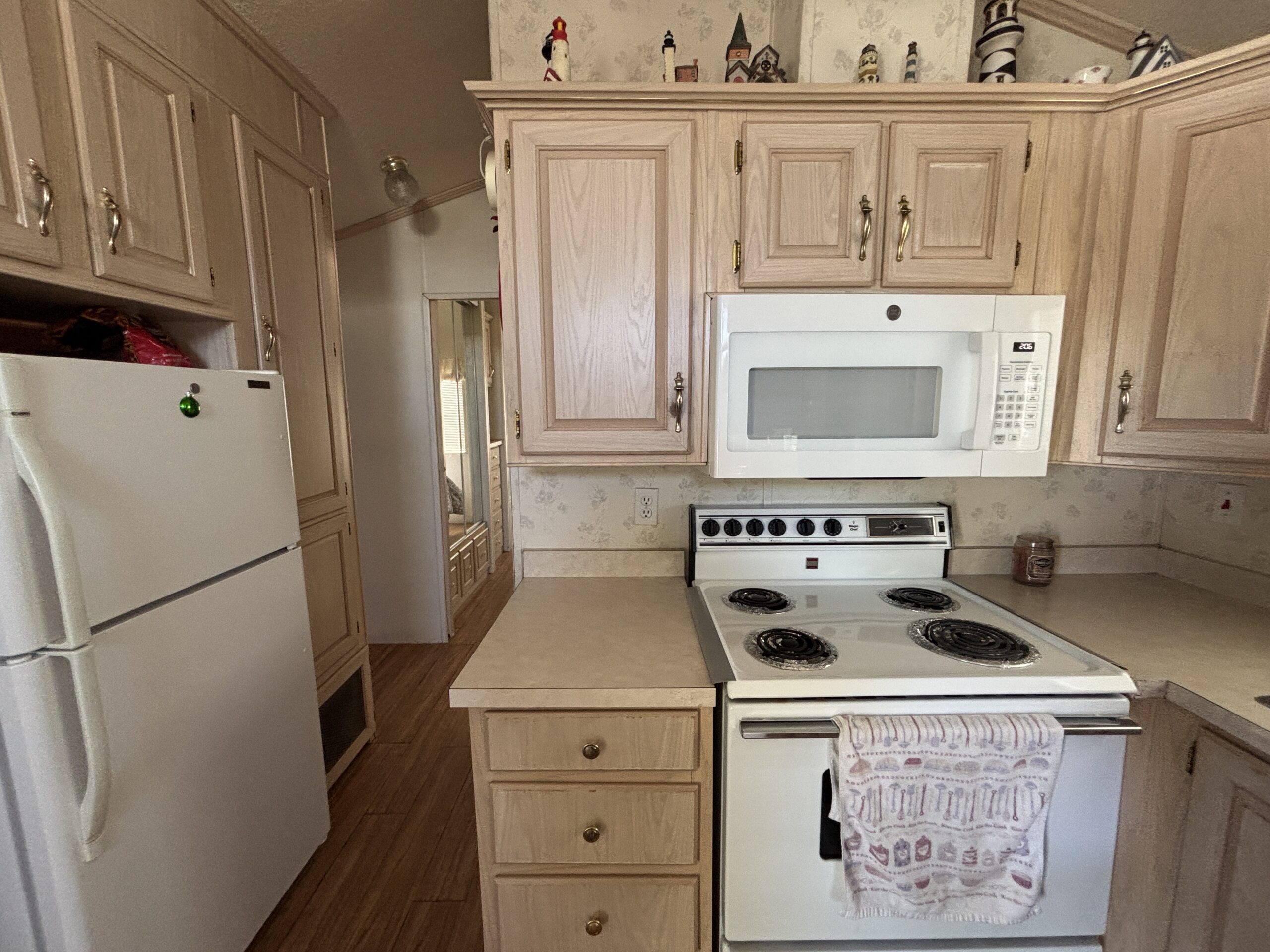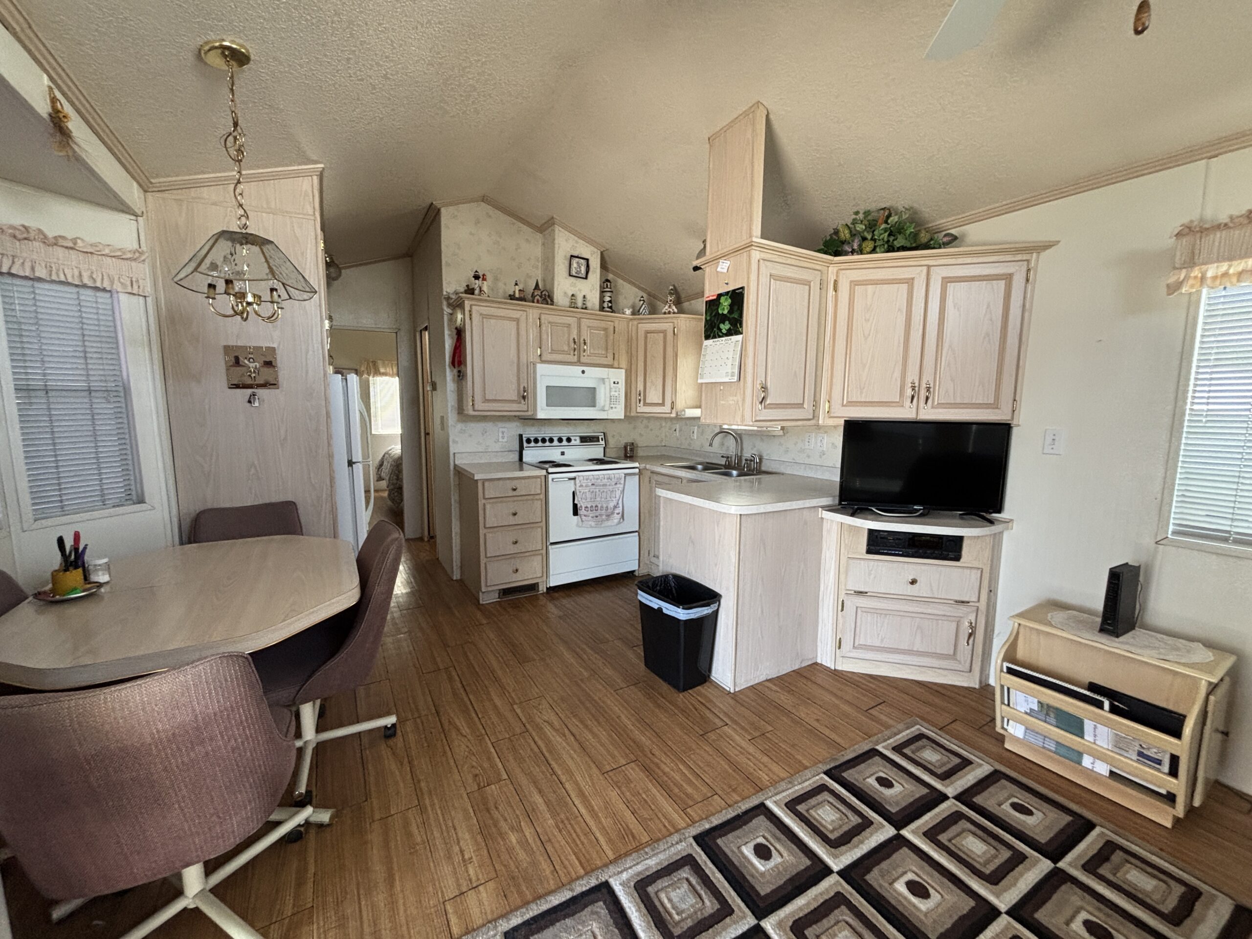• U-Shaped Kitchen w/Dining Bay. Built-In Microwave, White Appliances, Formica Counters, Backsplash, & Pantry