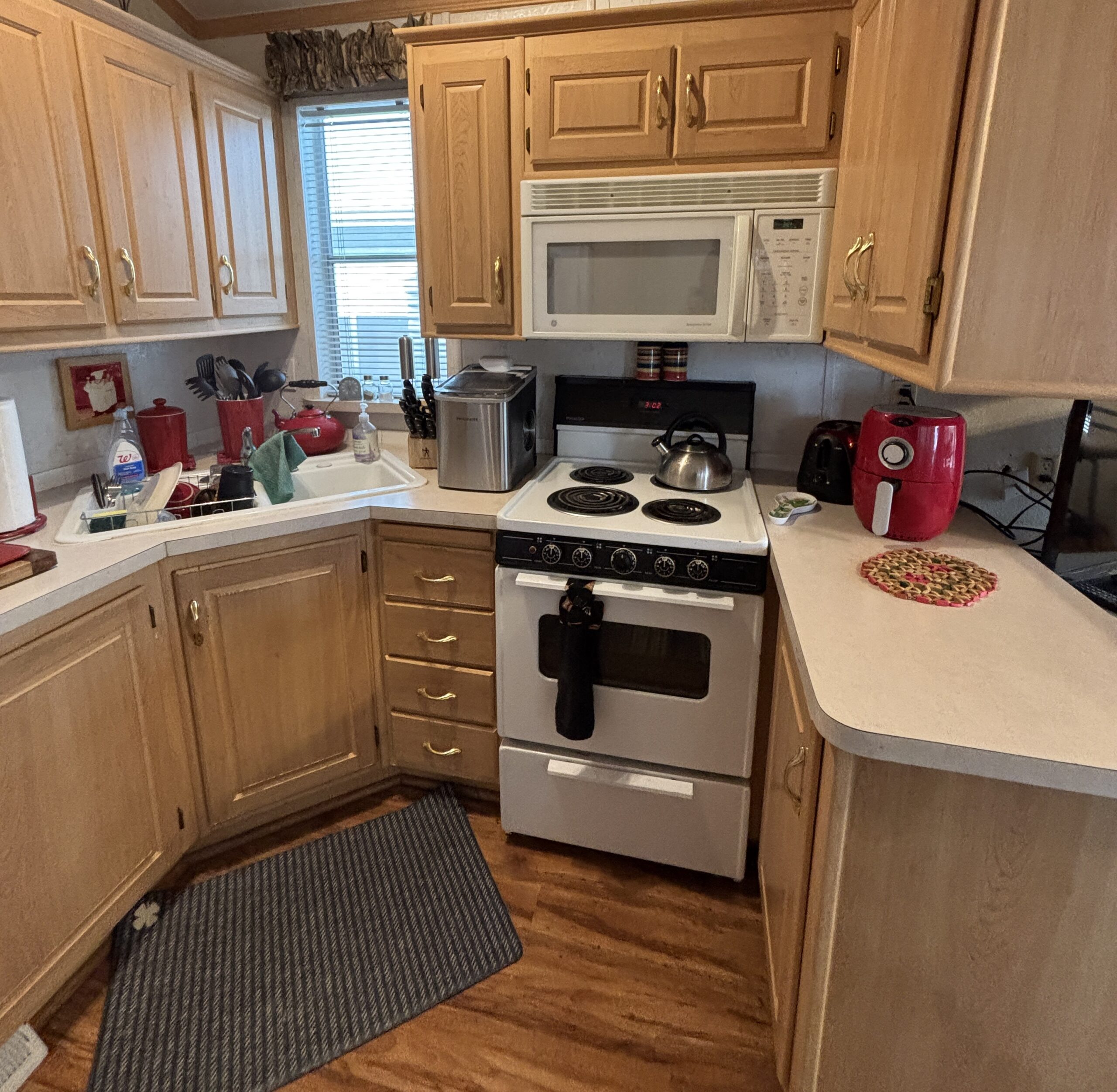 - U-Shaped Kitchen w/ Built-In Microwave, Solid Surface Counters, Backsplash, & Pantry