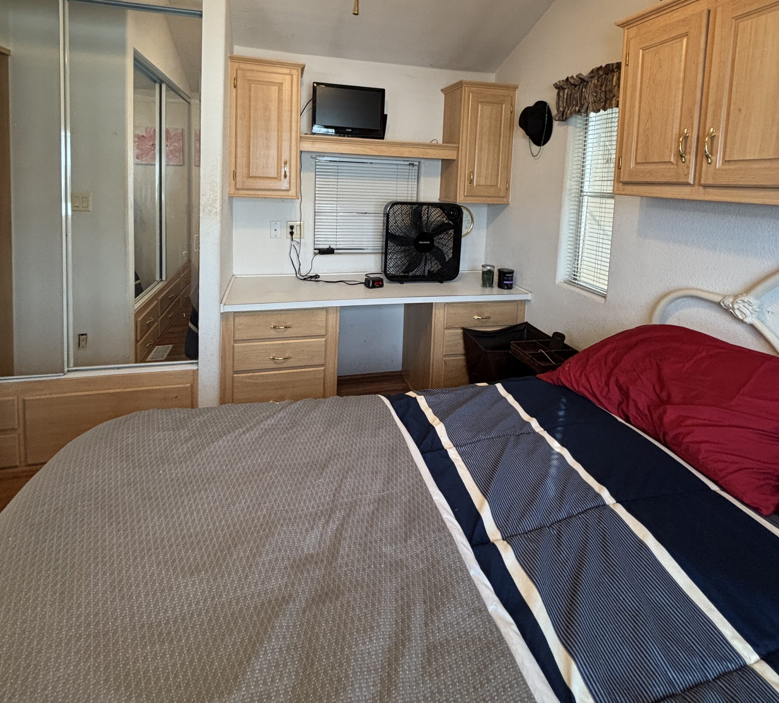- Queen Bedroom w/Mirrored His and Hers Closets, Built-In Upper Cabinet Storage, Built-In Desk, & Built-In Dresser