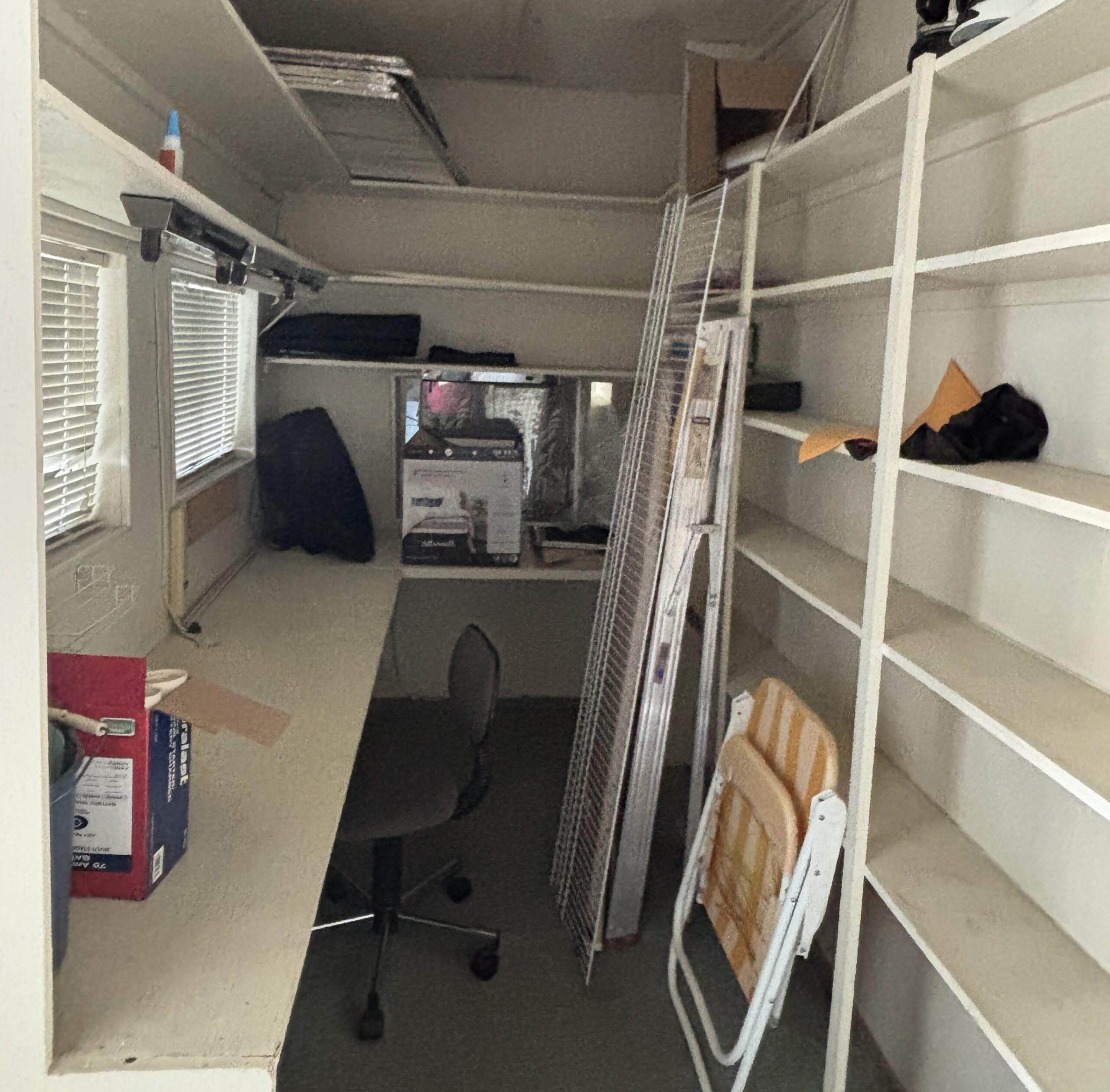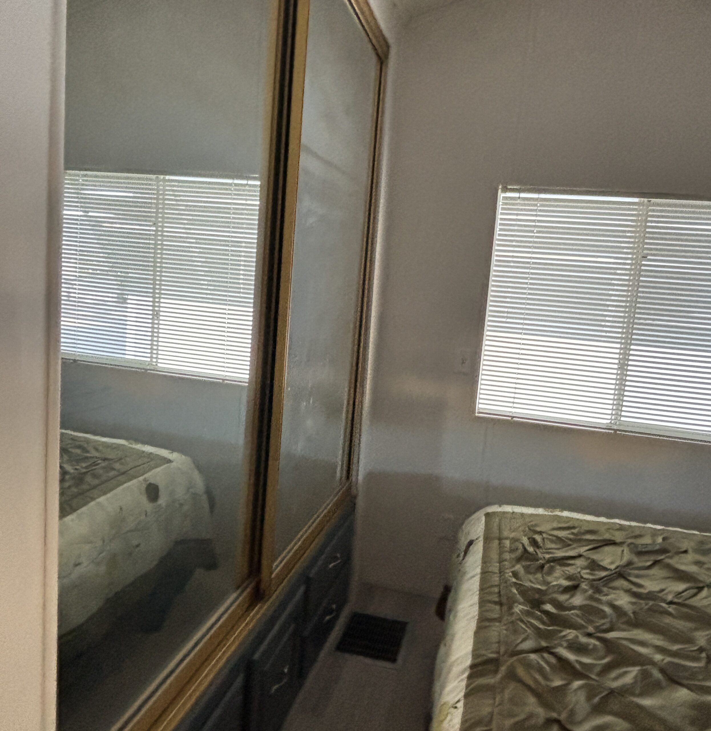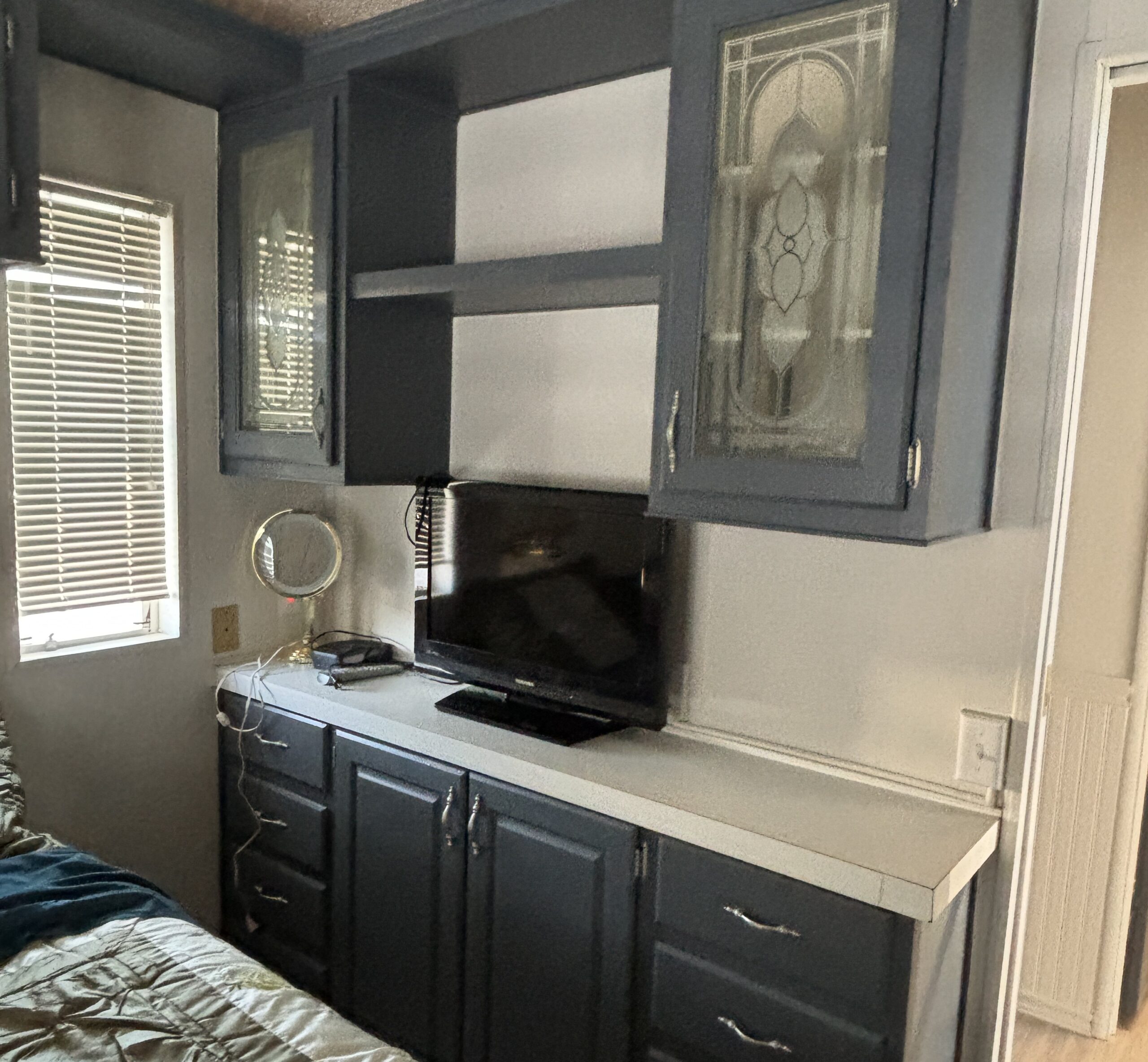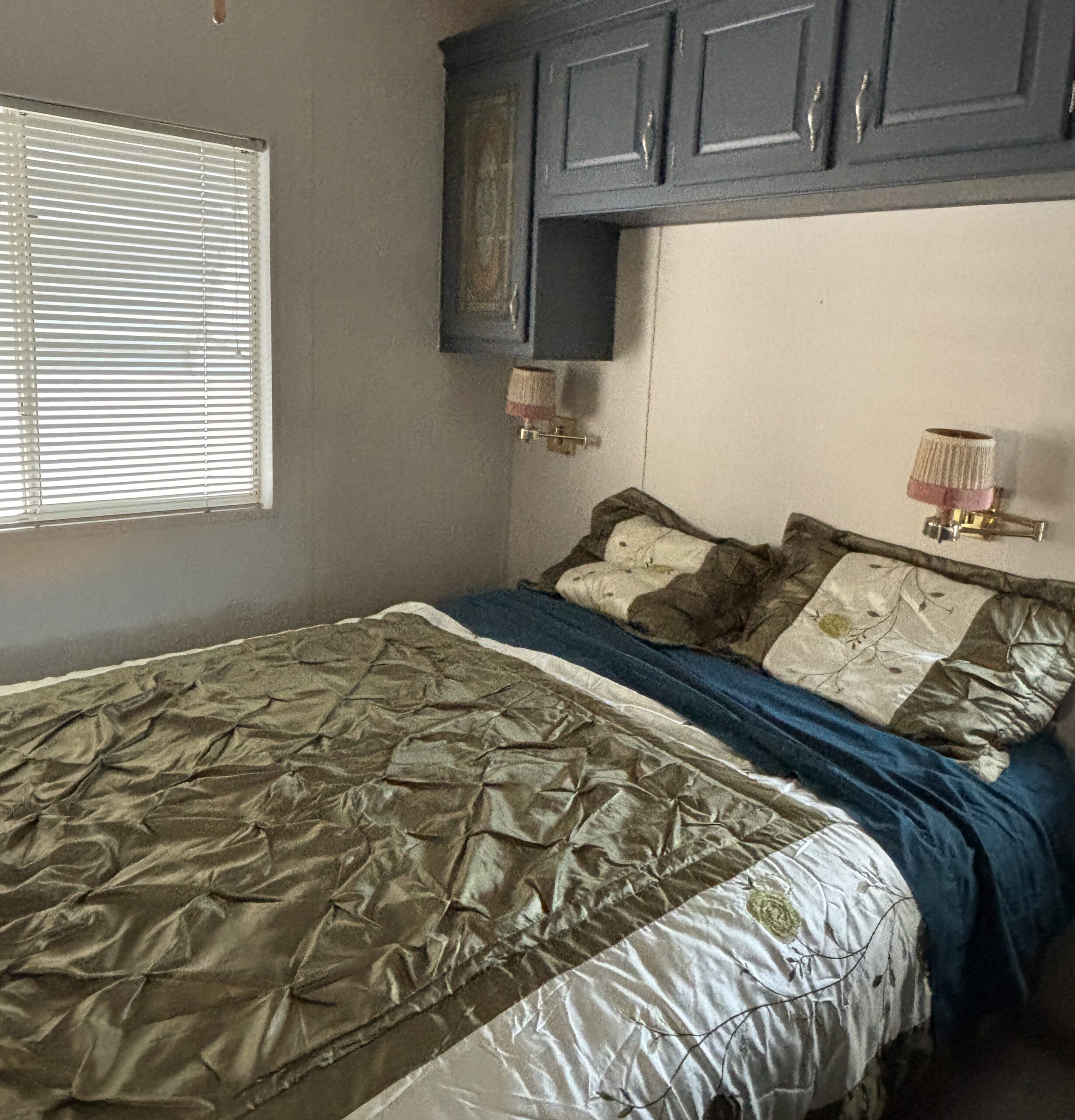 • Queen Bedroom w/Mirrored Closet Doors, Built-In Dresser, & Upper Storage