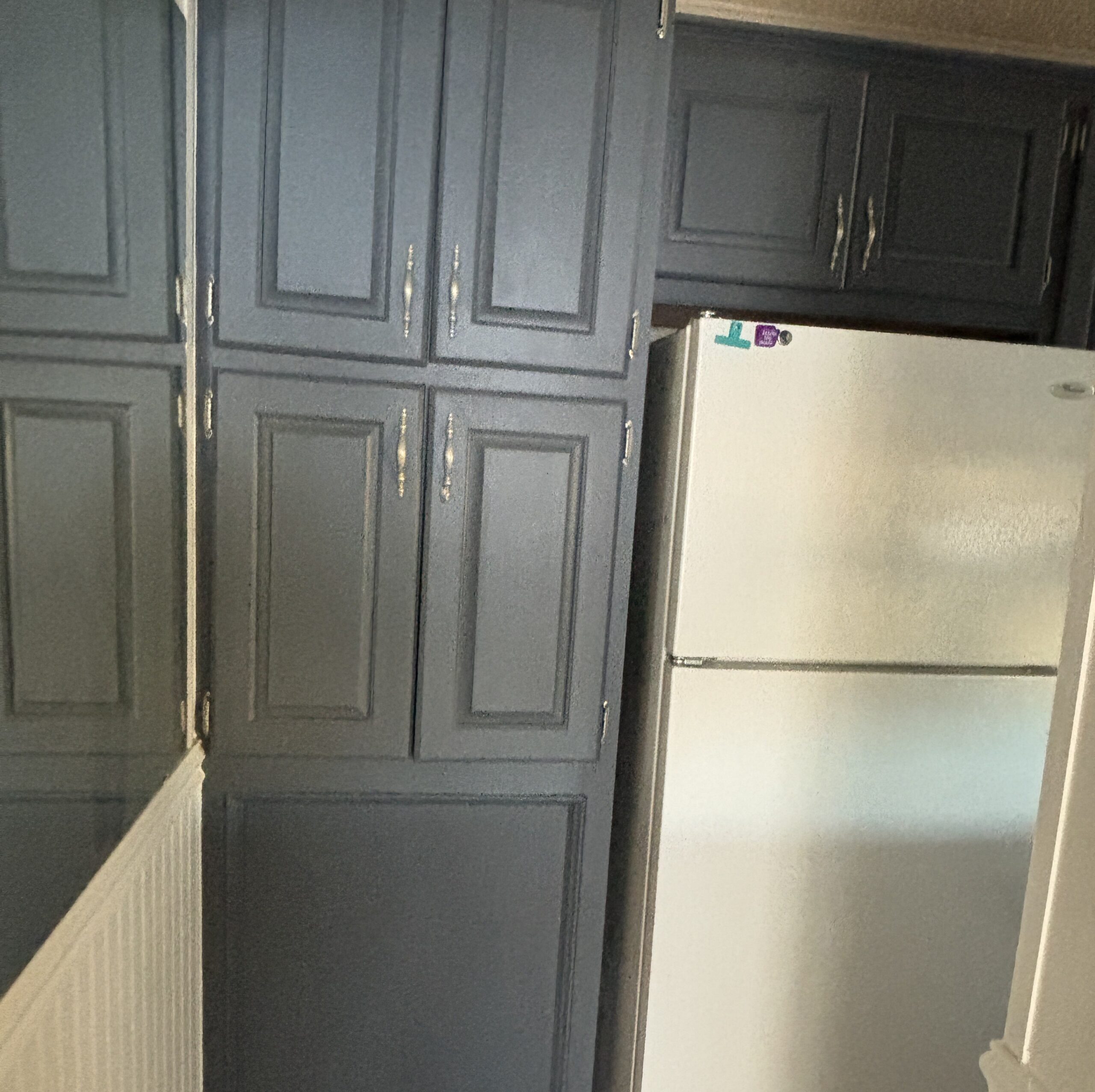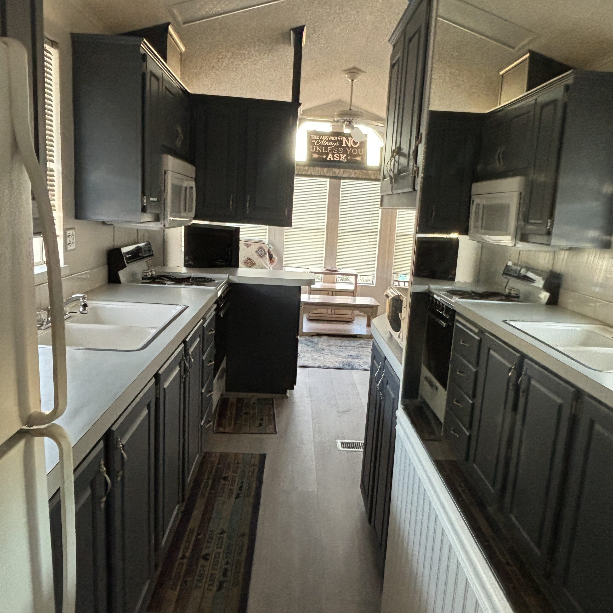 • Galley Kitchen w/White Appliances, Built-In Microwave, Tiled Backsplash, & Pantry