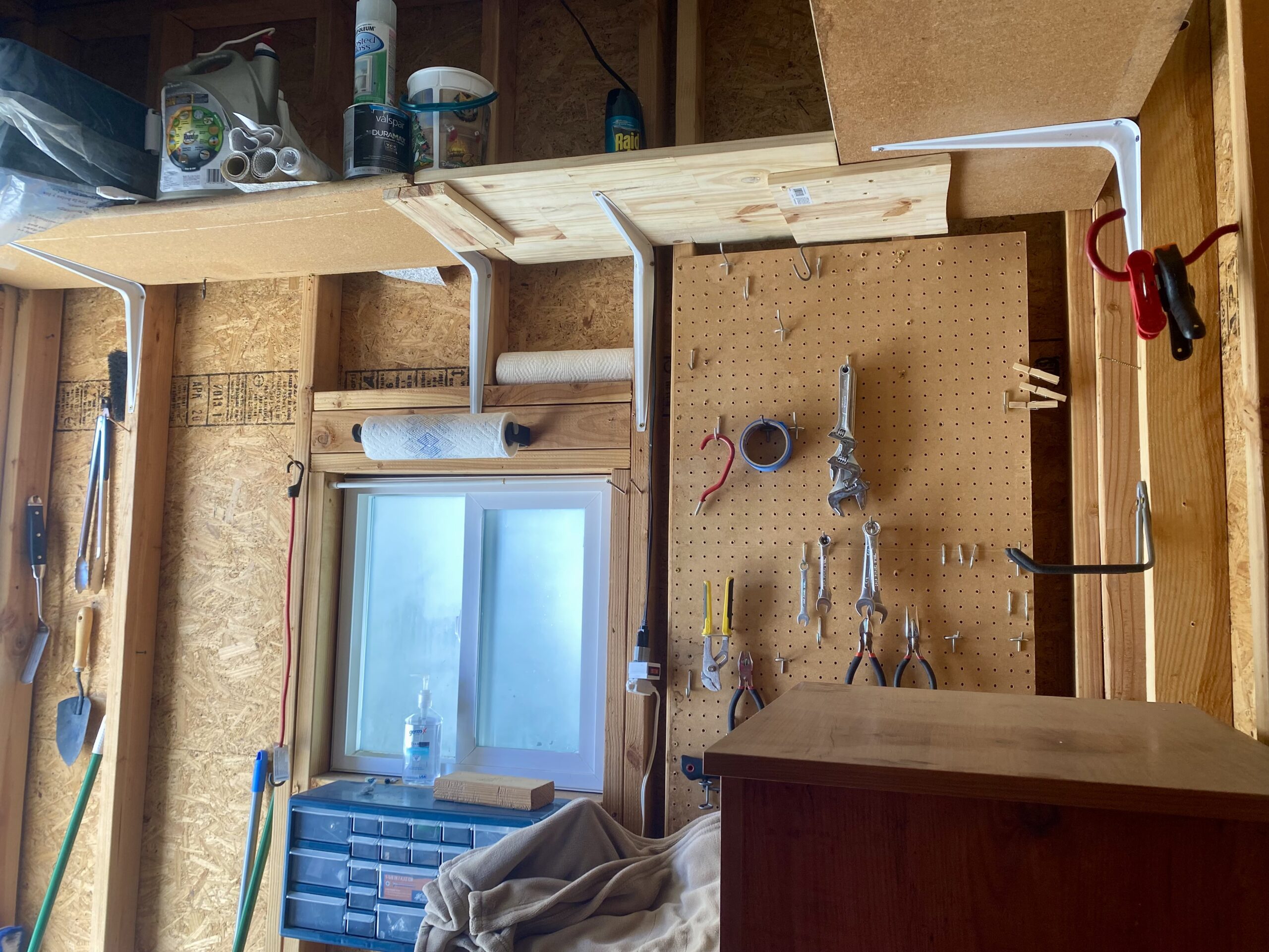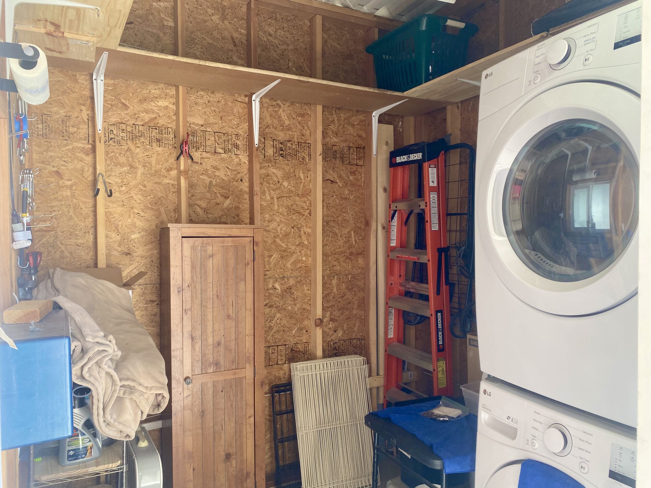 • Unfinished Shed w/Full-Size Stackable Laundry w/Upper Shelving for Storage
