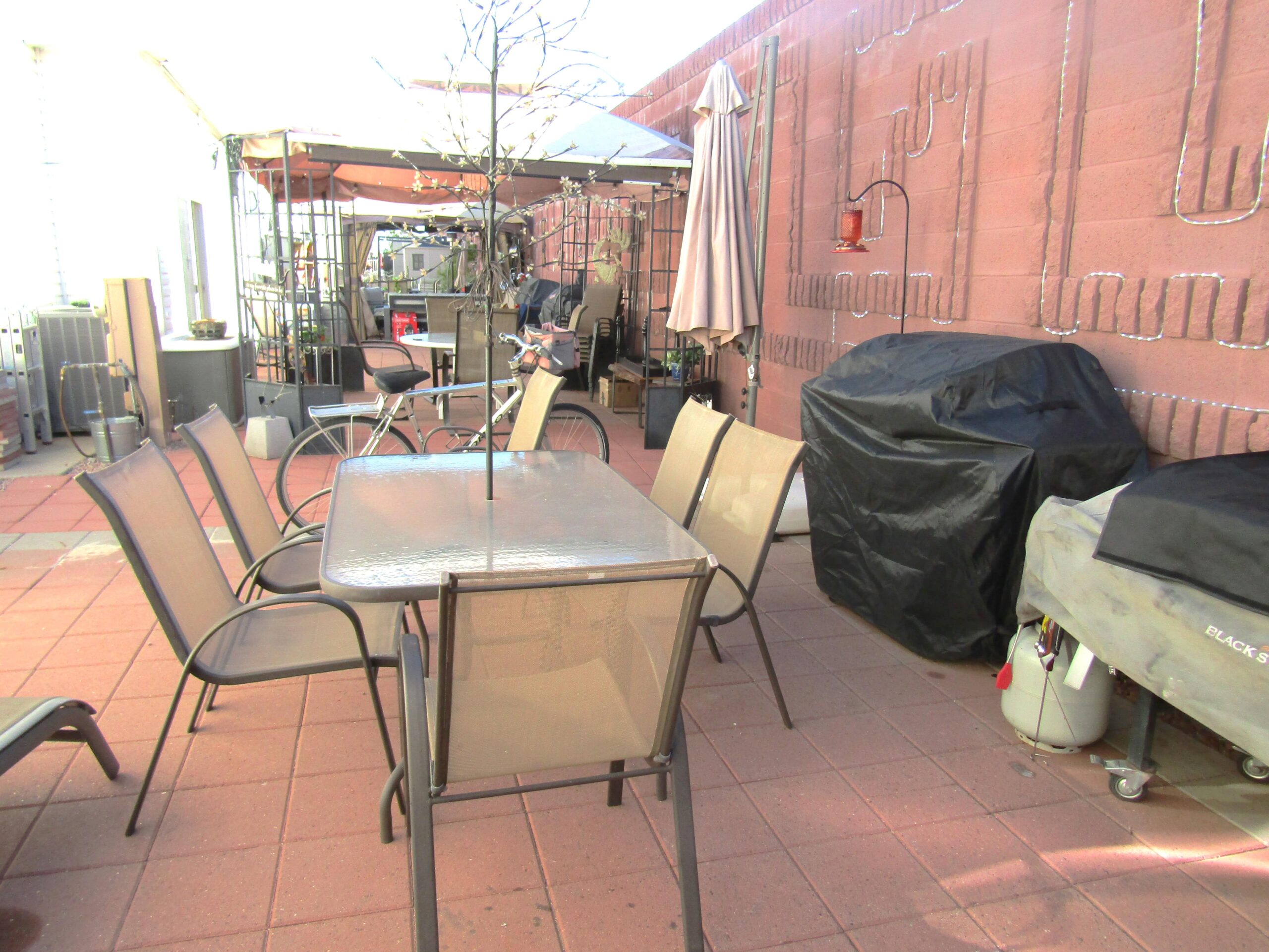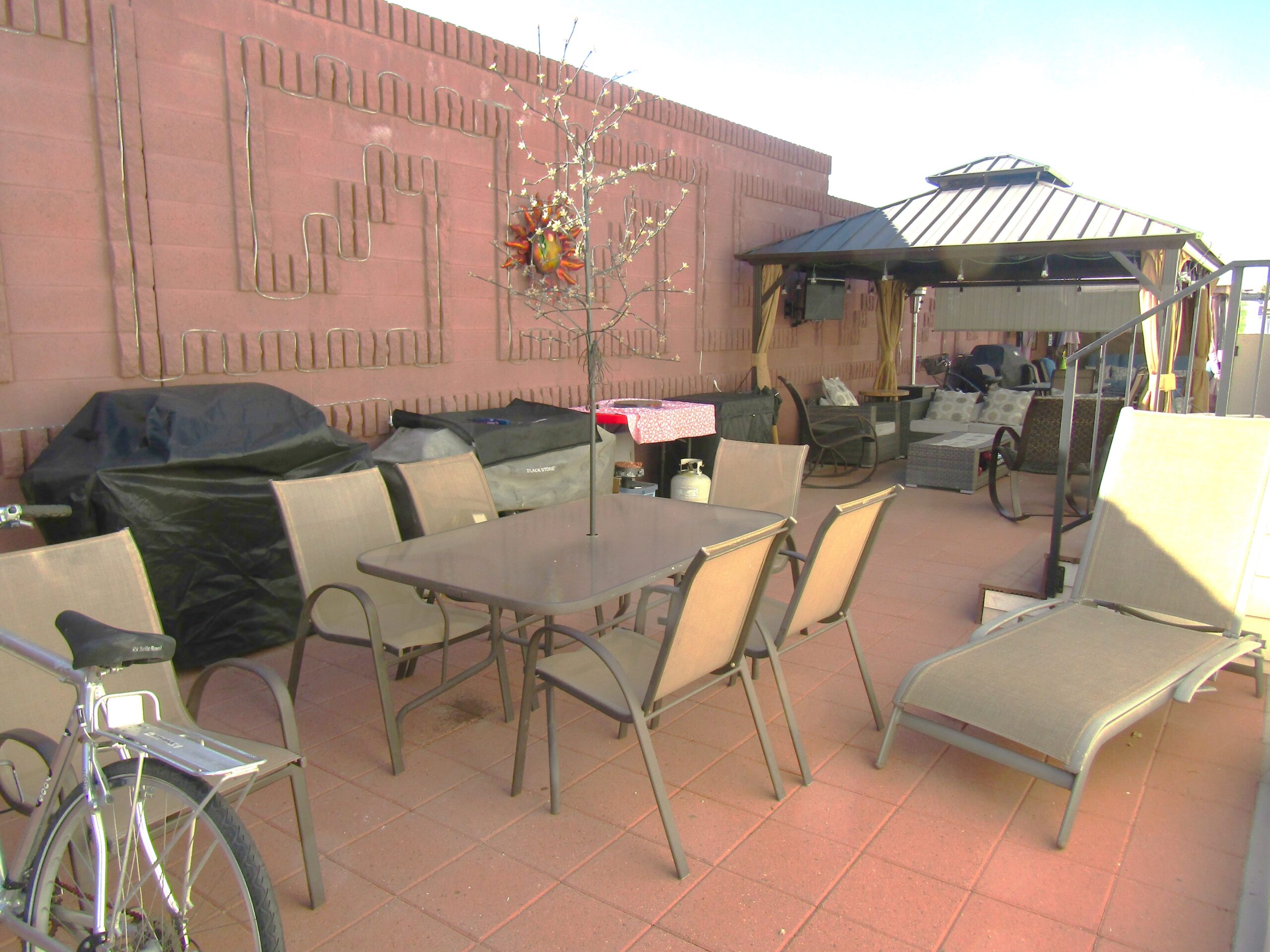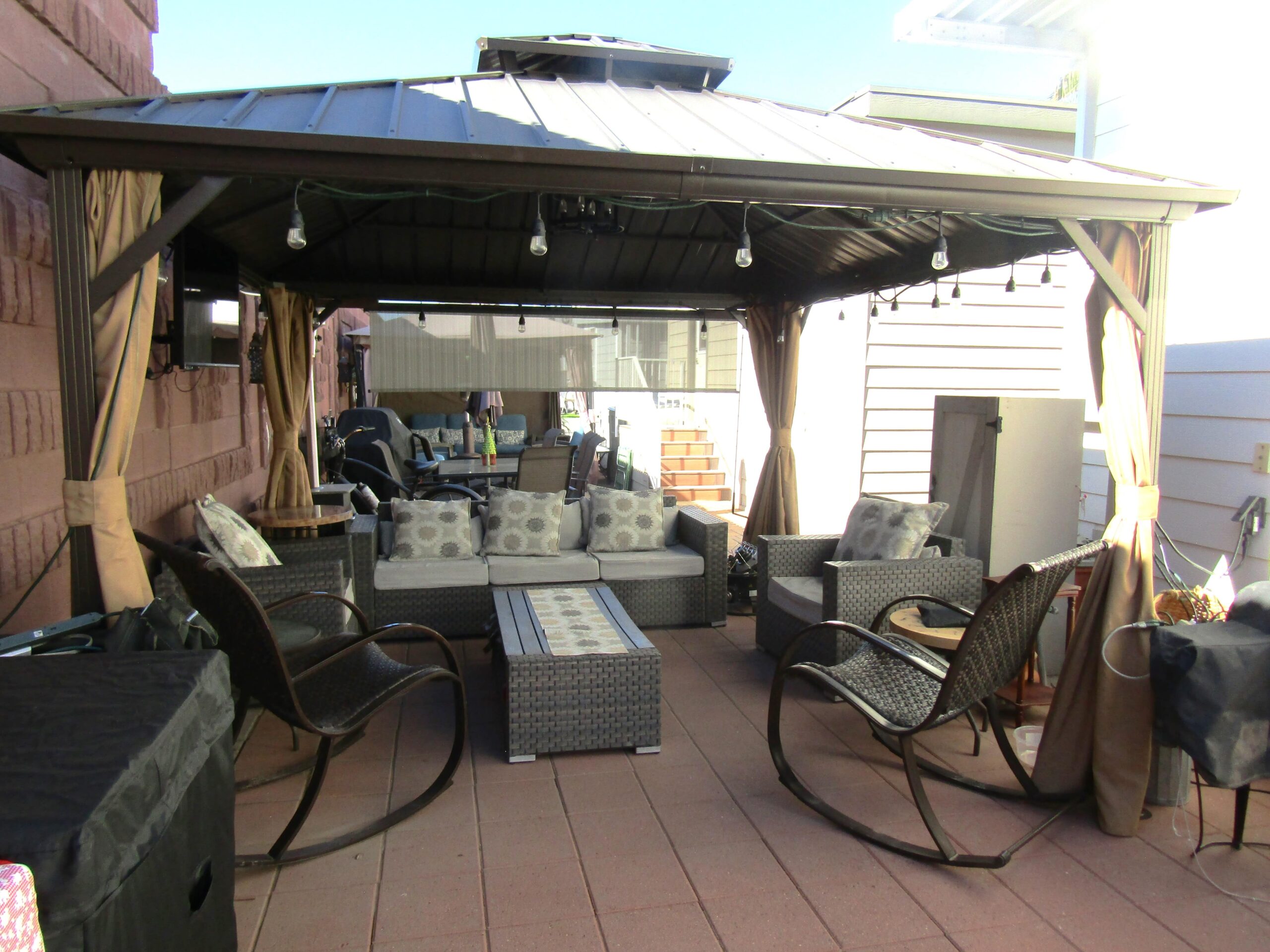 - Large Back Patio w/New Metal Gazebo includes TV/Furniture, Sunscreens, Right Side Patio Pavers, & Off-Set Post