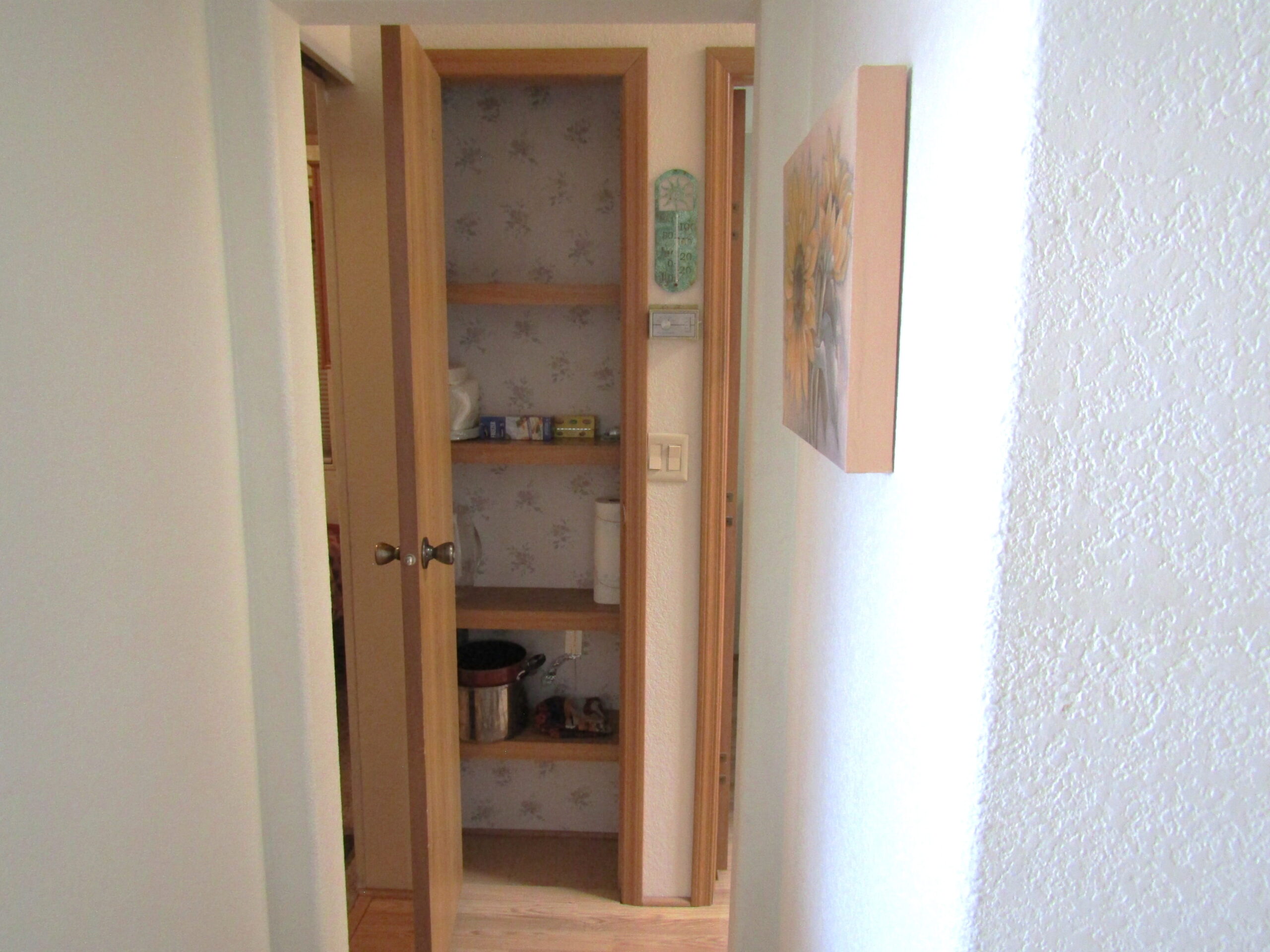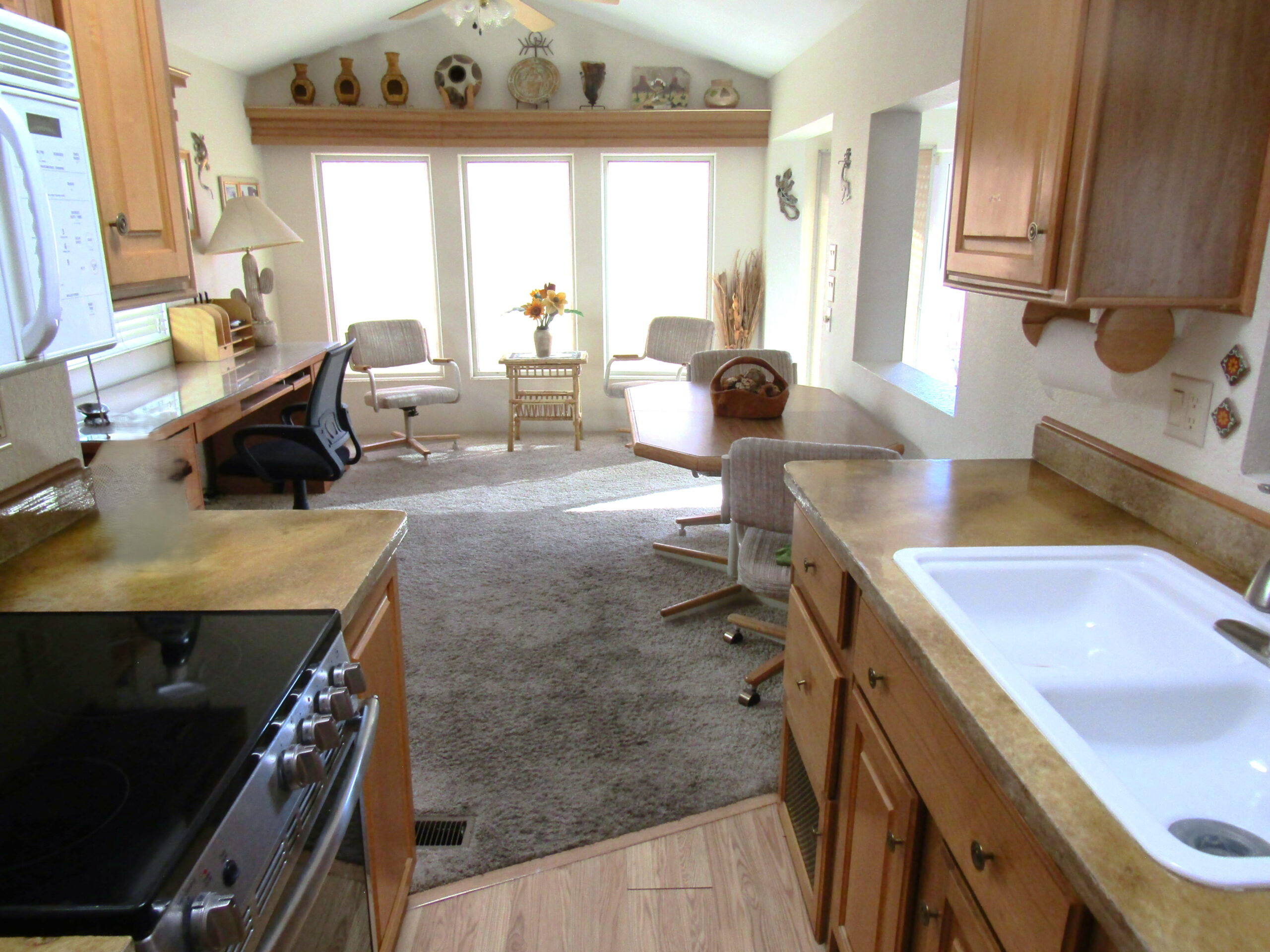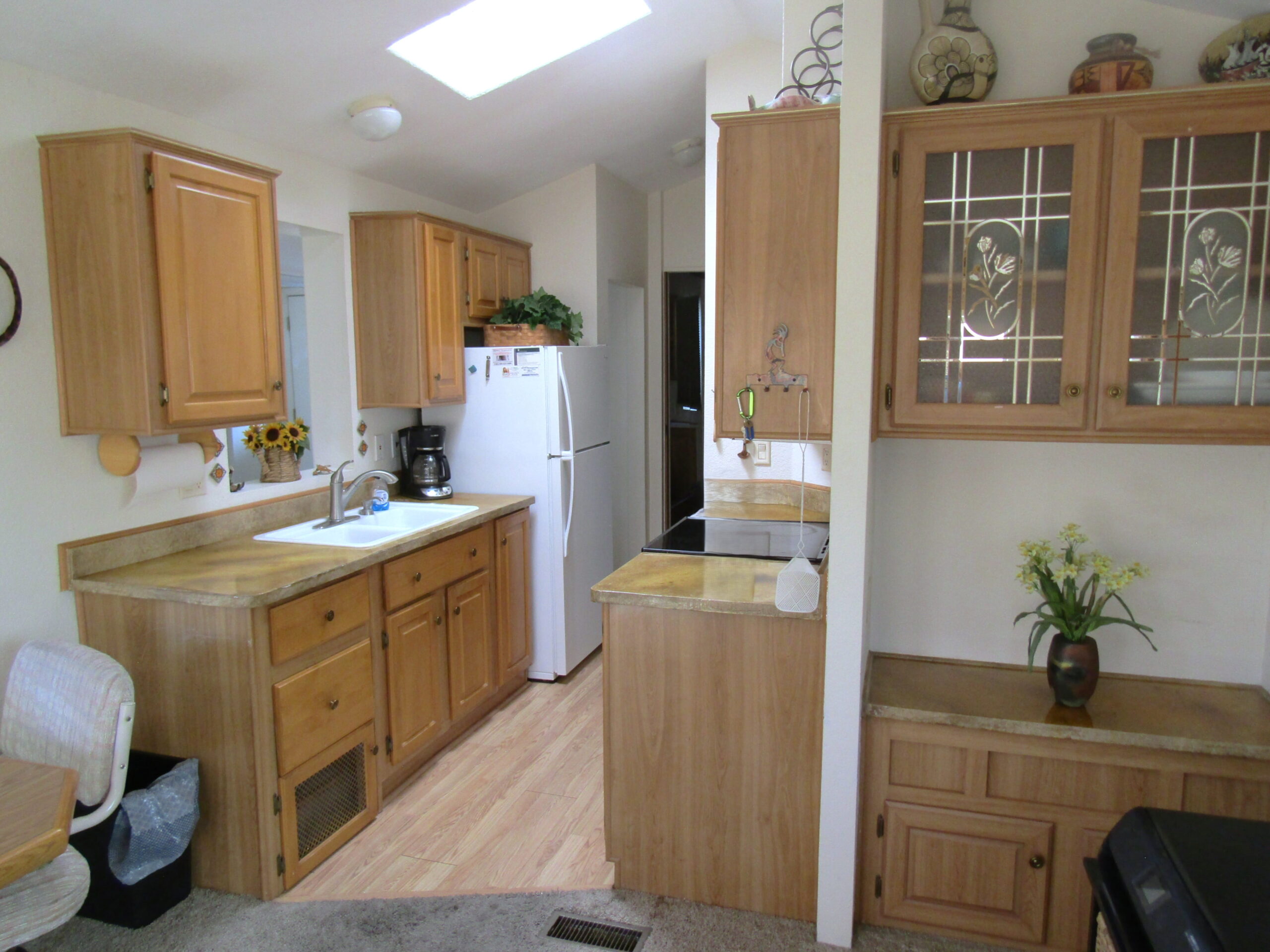 - Galley Kitchen w/Laminate Floor, SS Glass Top Stove, Peak Thru Window, Skylight & Pantry Closet