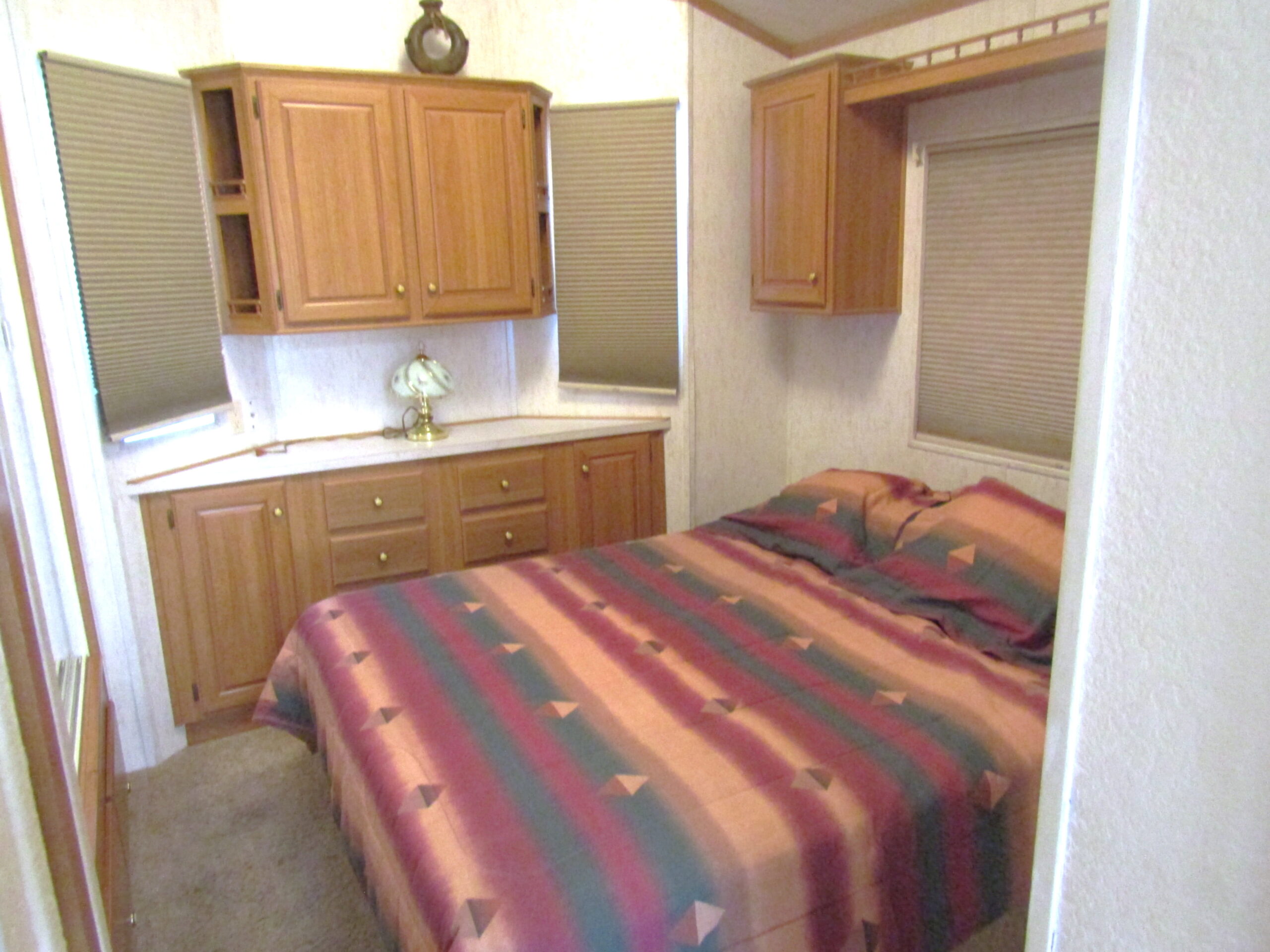 - Carpeted Queen Bedroom Lift-N-Store Bed w/Mirrored Closet, Built-In Dresser, & Upper Cabinets