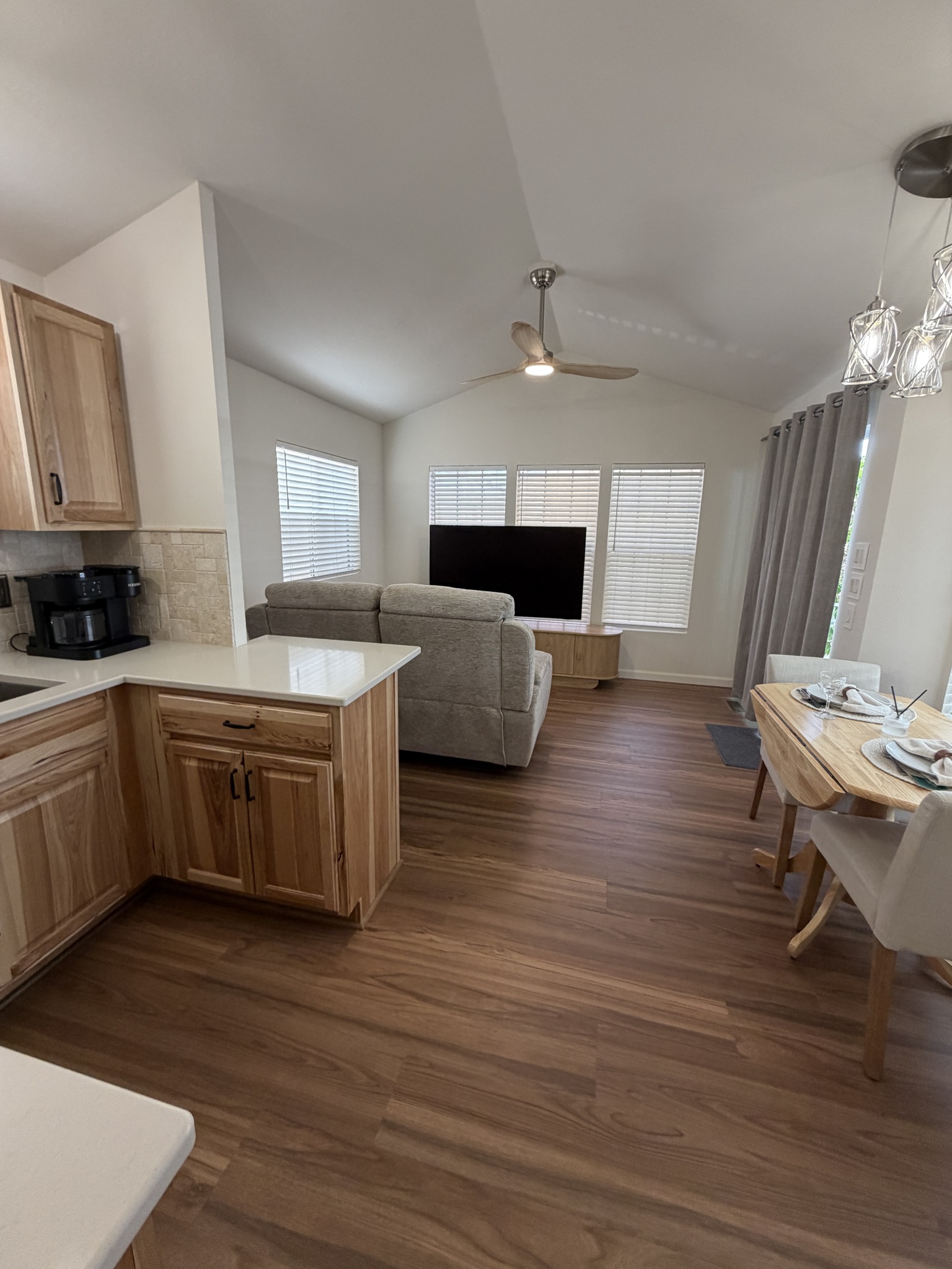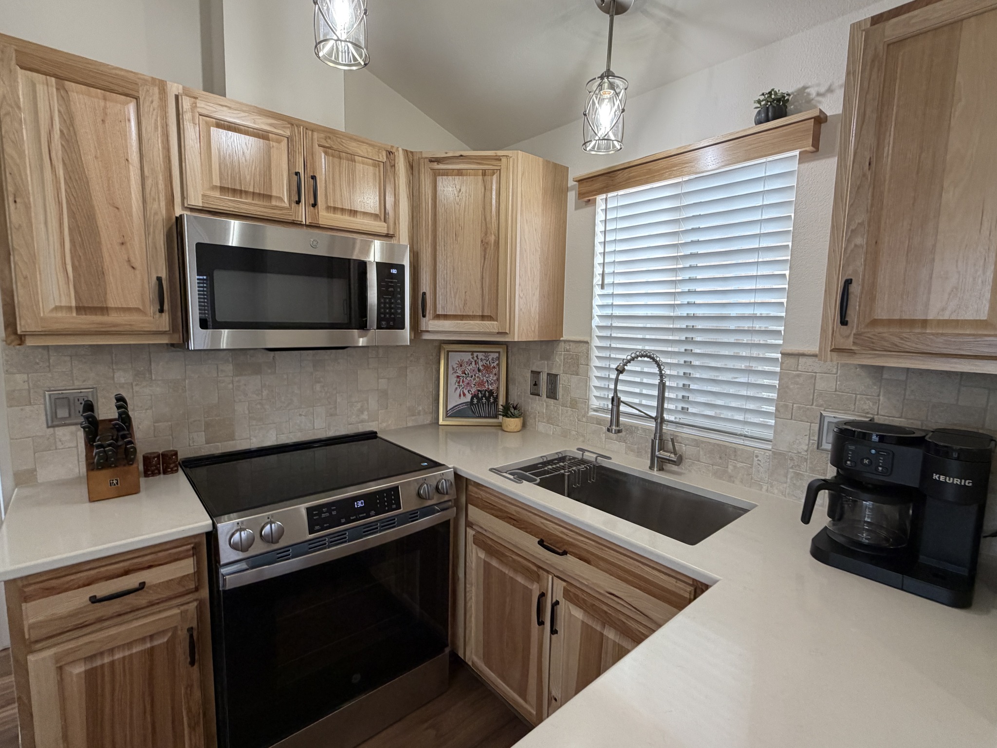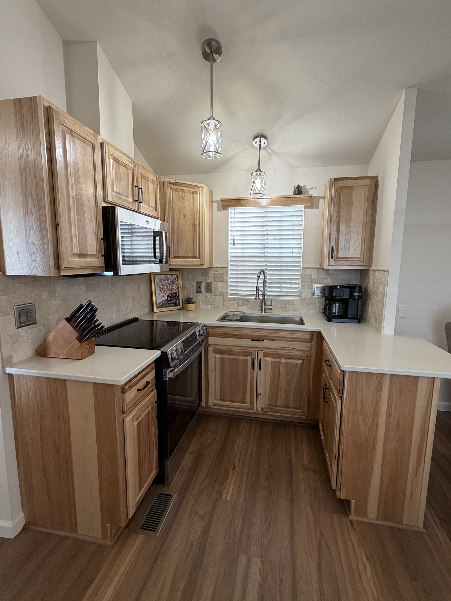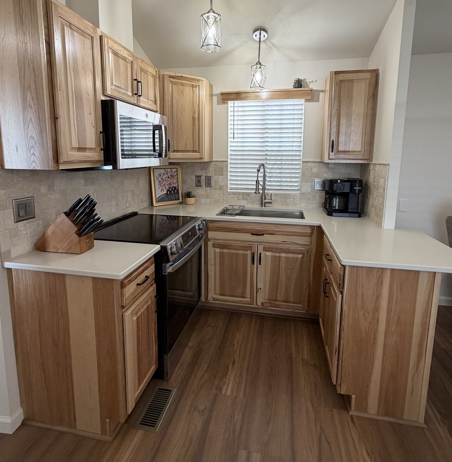• U-Shaped Kitchen w/New Hickory Cabinets, Quartz Counters, New Stainless Steel Appliances, Built-In Microwave, & Glass-Top Stove, Backsplash, & Pantry
