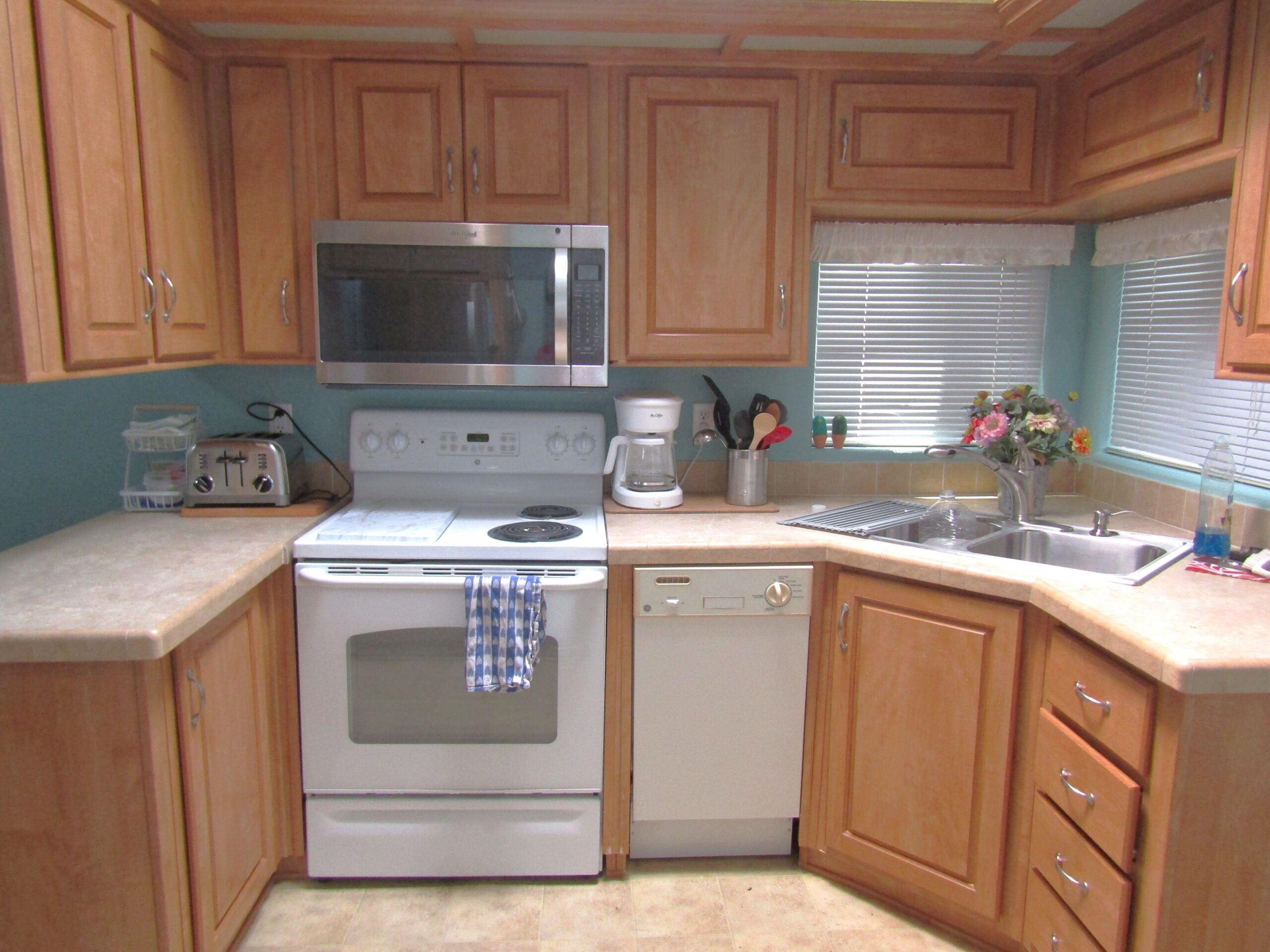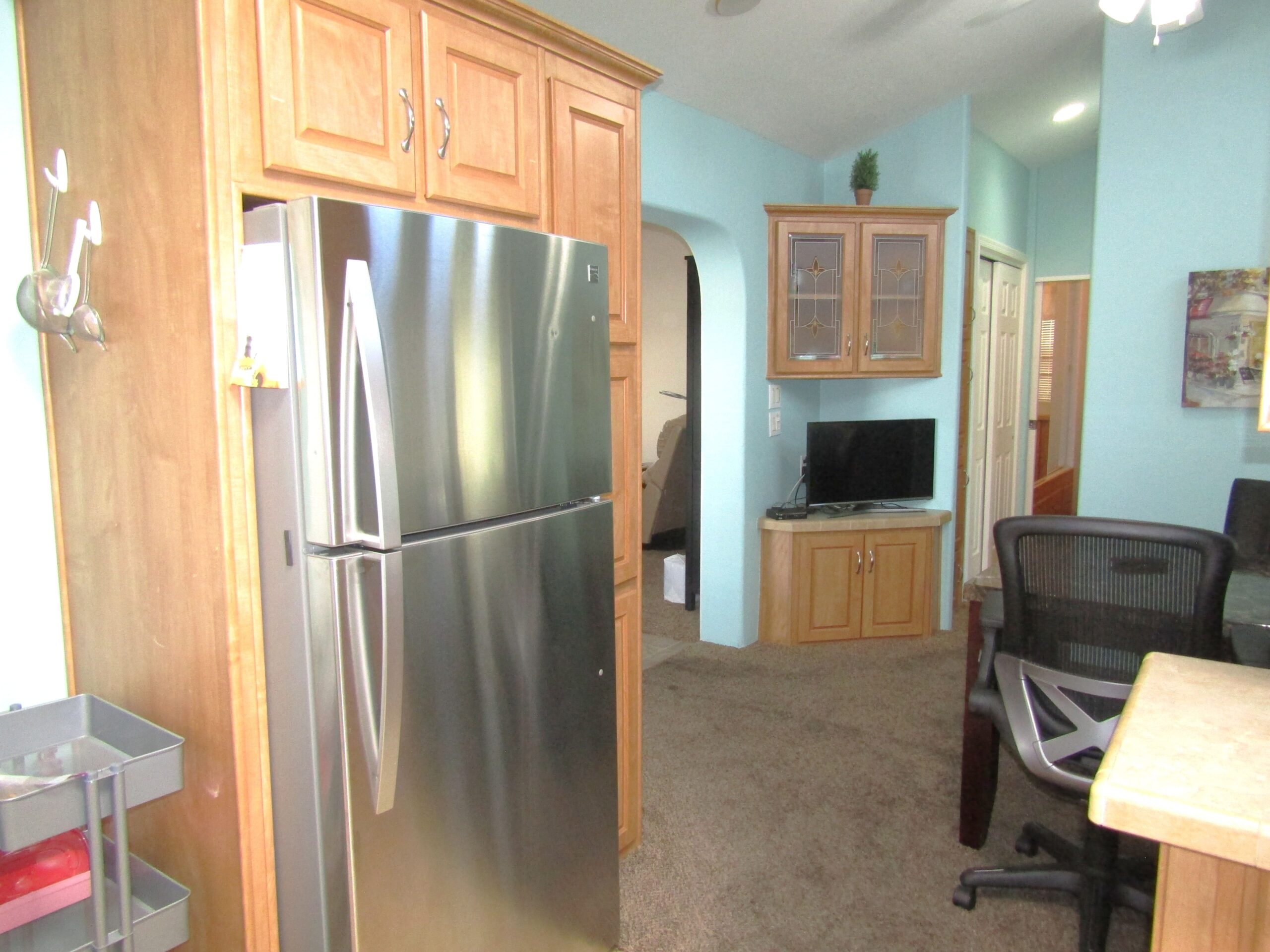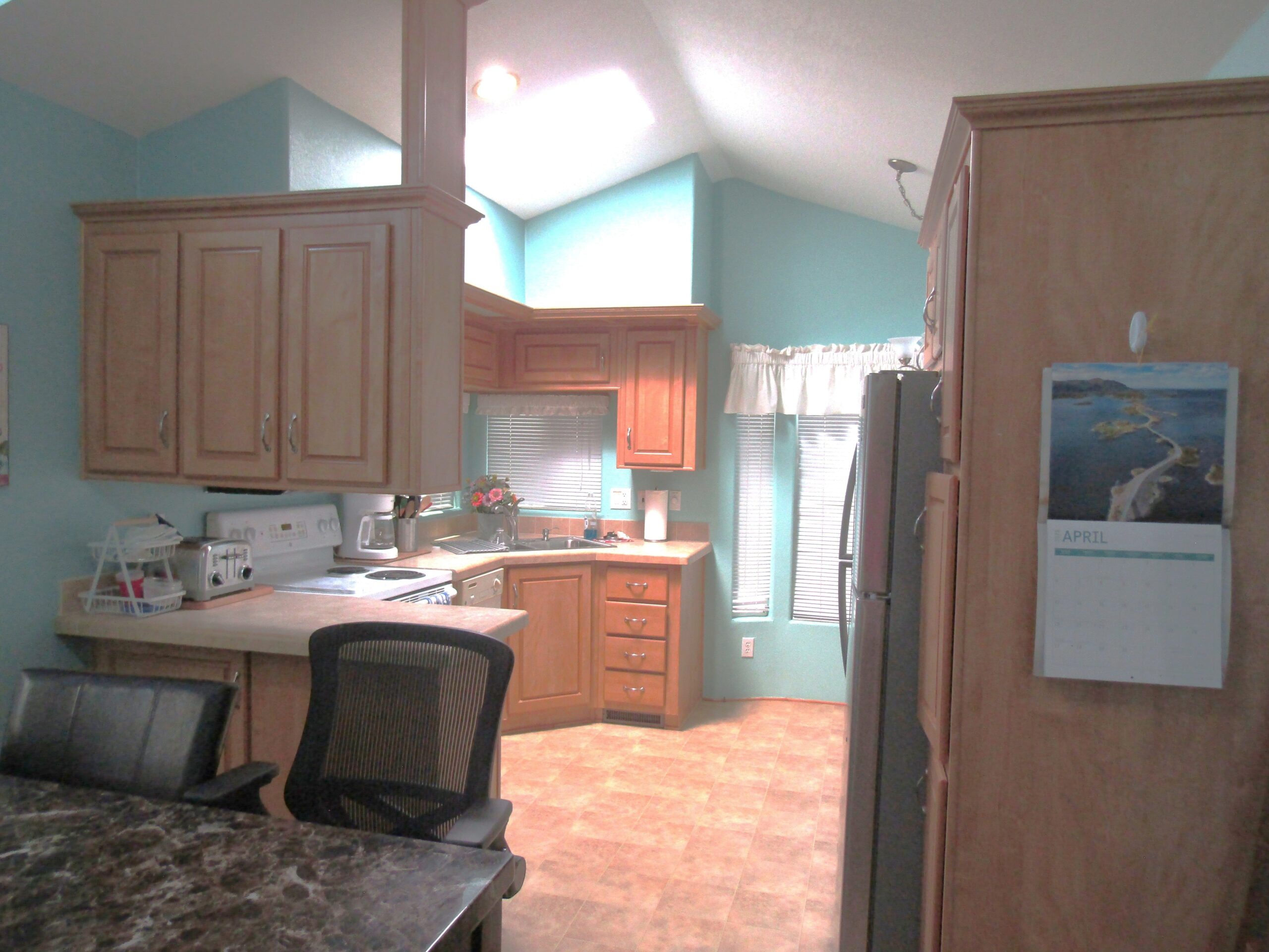 - Front/Side Kitchen w/Dishwasher, Newer SS Fridge & Microwave, Skylight, Linoleum Floor , & Dinette Area