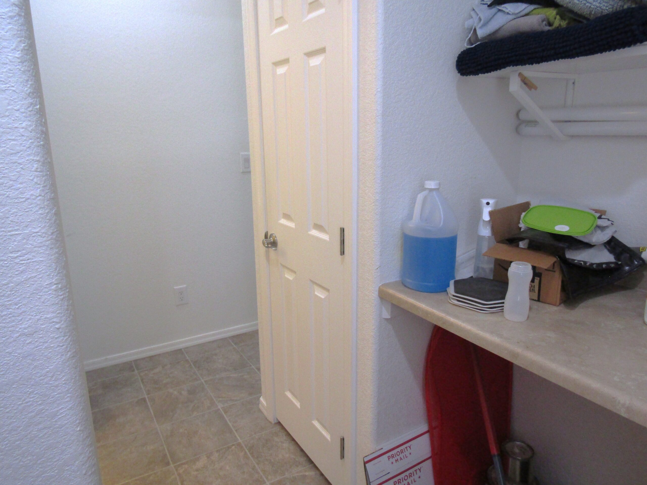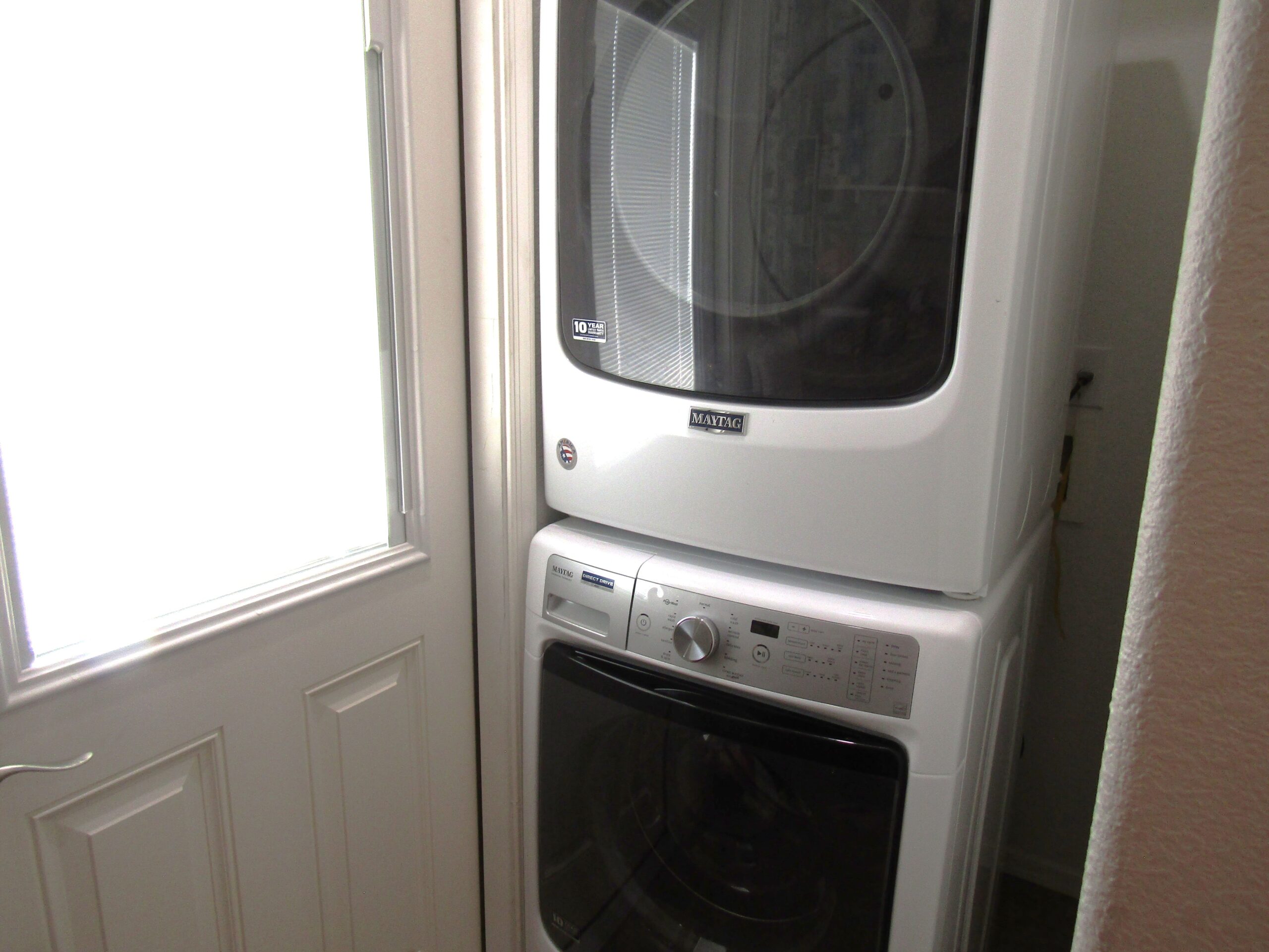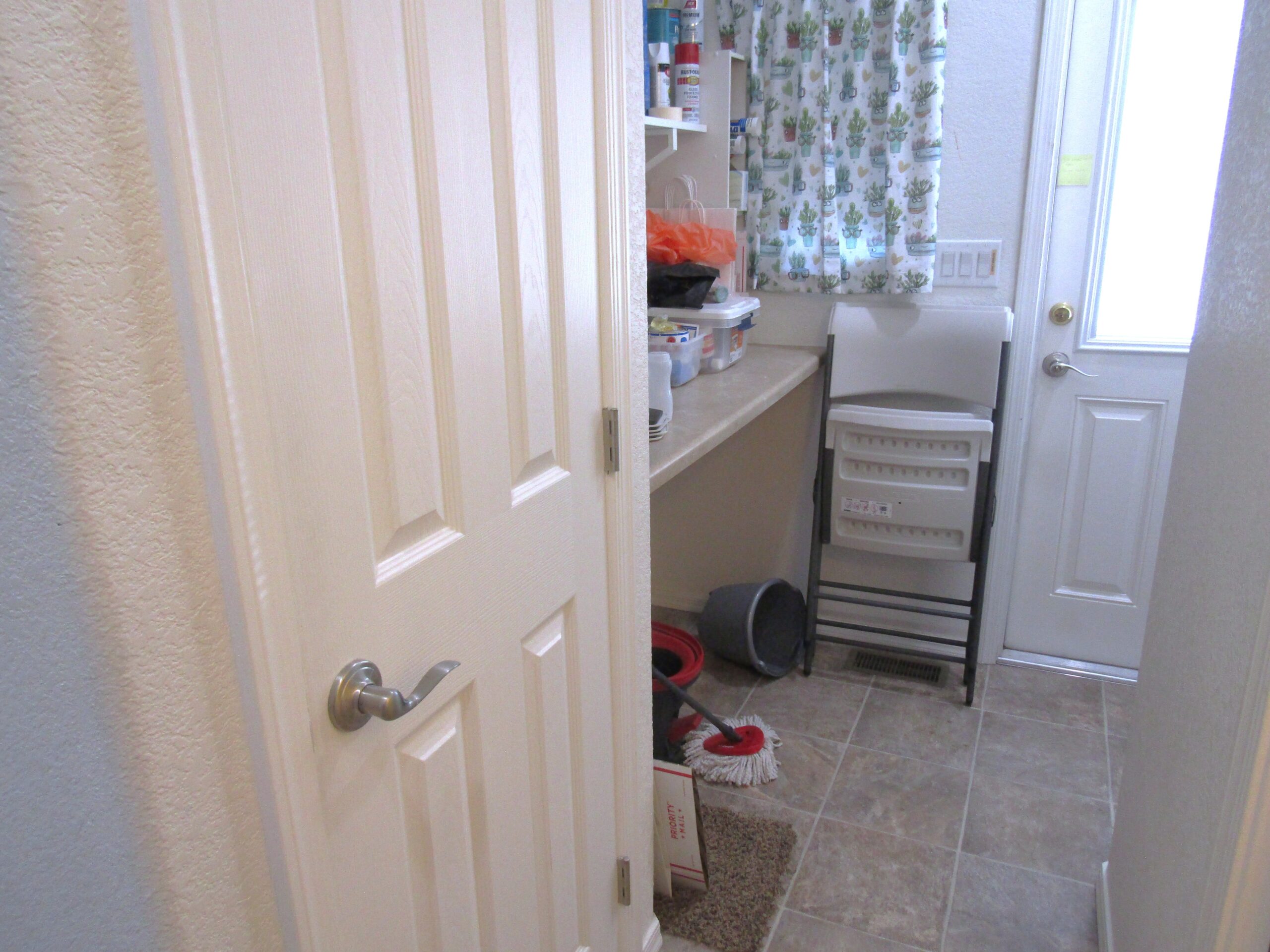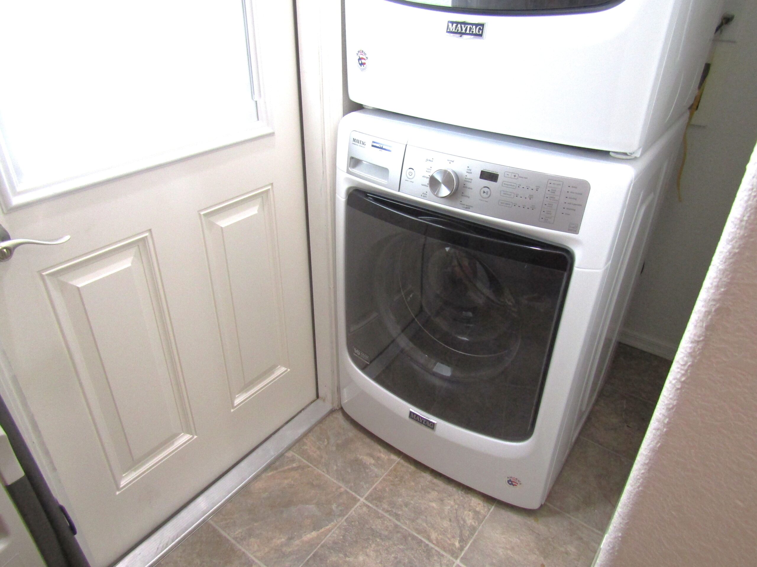 - Carpeted Raised AZ Room w/Desk Area, Hallway, 2nd 1/2 Bath, Closet, Counter/Work Area/Shelving, Back Door & Newer Full-Size Stackable Laundry, Upper Windows