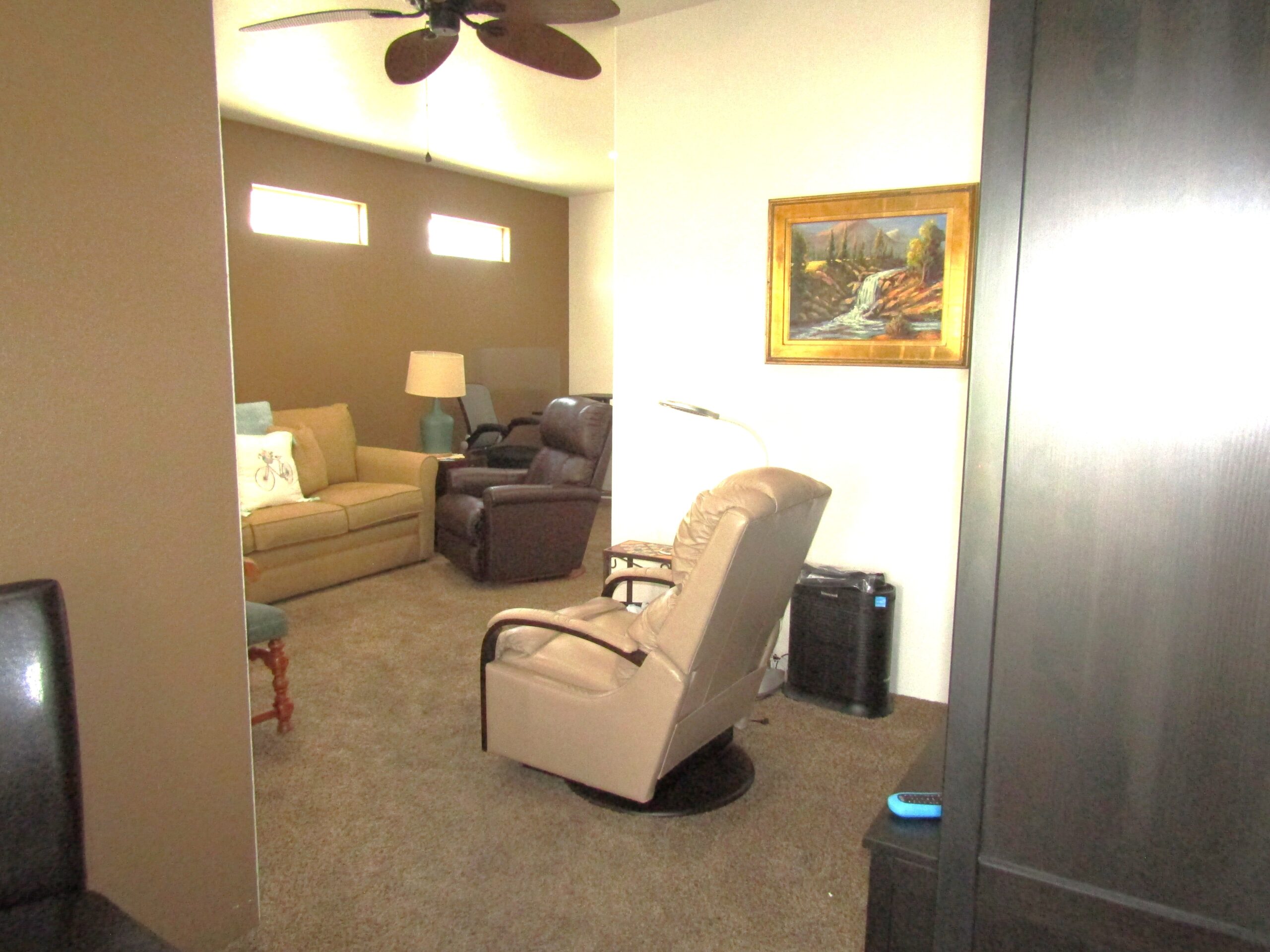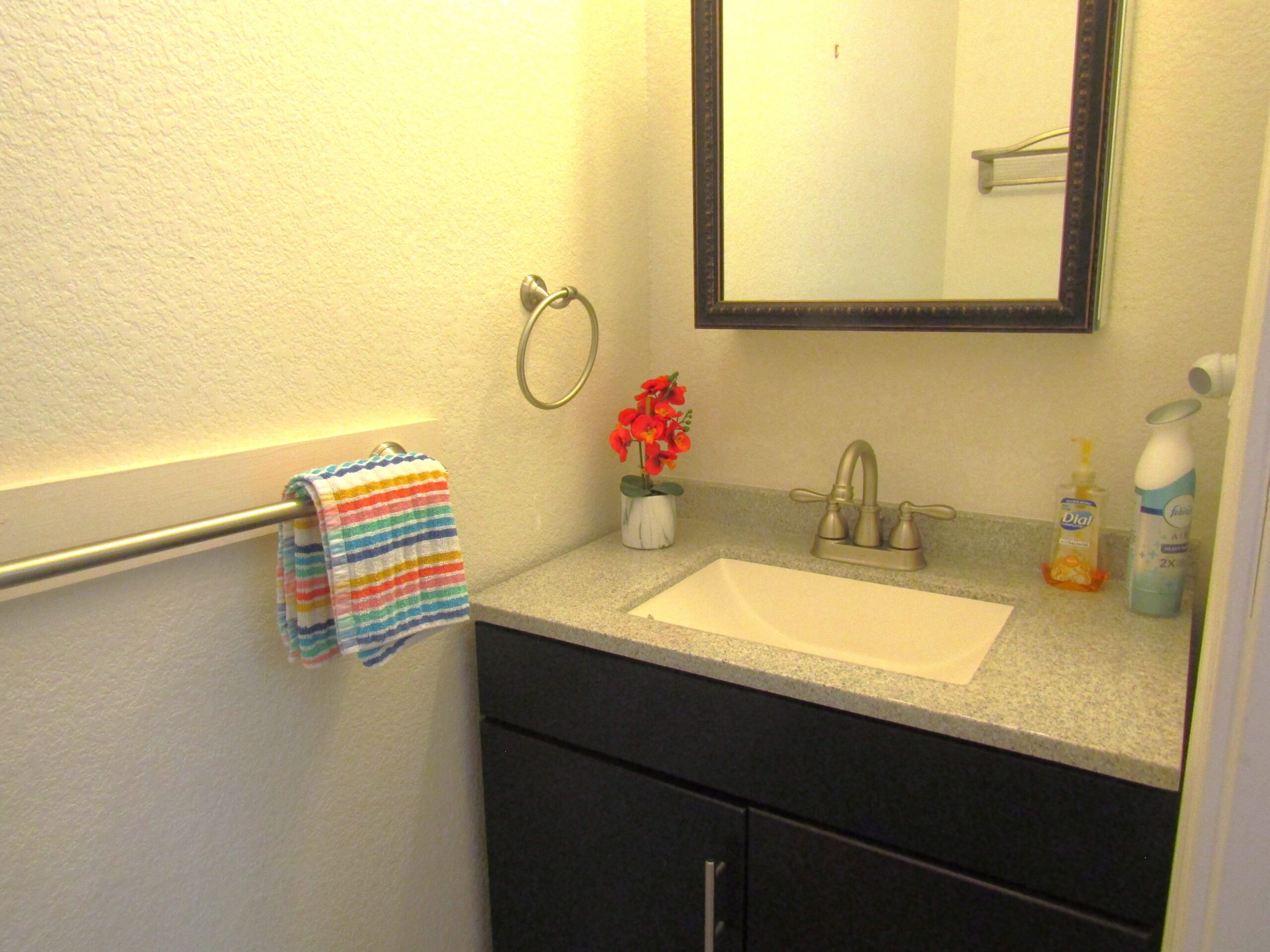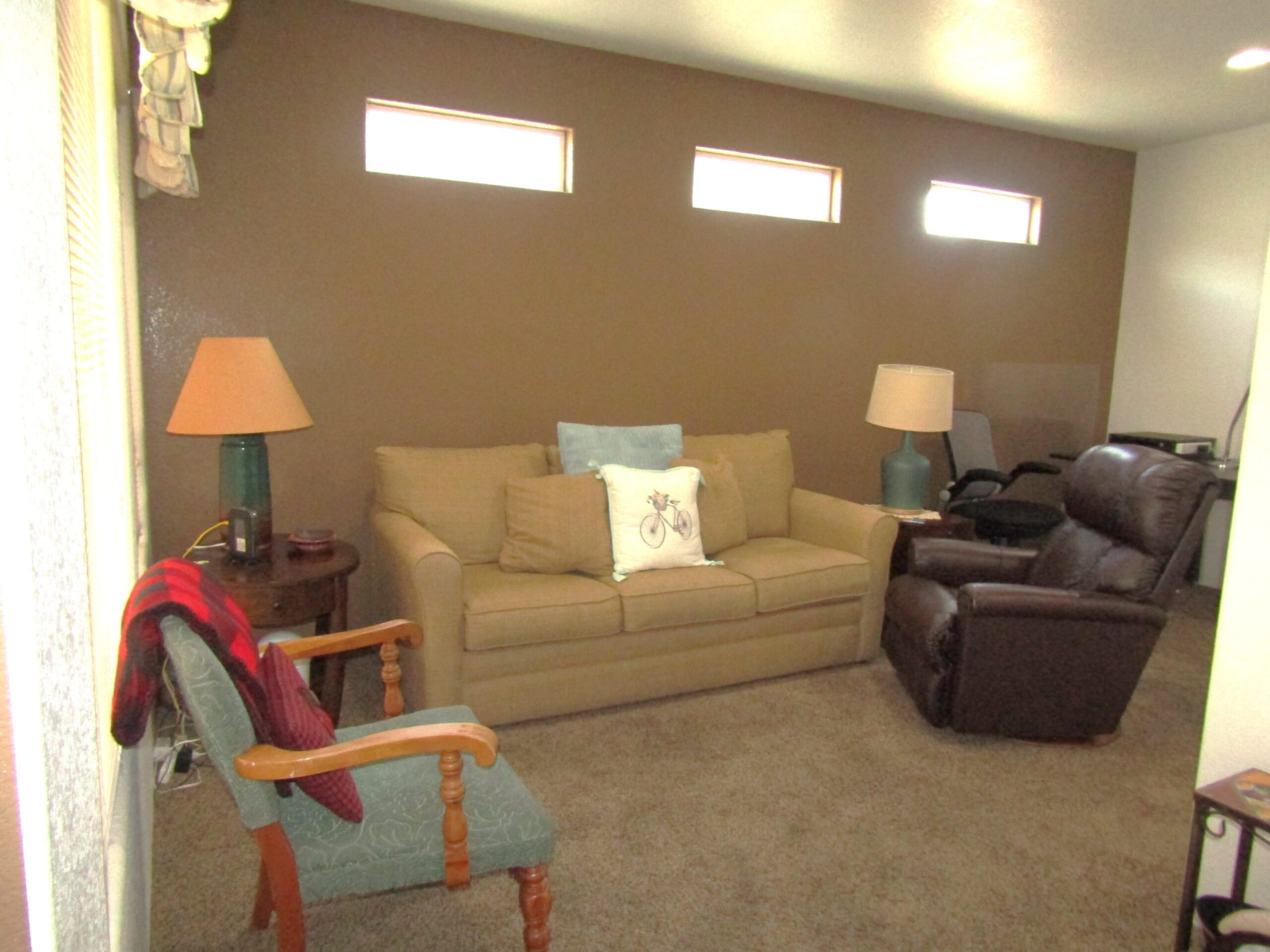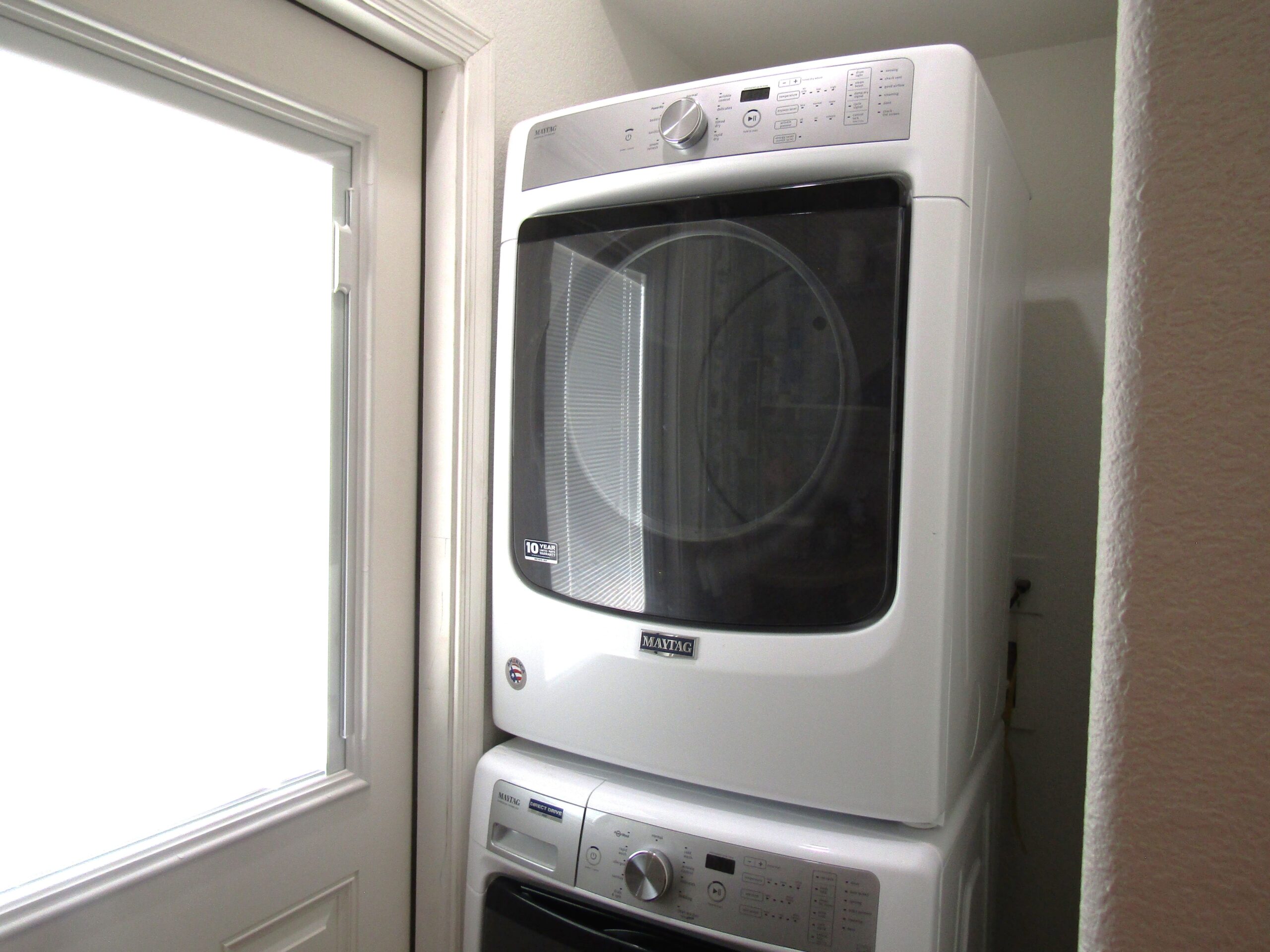 - Carpeted Raised AZ Room w/Desk Area, Hallway, 2nd 1/2 Bath, Closet, Counter/Work Area/Shelving, Back Door & Newer Full-Size Stackable Laundry, Upper Windows
