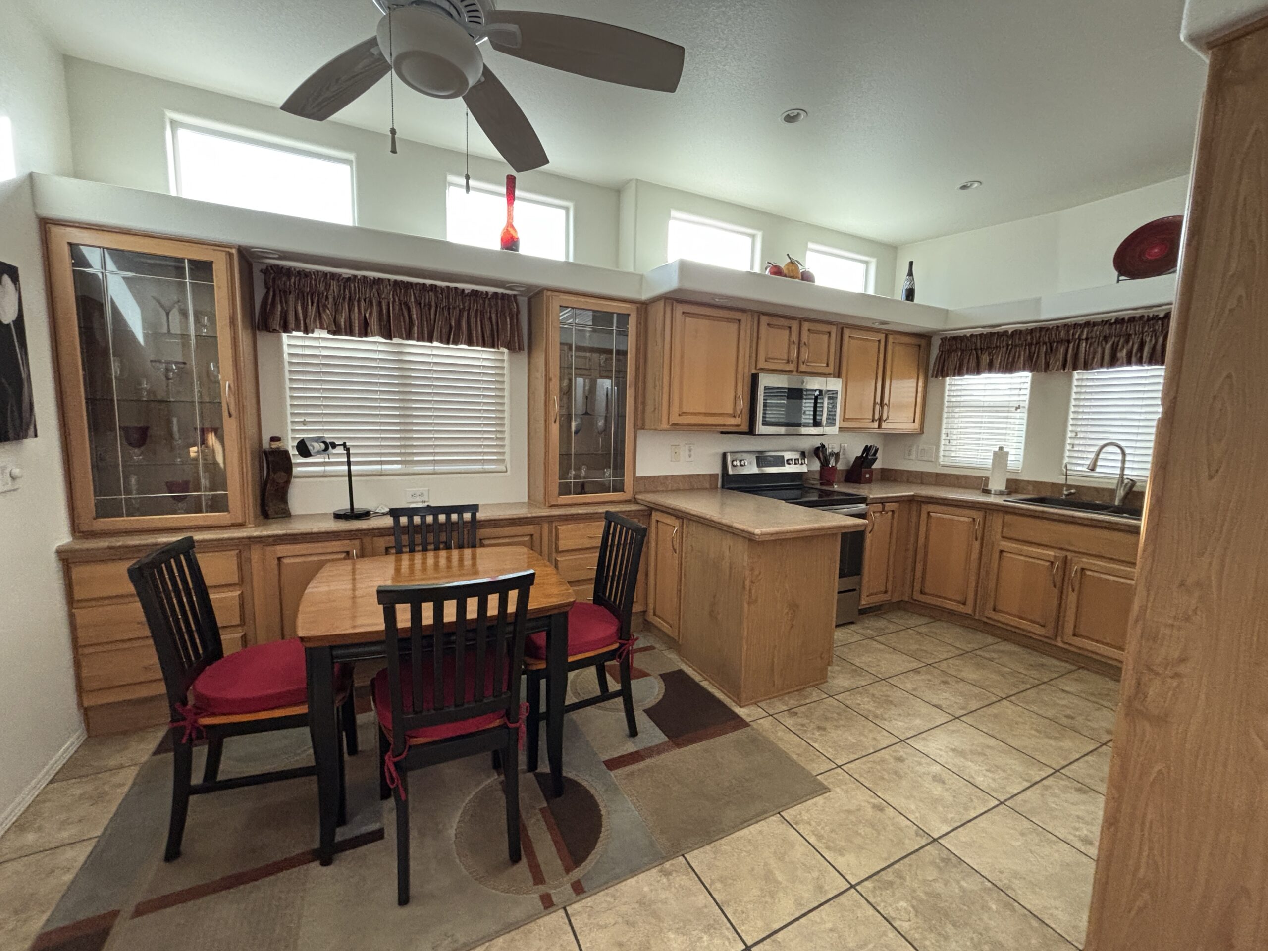 - Full Front Kitchen w/Dining Area, Stainless Appliances, Dishwasher, Built-In Microwave, Glass-Top Stove, & Tile Backsplash
