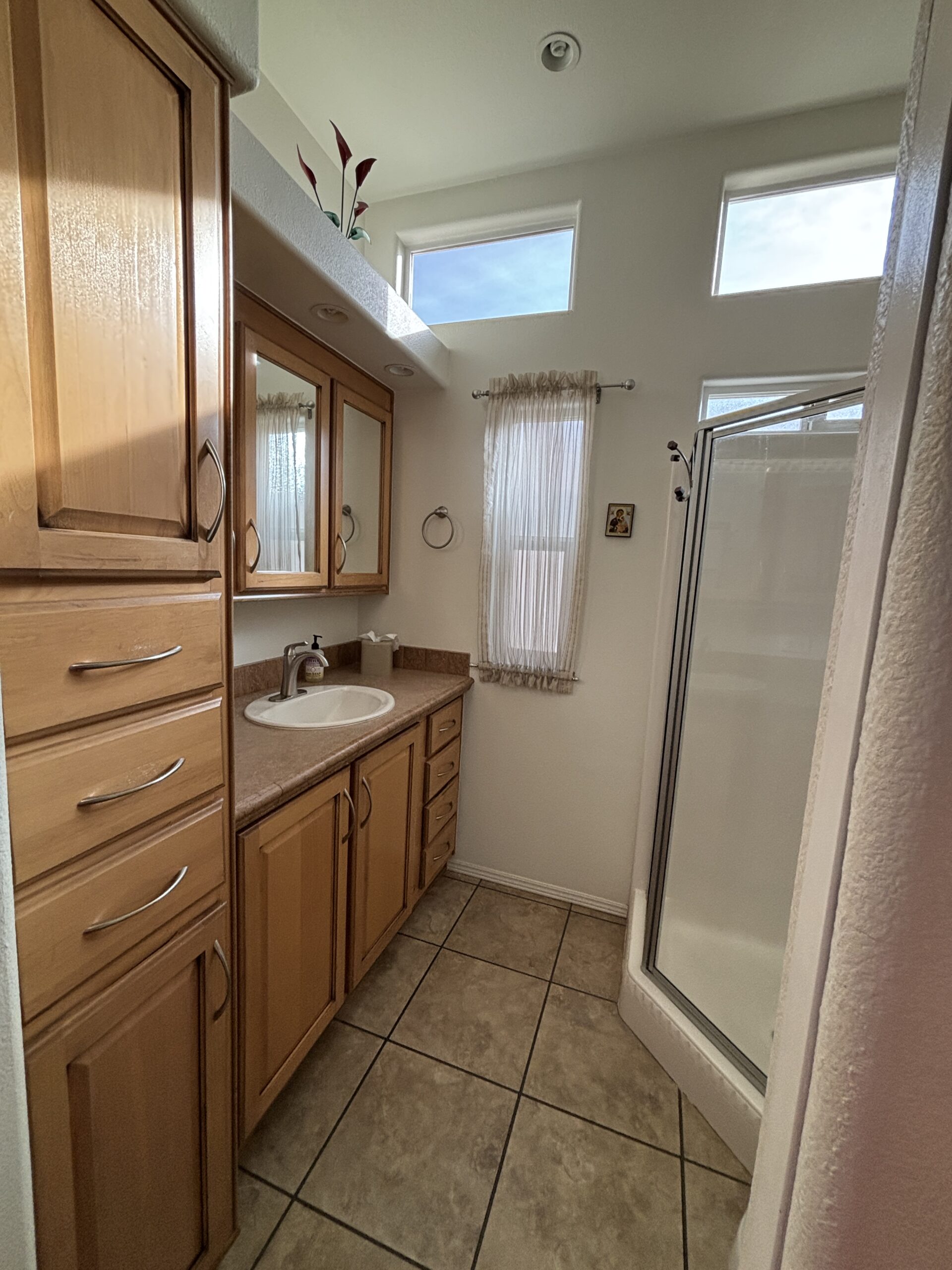 - Bathroom w/Glass Enclosure Step-In Shower, & Linen Cabinet