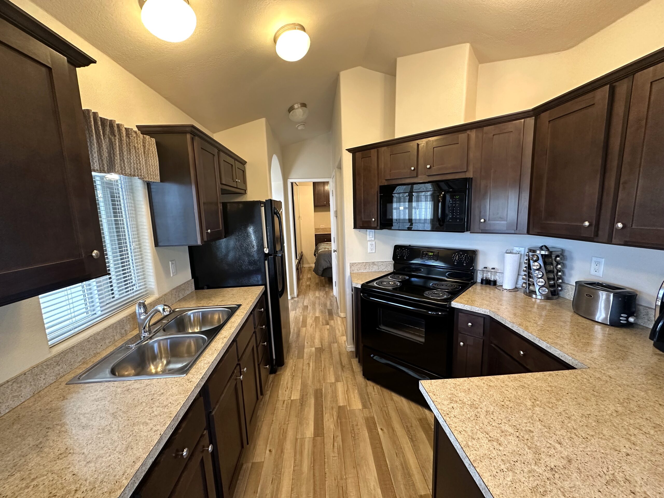 - Well maintained Galley Kitchen w/Modern Black Appliances