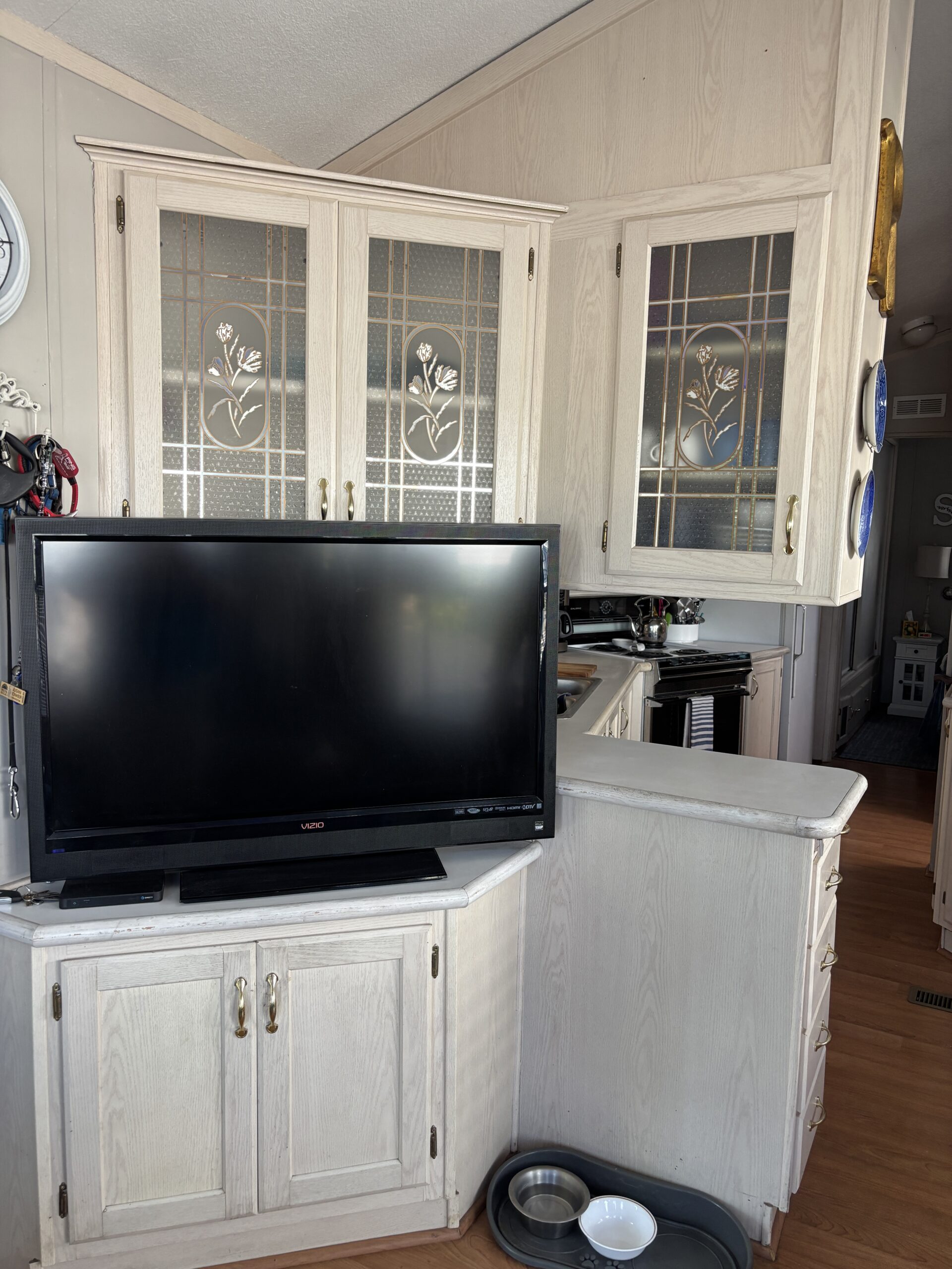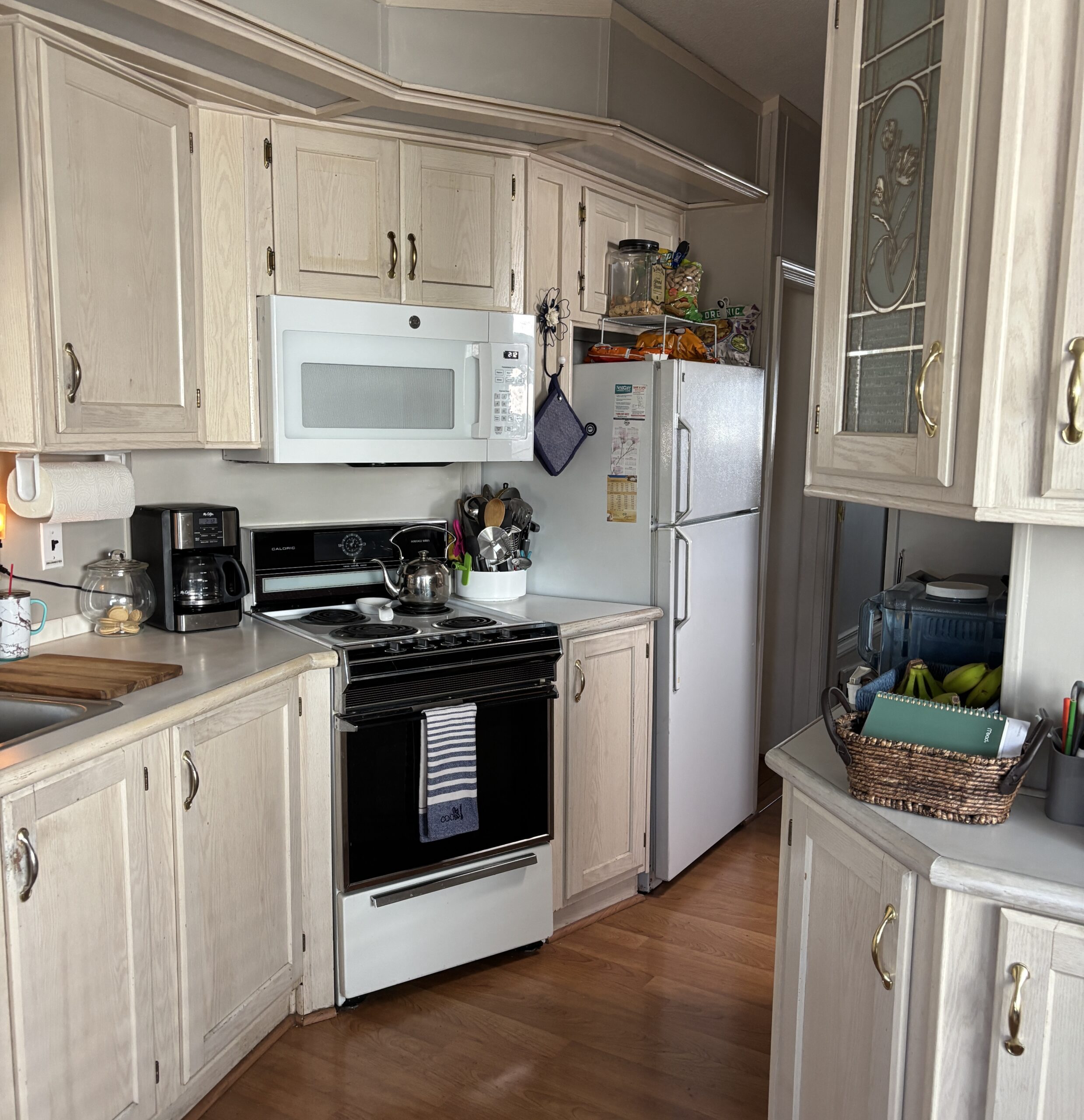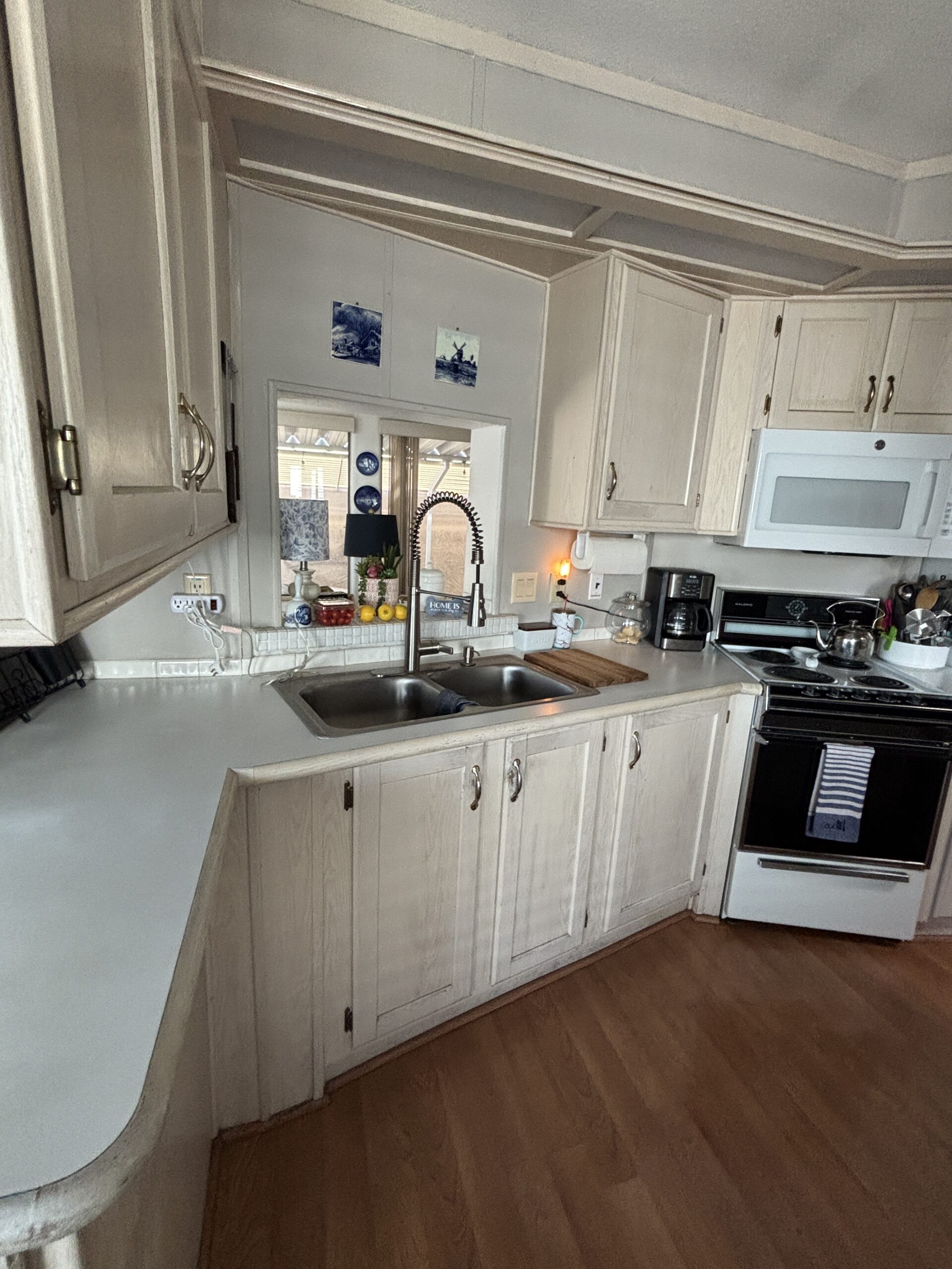 - Galley Kitchen w/Wrap Around Cabinets, New Sink, White Appliances, Built-In Microwave, Backsplash, Formica Counters, & Pantry