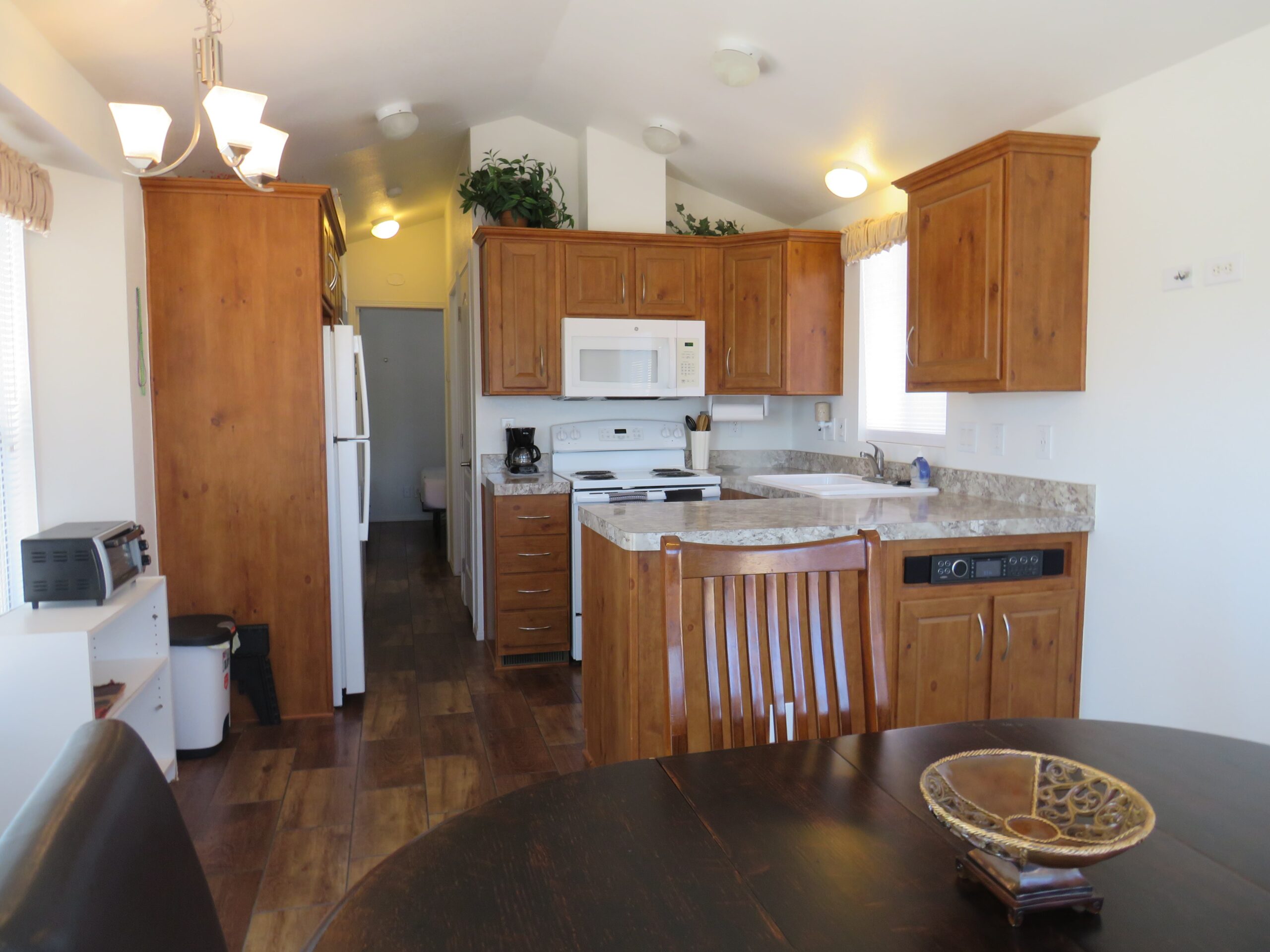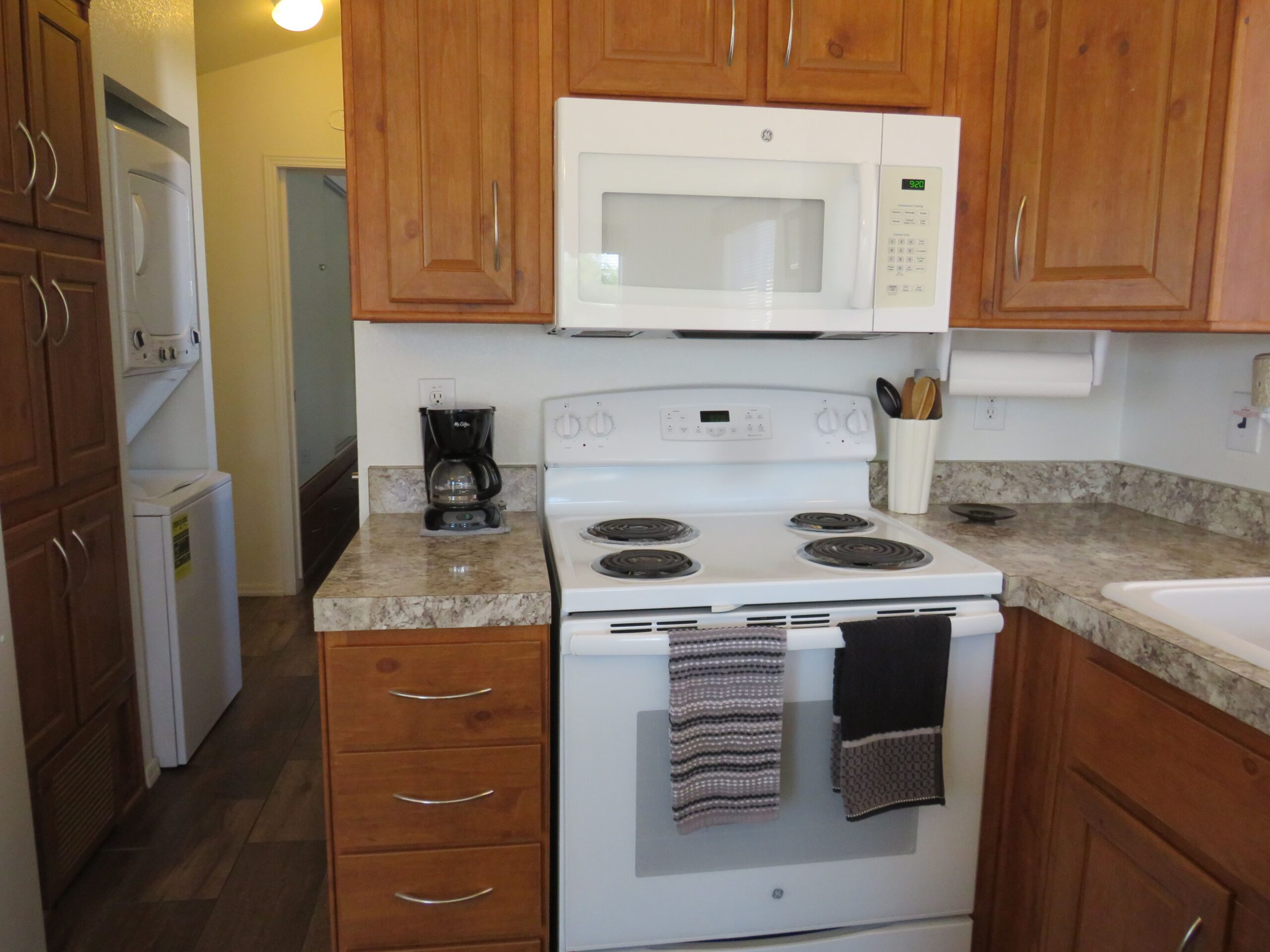 - U-Shaped Kitchen w/ Matching White Appliances, Built-In Microwave, & Entertainment Cupboard