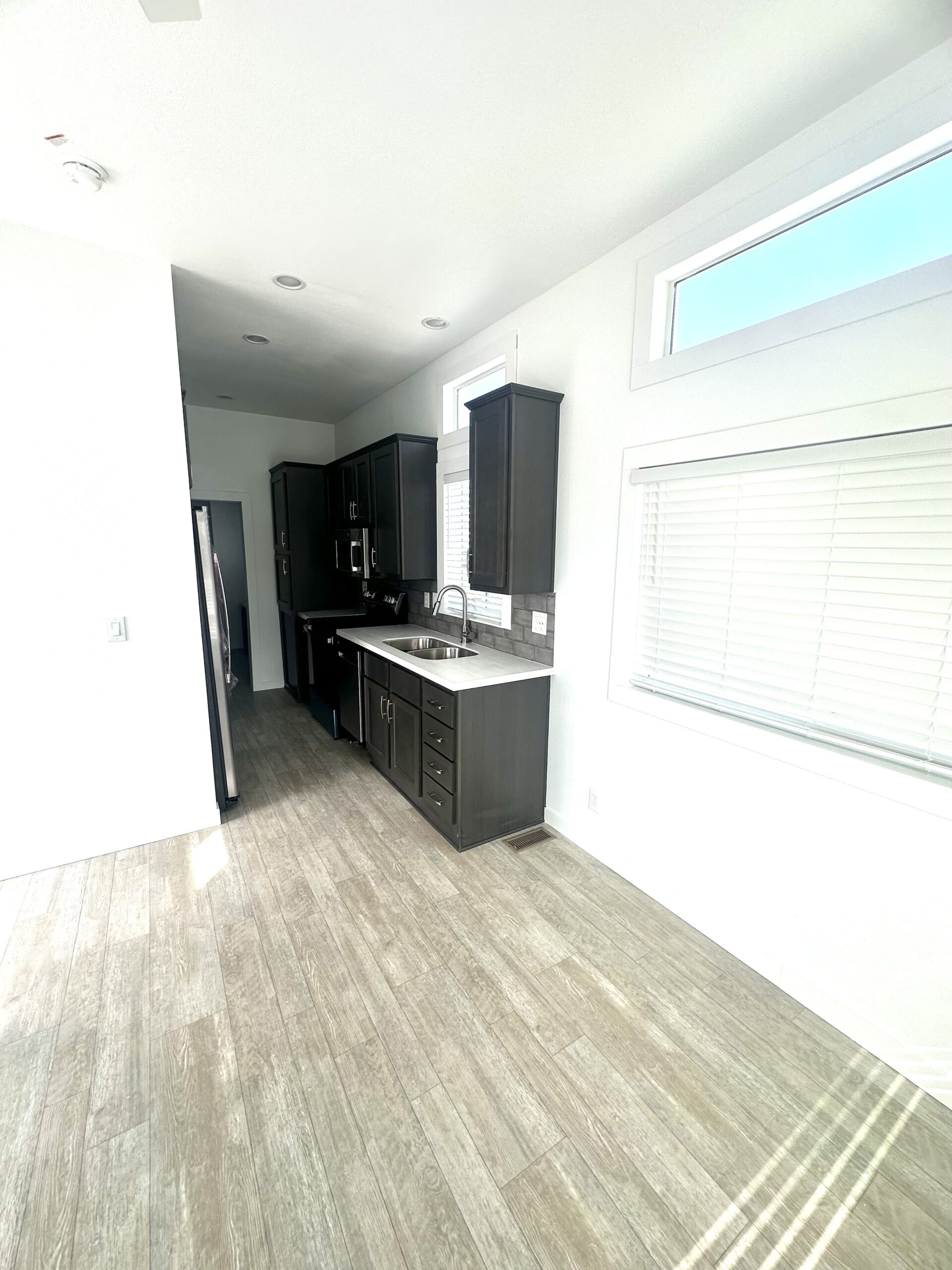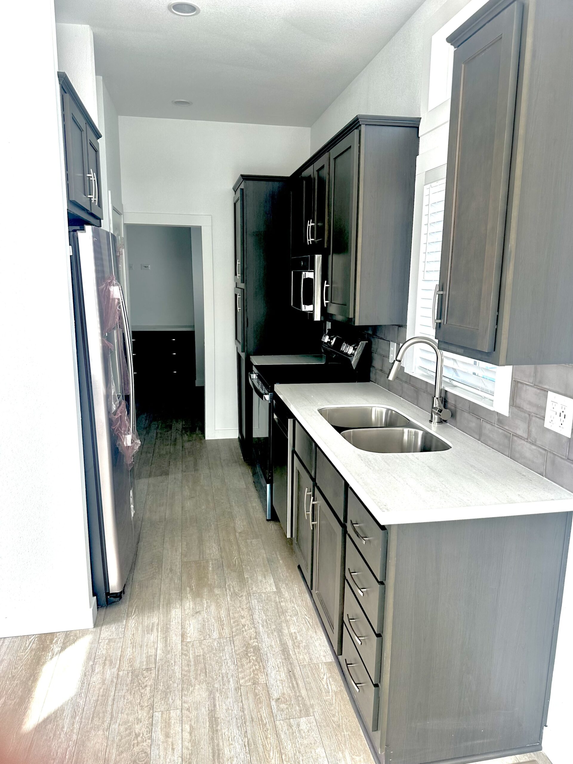 - Galley Gourmet Kitchen with 39” Cabinets, SS Appliances, Dishwasher, 22CF Side-By-Side Fridge, Smooth Top Range, Solid Surface Countertops, Tile Backsplash, & Garbage Disposal