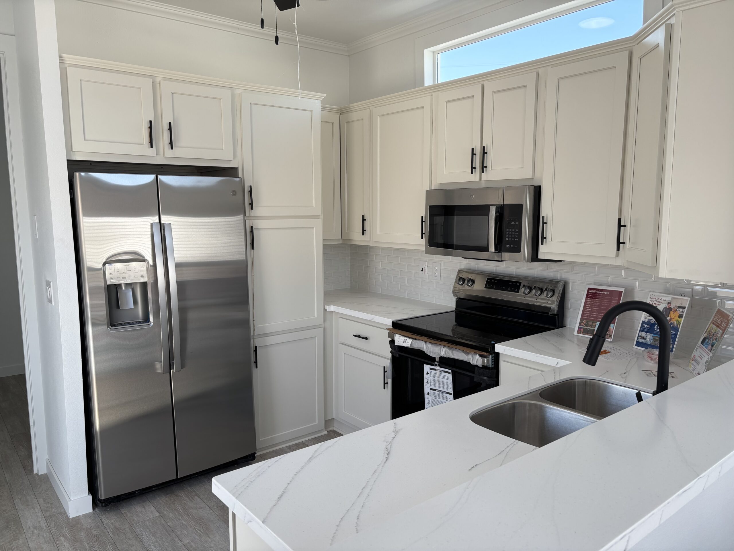 - Middle Gourmet U-Kitchen with 39” Cabinets, SS Appliances, Dishwasher, 22CF Side-By-Side Fridge, Smooth Top Range, Loose Island, Solid Surface Countertops, Tile Backsplash, Lazy Susan, & Garbage Disposal
