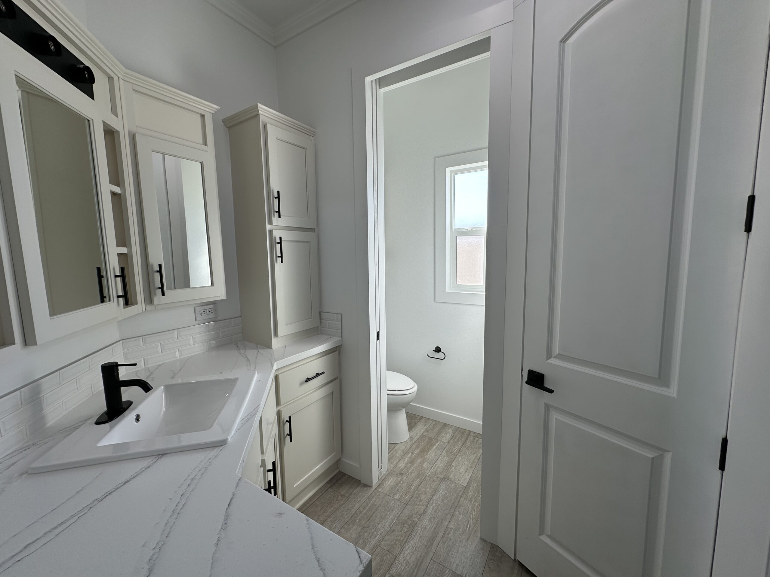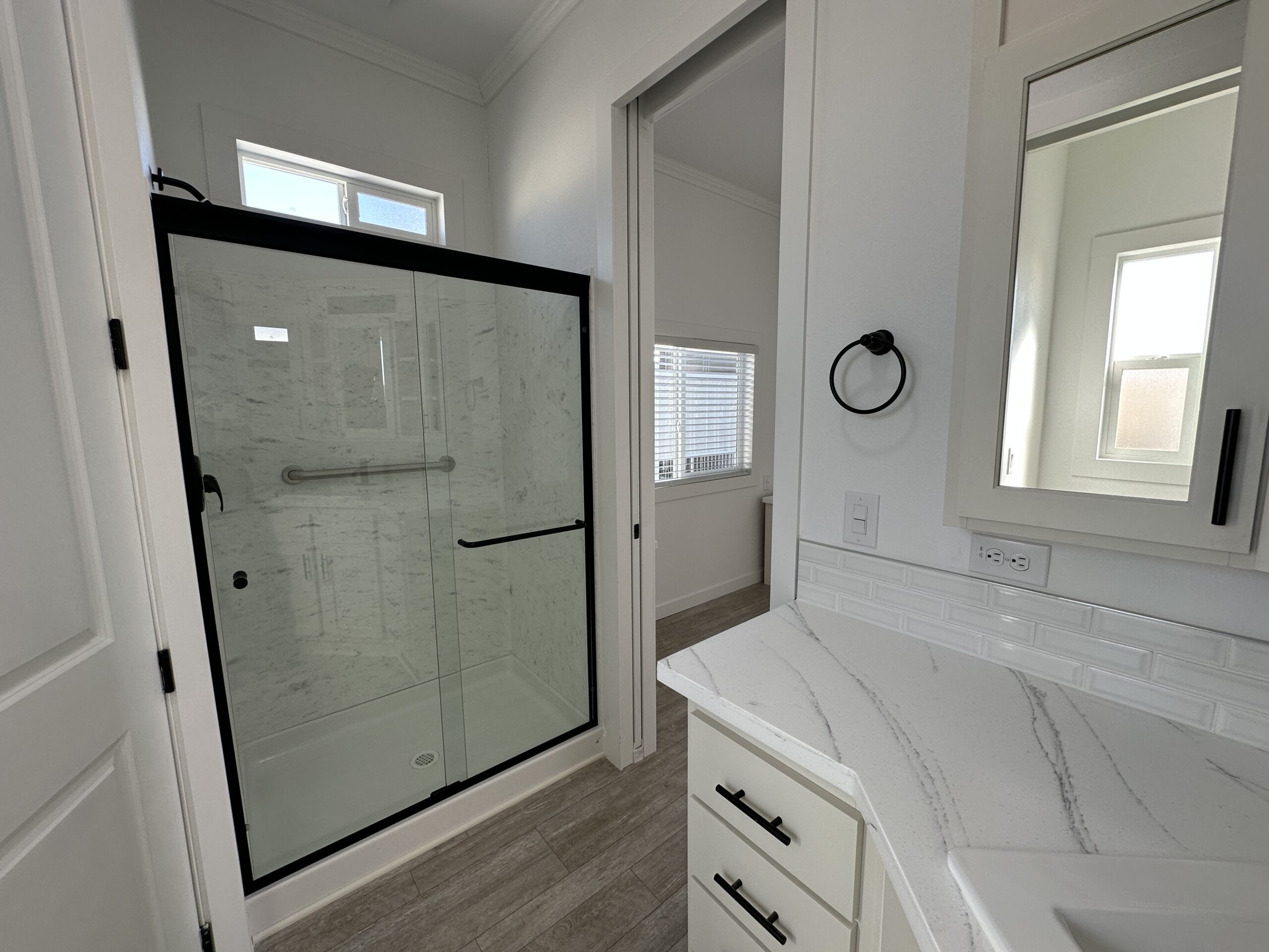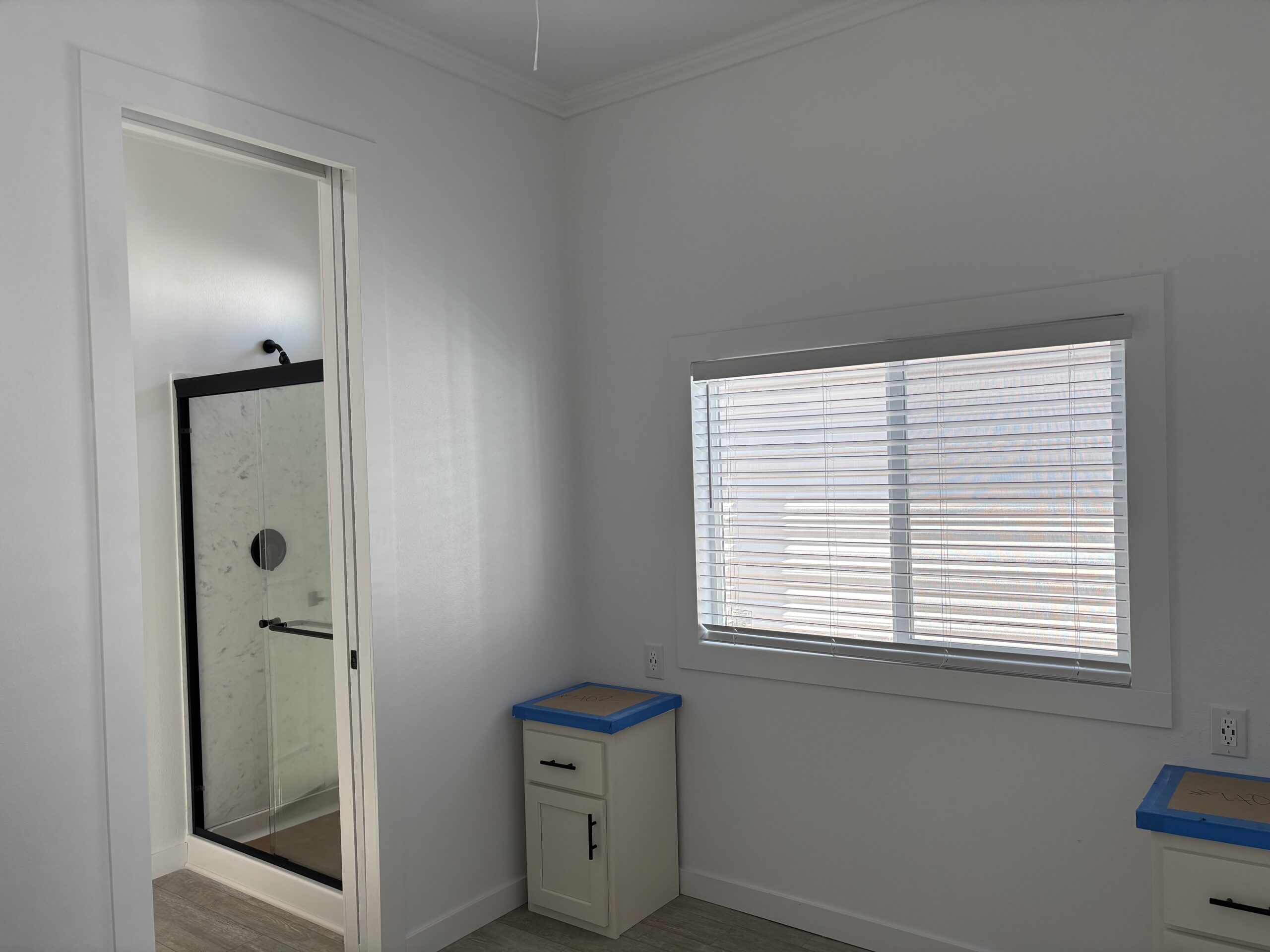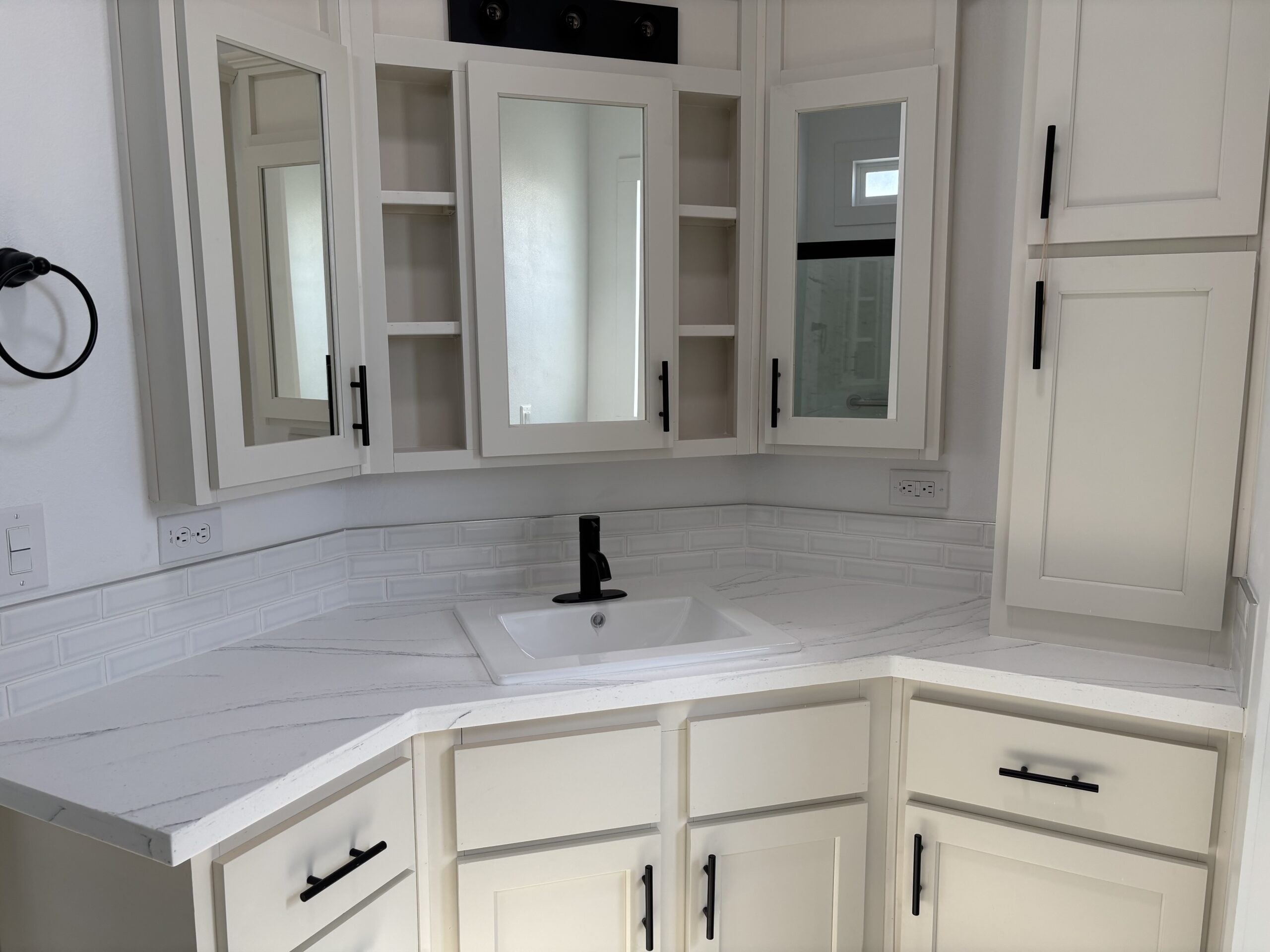 - Rear Bath with Step-In Shower, Large Vanity w/Cupboards & Drawers, & Solar Tube