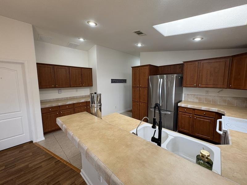 The kitchen has ample cabinetry and counter space and has a wonderful skylight that adds beautiful natural light to the space.