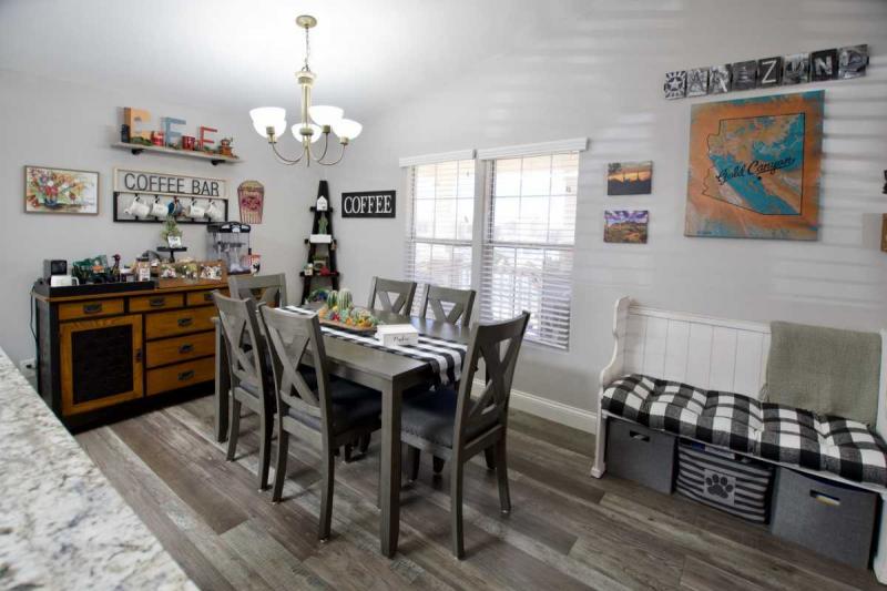 LUXURIOUSLY UPDATED 2 bedroom, 2 bathroom home. You will fall in love with the stunning views of the Superstition Mountains from the front porch. From the moment you enter you will be delighted by the bright and inviting CUSTOM kitchen, which features gorgeous granite counters, stainless steel appliances, slide-out pantry shelfs and soft-close drawers and cabinets and a wine refrigerator!