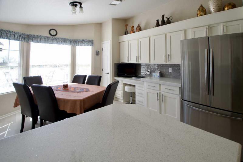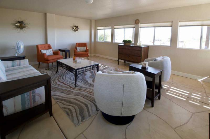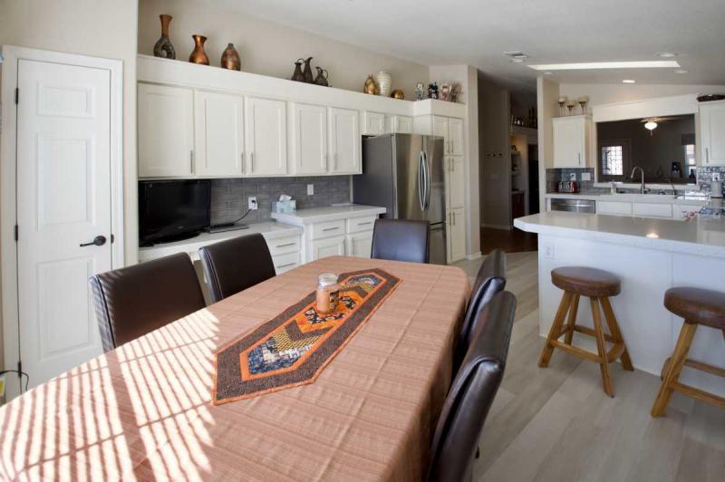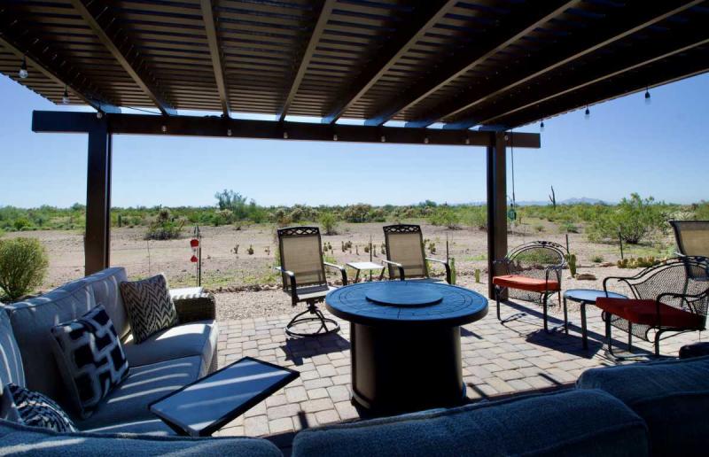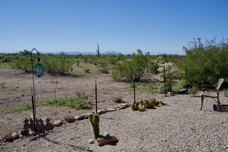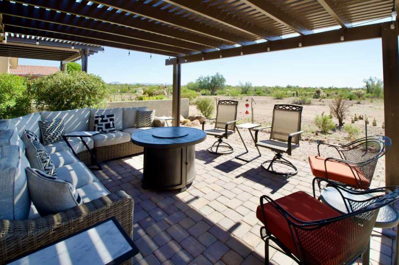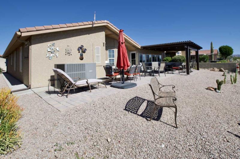 The home features easy-care vinyl plank flooring with a wood-look finish, a split floor plan for privacy with a front guest bedroom and rear master suite, and a charming front porch, perfect for morning coffee. Out back, relax on the rear porch or in the Arizona Room overlooking the desert, offering peaceful views and a true Arizona vibe.