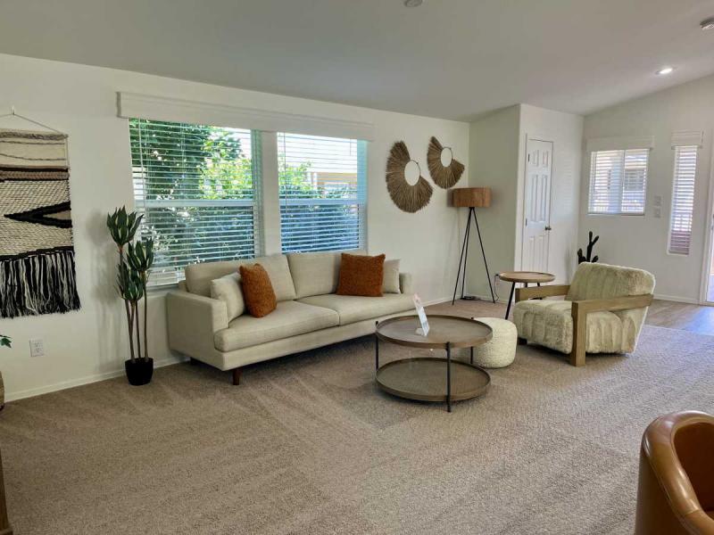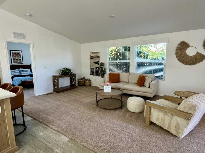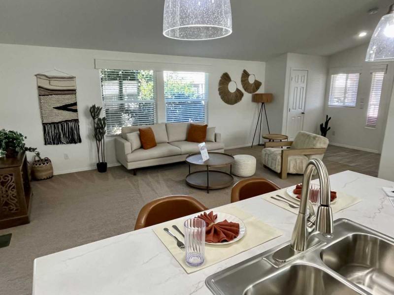 Price cut = buyer opportunities! Hot listing, now at a cooler price. Prime location – close to community center! As you step inside this 2 bedroom 2 bath beauty, you are greeted by an open-concept floor plan that seamlessly connects the living, dining, and kitchen areas, creating a spacious environment perfect for both family living and entertaining. The gourmet kitchen features high-end stainless steel appliances, pendant lighting, a large center island, and ample cabinetry for all your storage needs. A charming second bedroom provides versatile space that can be tailored to your needs. The luxurious master suite is a true retreat, complete with a walk-in closet and en-suite bathroom that boasts dual vanities and a separate glass-enclosed shower with bench. NEW ENERGY EFFICIENT DUAL PANE WINDOWS! NEW carpet. NEW laminate flooring. NEW fixtures. NEW lighting. NEW water heater. NEW roof! Energy efficient home with textured drywall and cathedral ceilings. Brand new furnishings are yours if you want them!