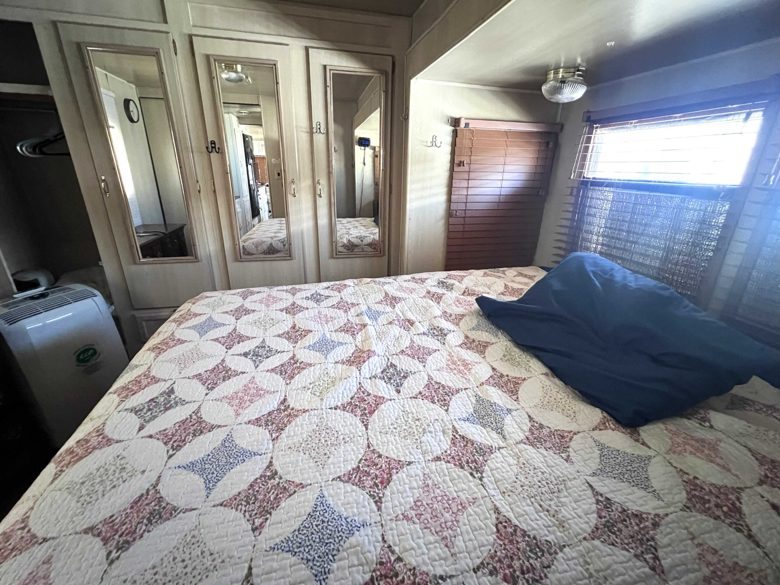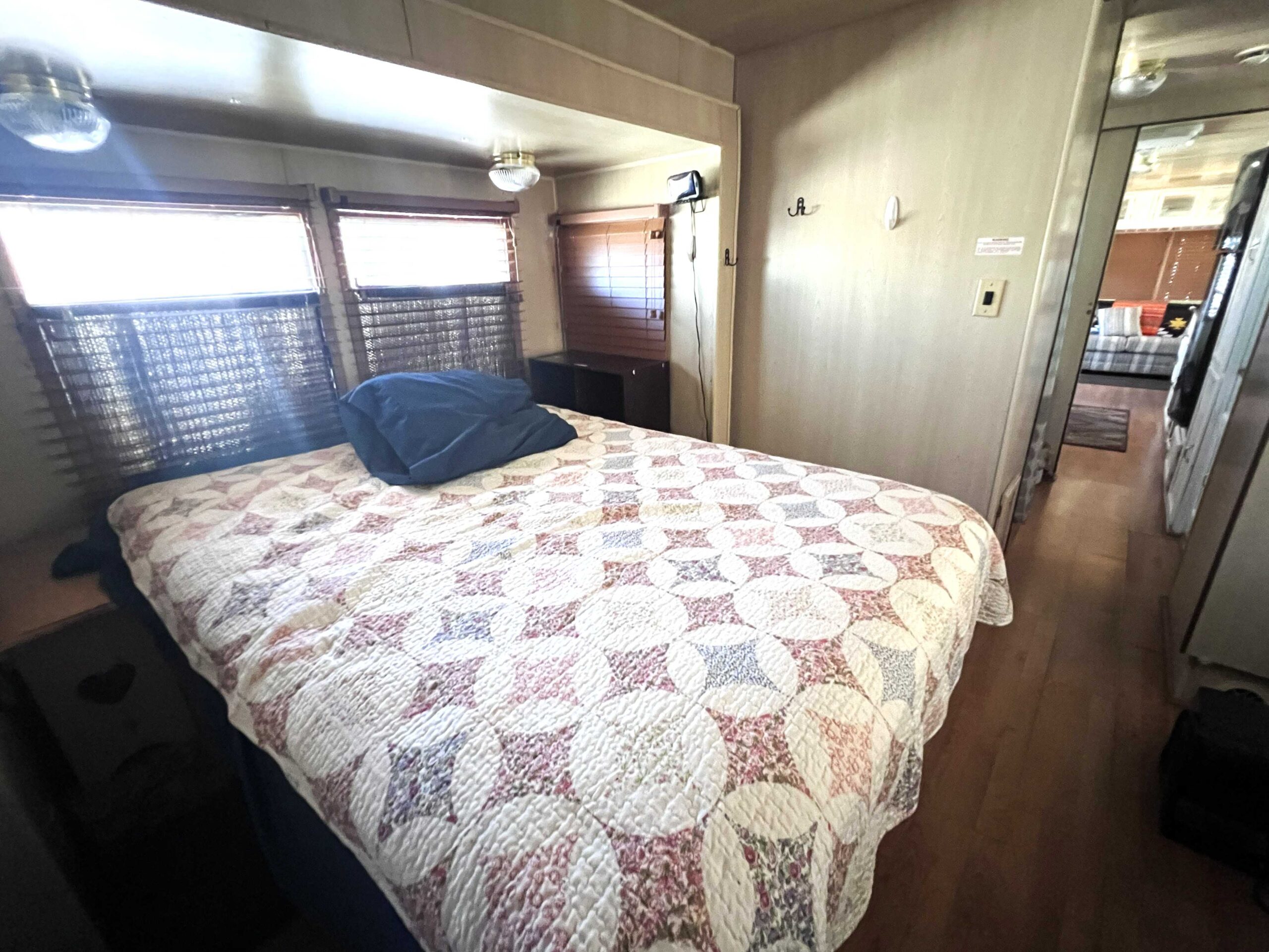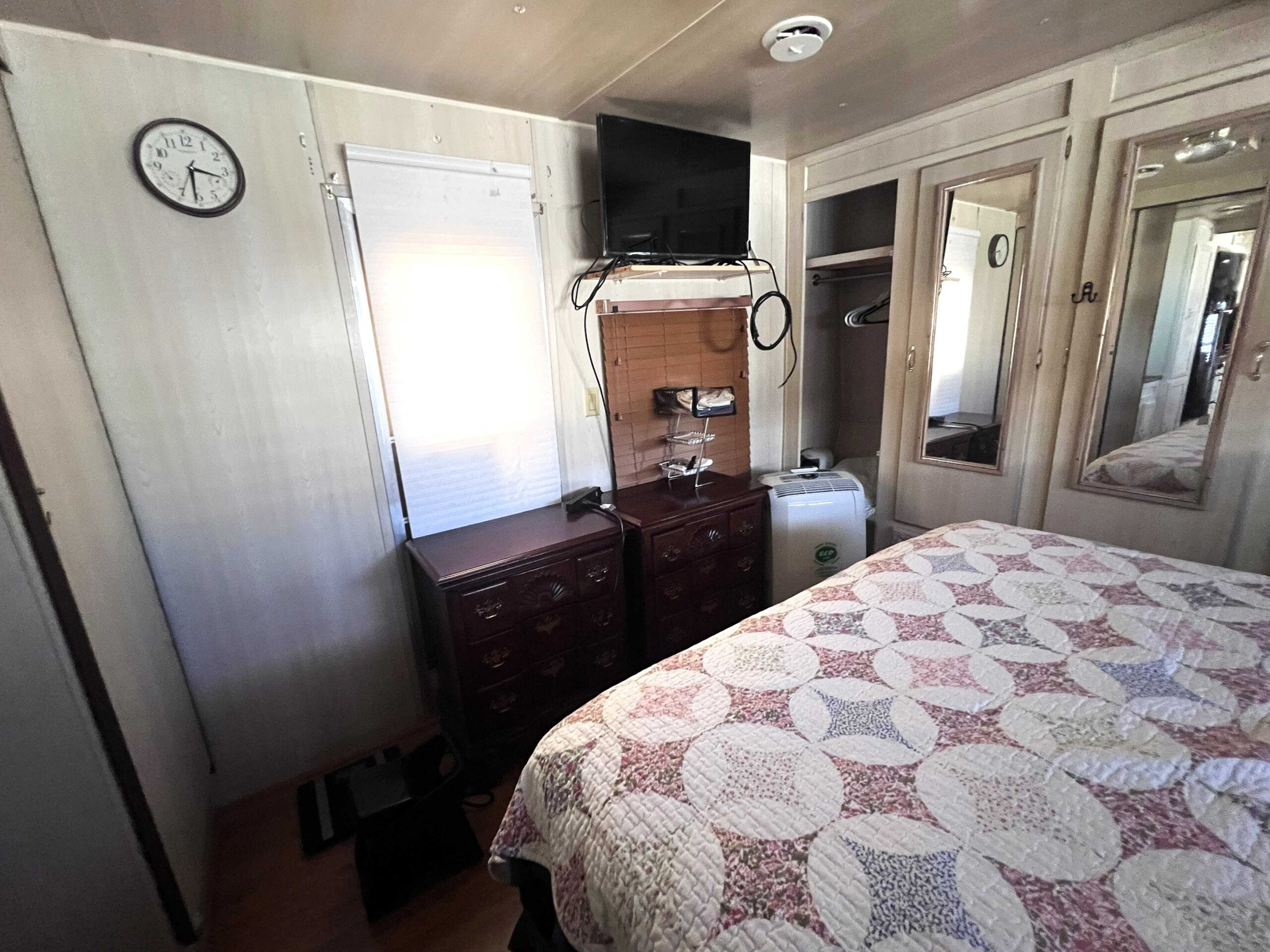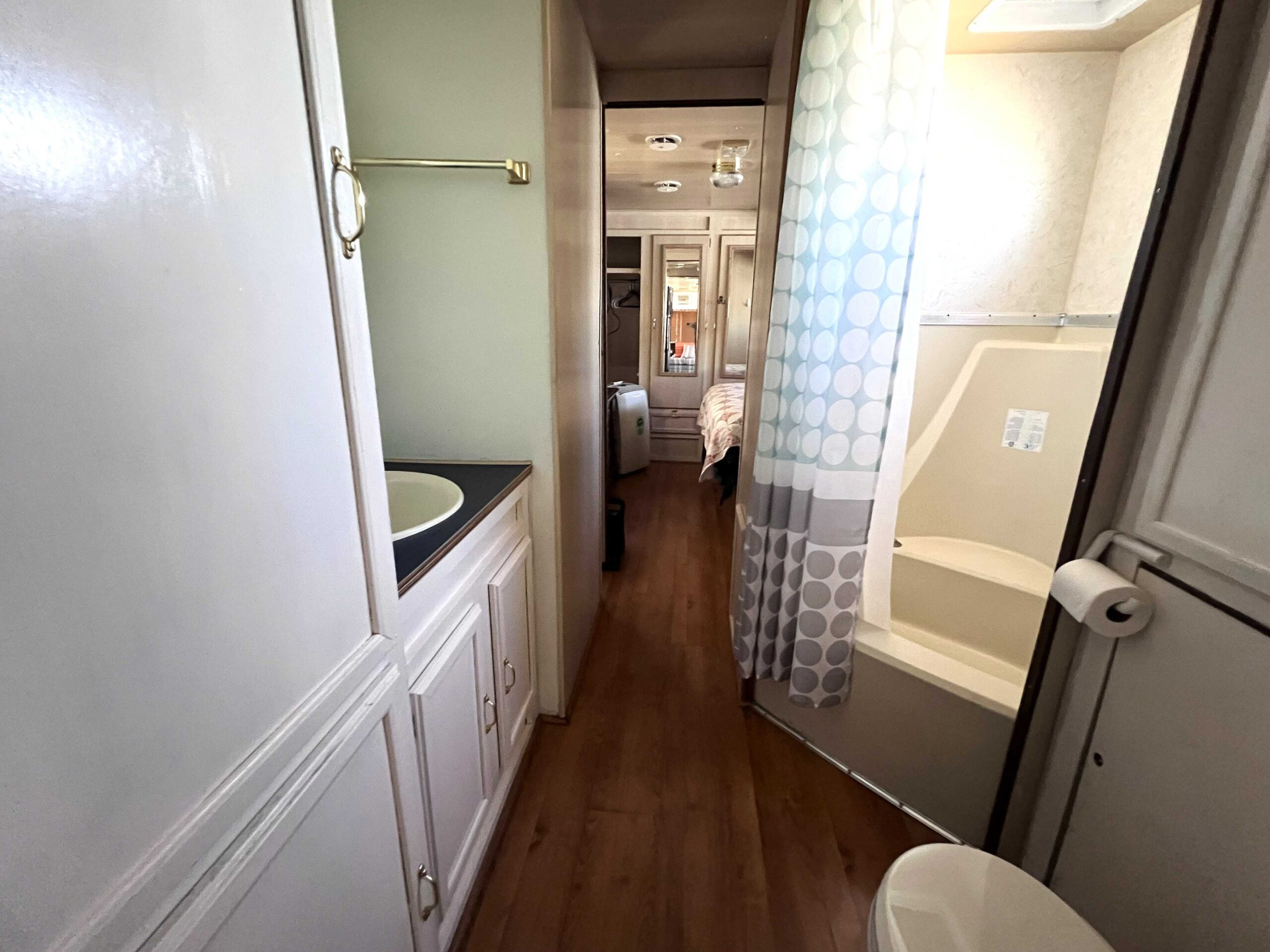- Spacious restroom with 2 access doors, shower/tub, and plenty of storage
