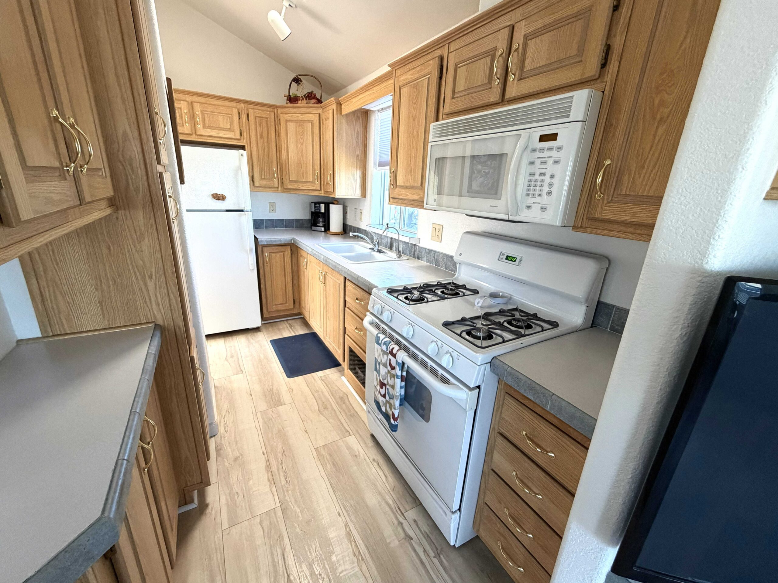 - Kitchen with all white appliances; gas stove, over the range microwave, and fridge