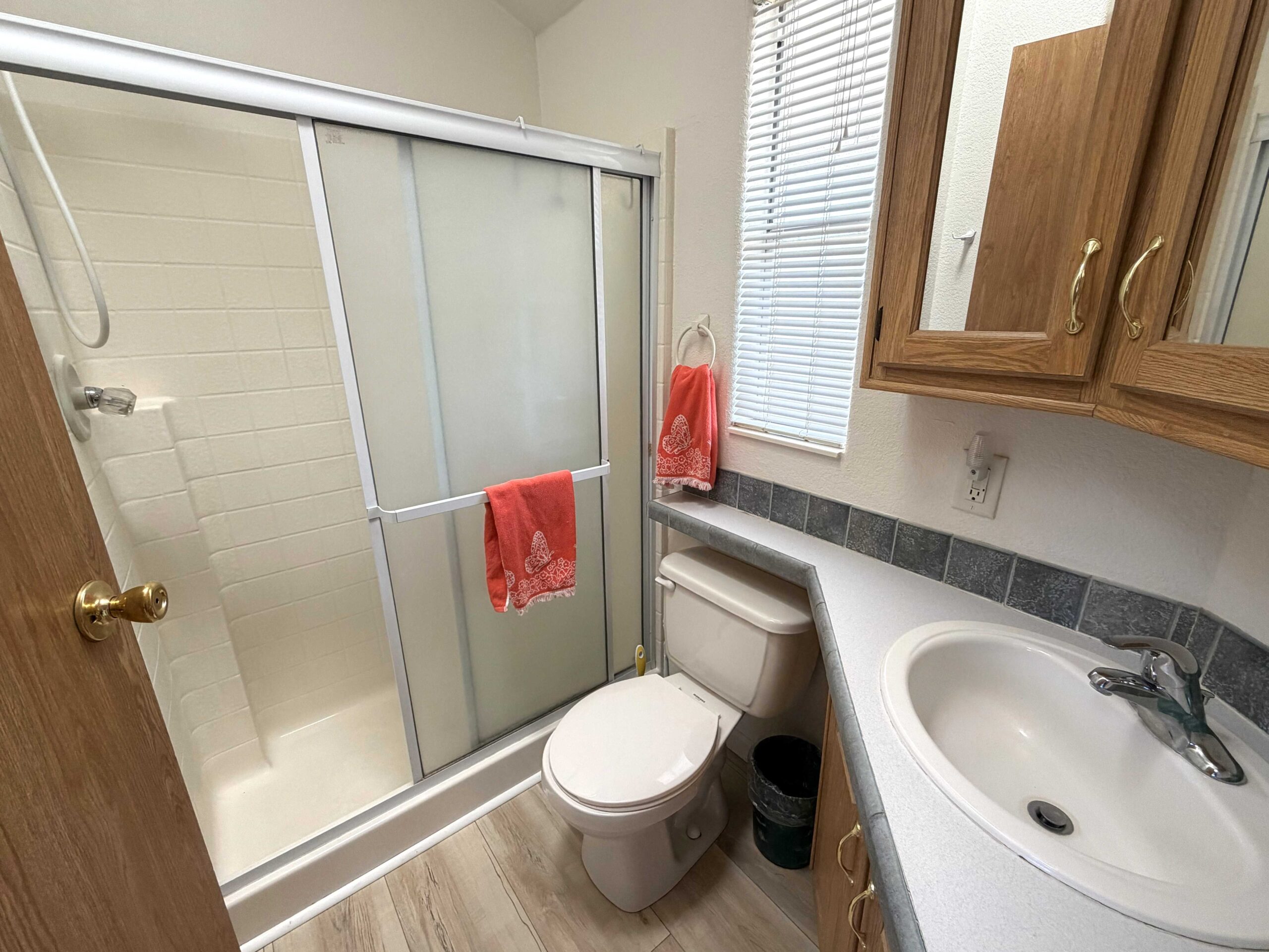 - Private bathroom with walk-in shower and sliding glass door.