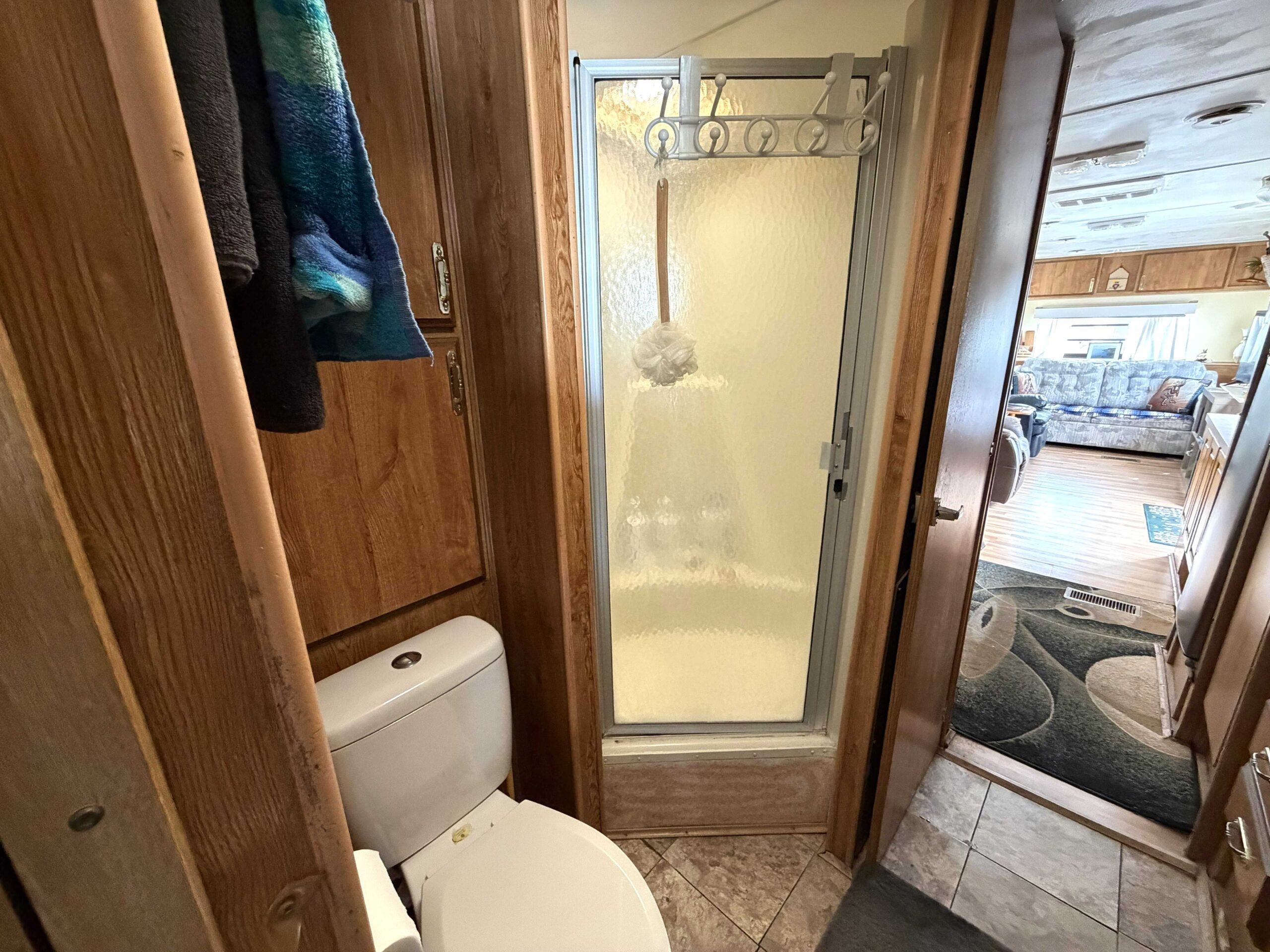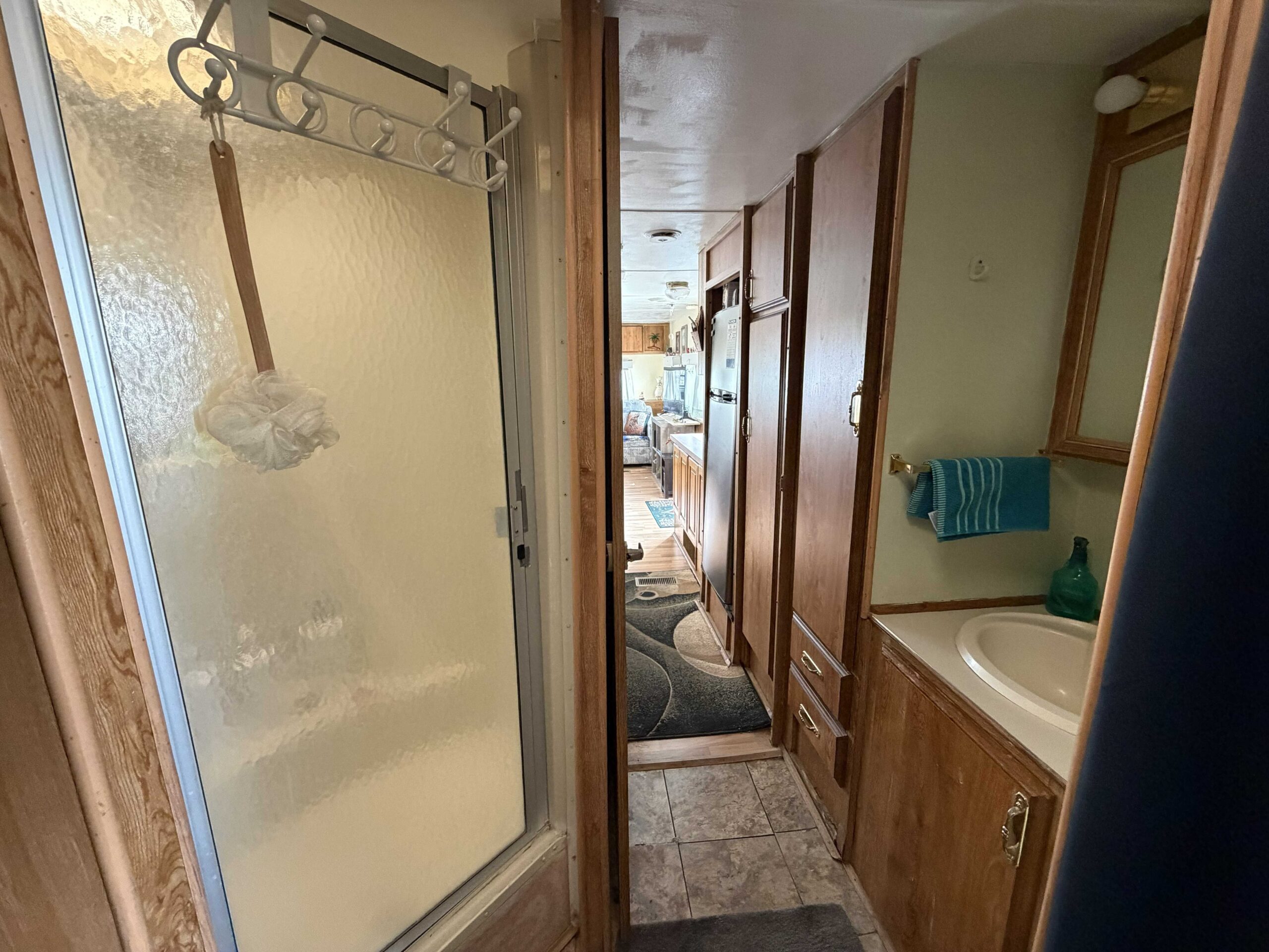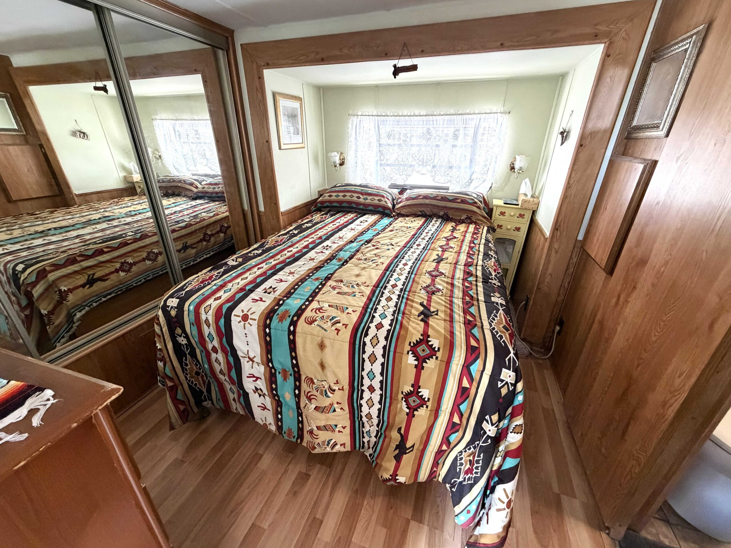 - Bedroom offers a bed with additional storage, big closet, and access to porch