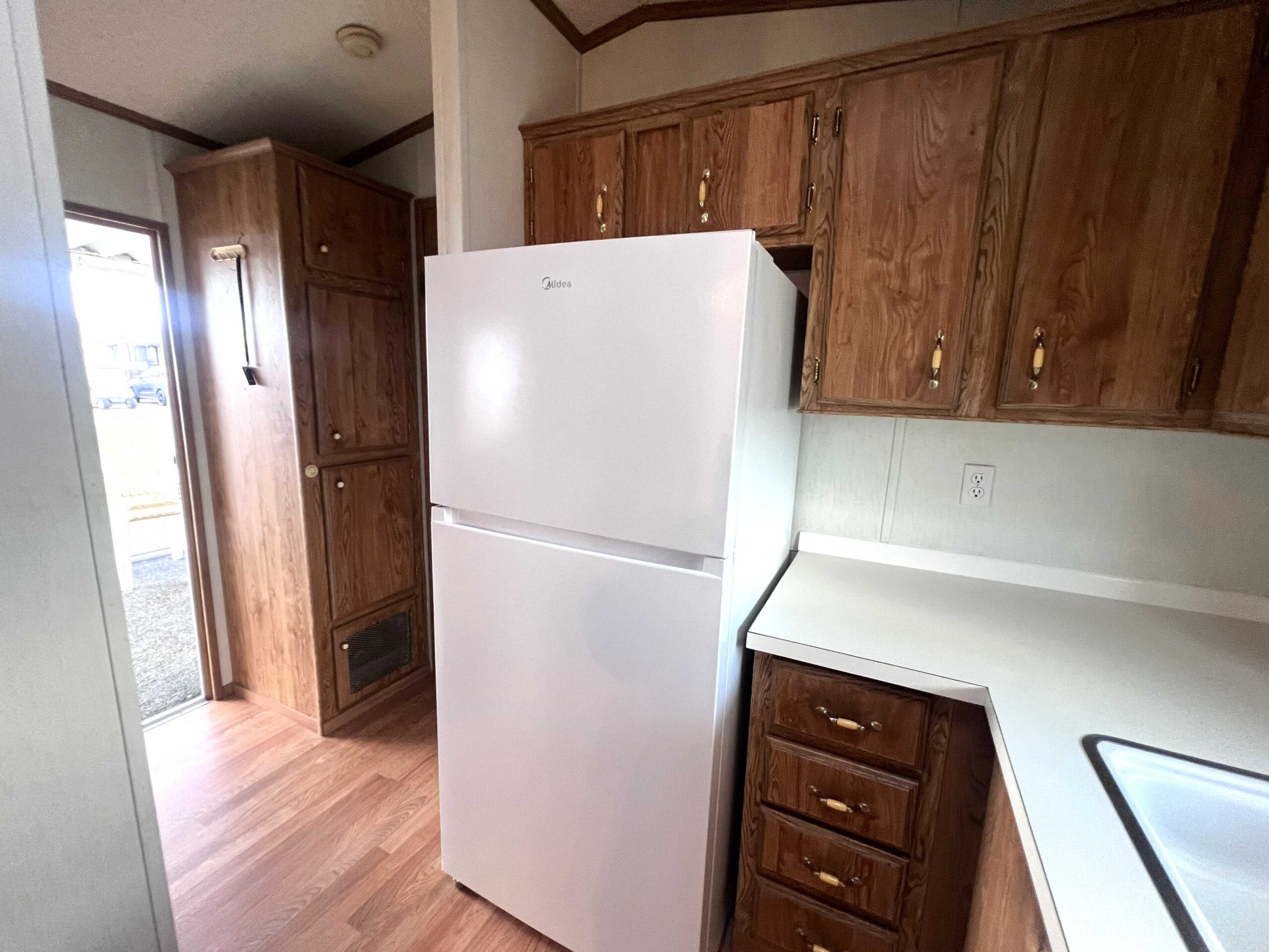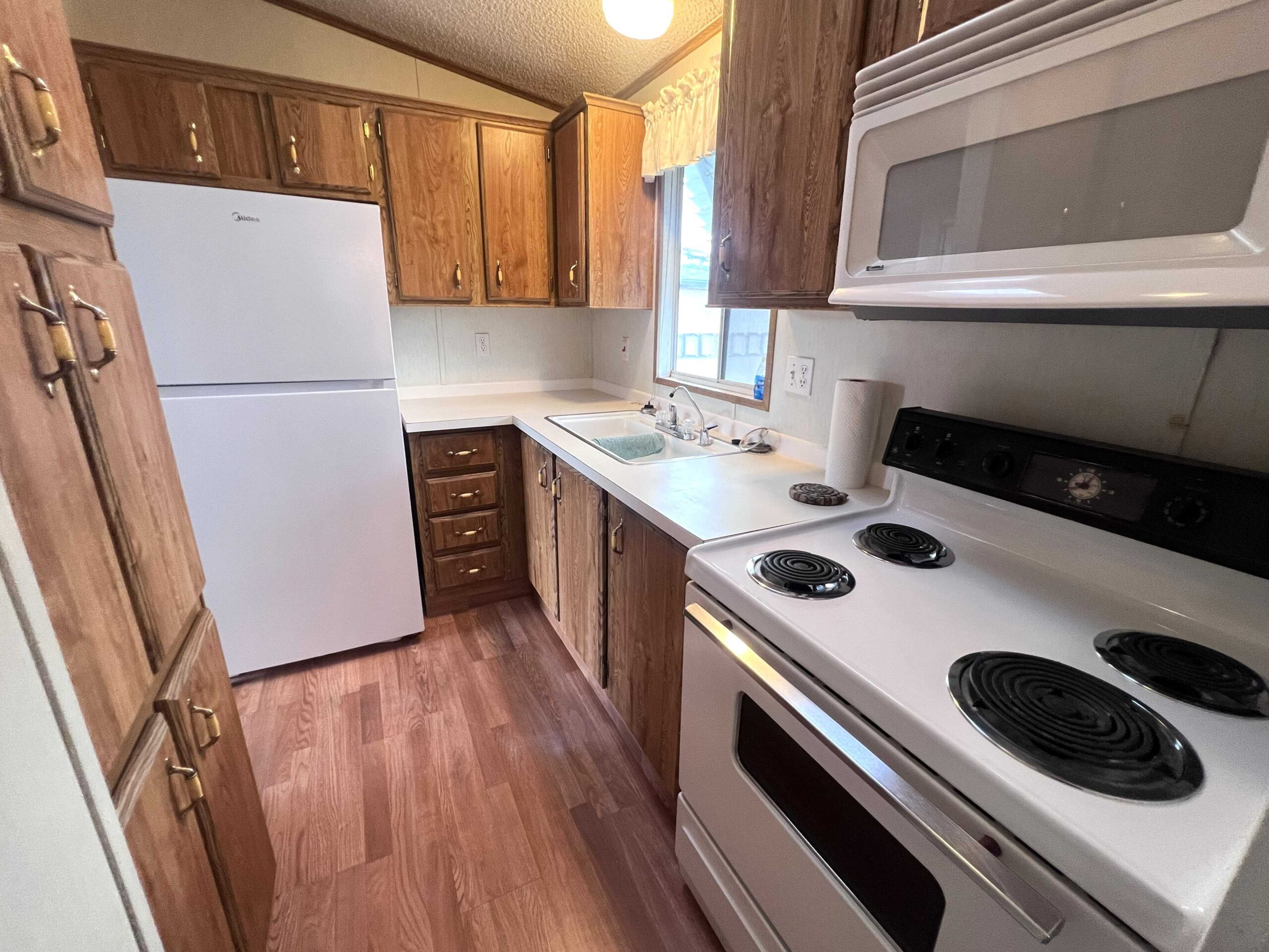 - Hall style kitchen with electric appliances, RO system, microwave, and plenty of cabinets
