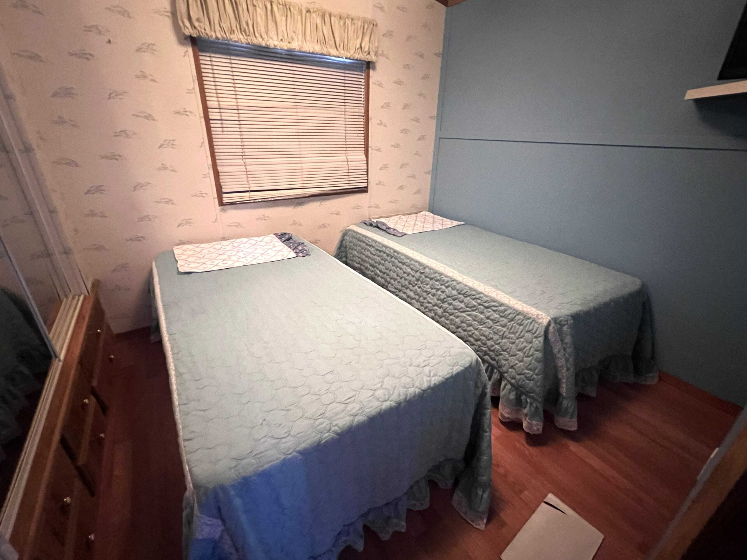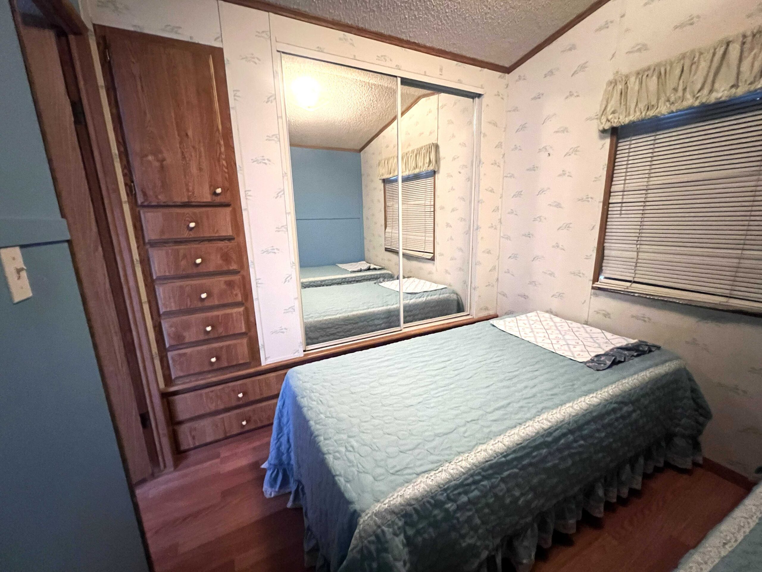 - Cozy bedroom includes roomy closet with mirrored doors and two twin beds that can be replaced for a queen