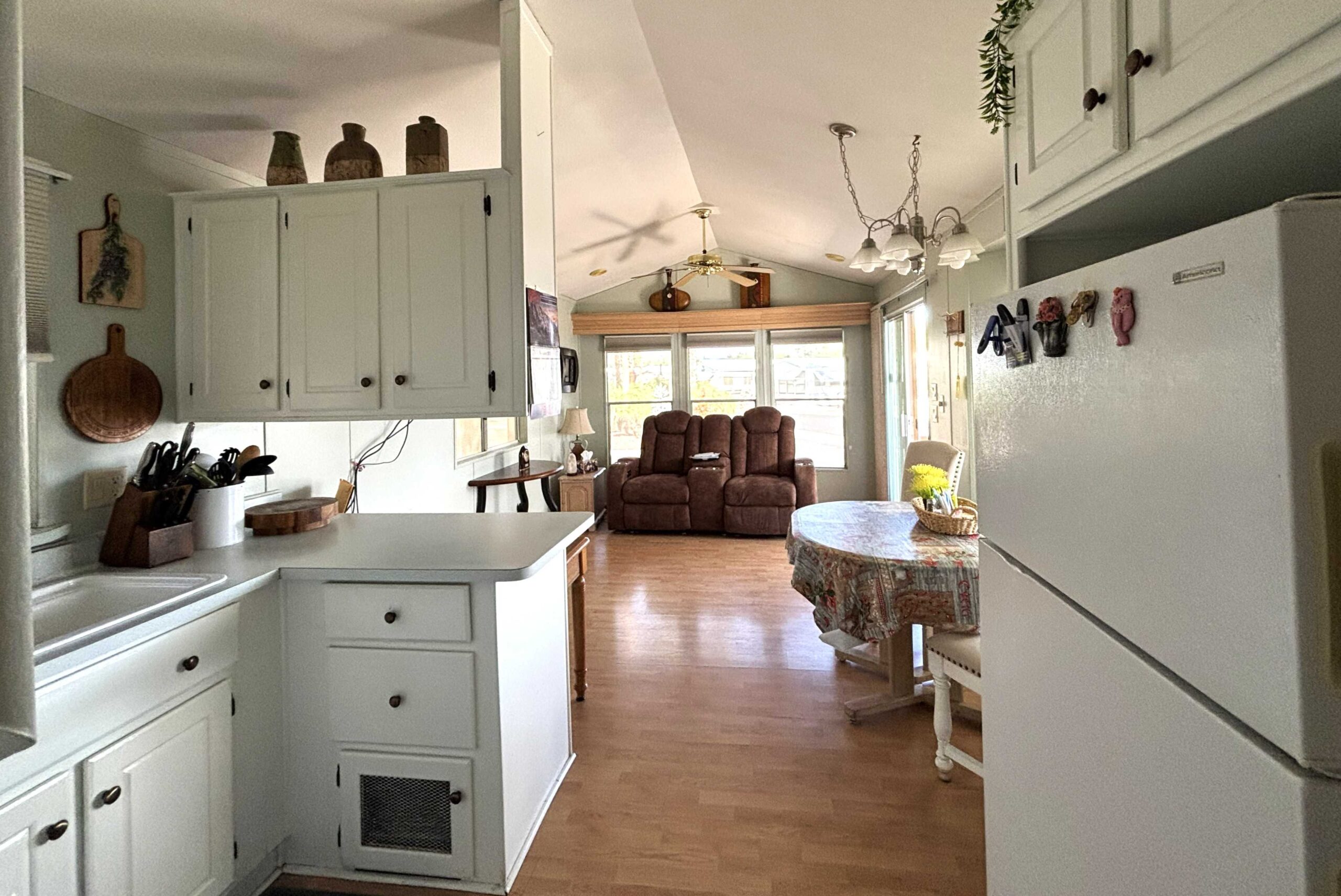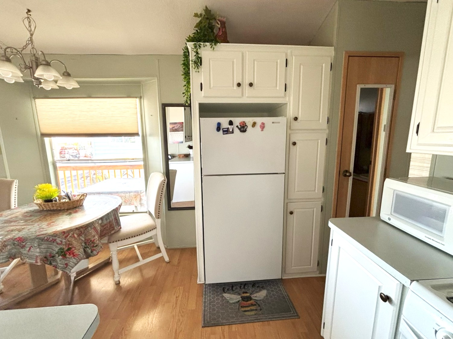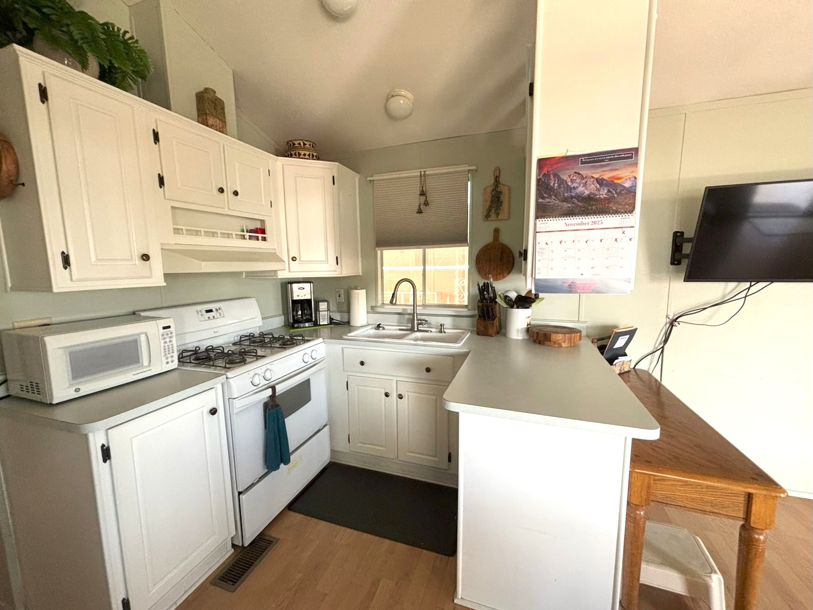 - U shaped kitchen with gas stove, lots of storage, and bay window in dining area
